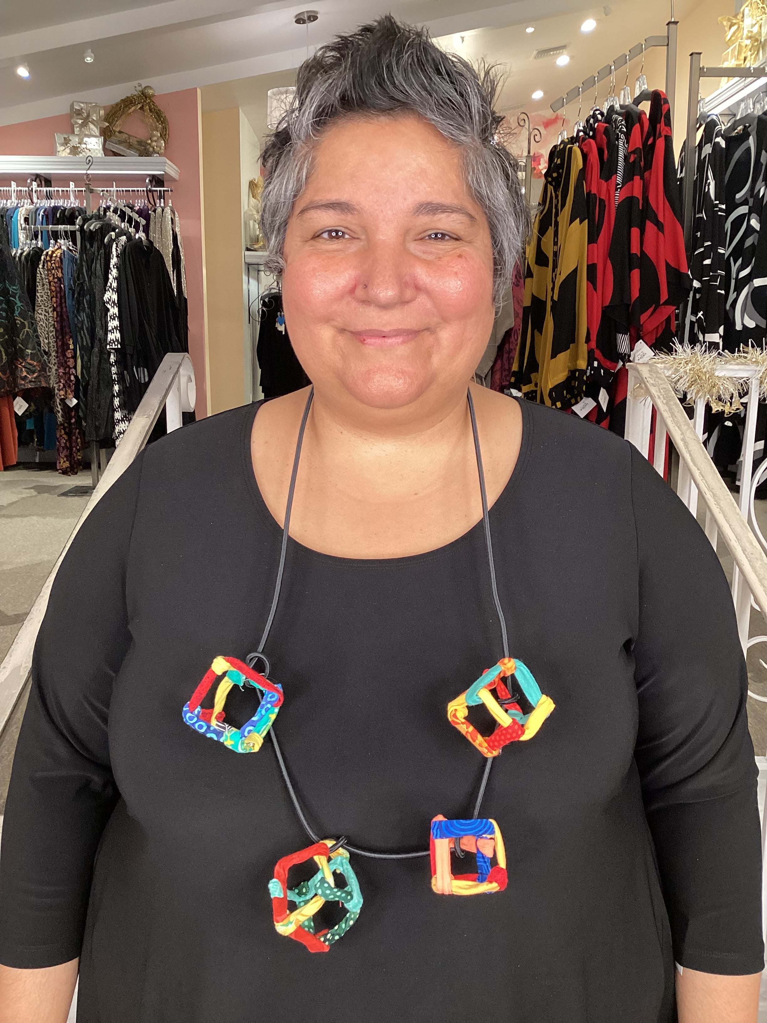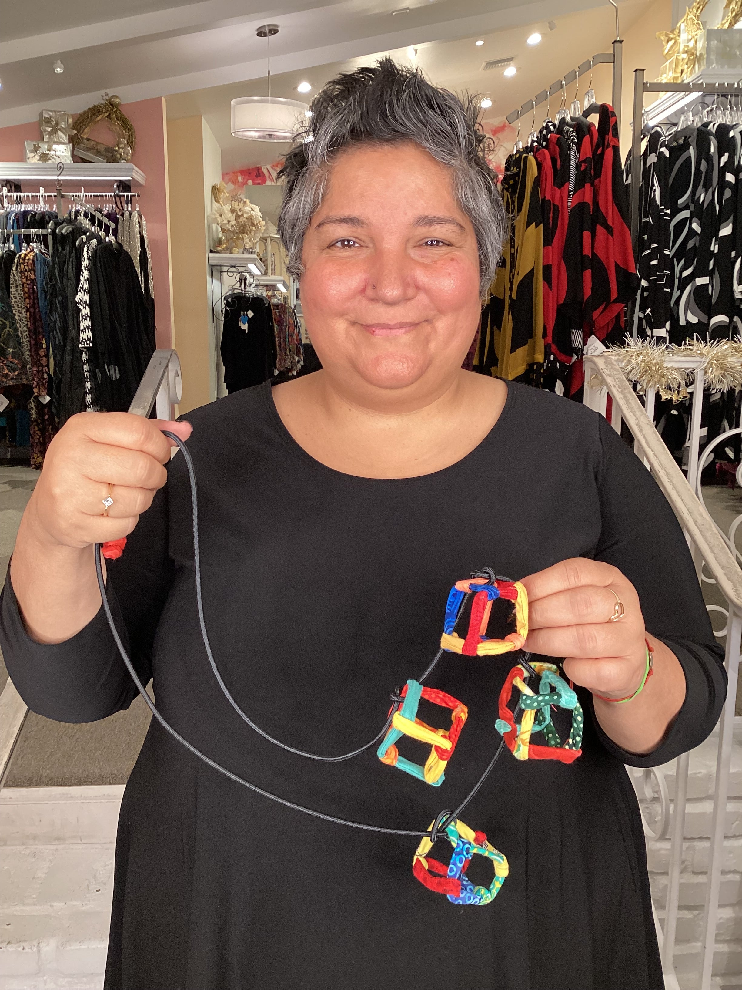 Four angular, dangling boxes are made from four of our wire filled Ficklesticks and tied to black bungee cord. The boxes may be moved around on the cord and the back neck latch is adjustable. Approximately 20″ long, each cube is about 1.5″ wide