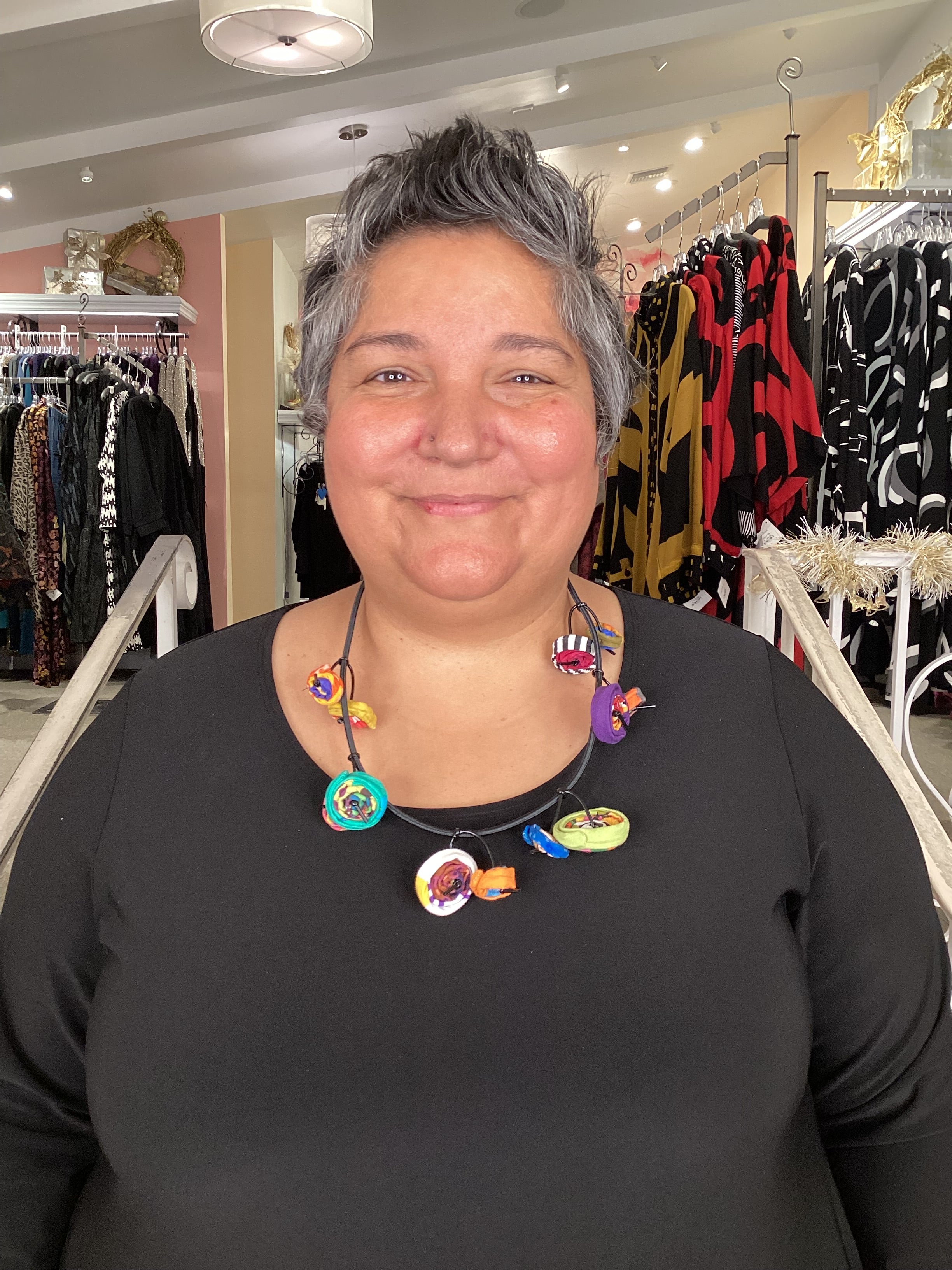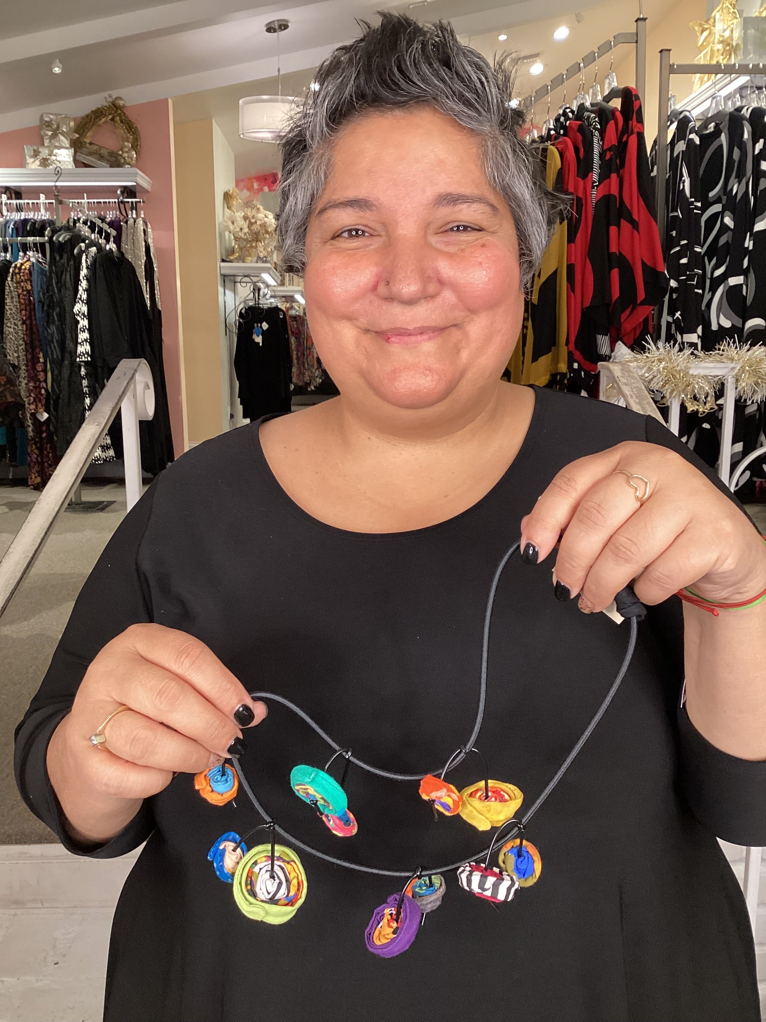 This necklace features twelve Millefiori medallions, large and small, dangling from our house-made bungee cord neck. Bounces as you walk, pairs perfectly with denim. Approximately 25″ circumference.