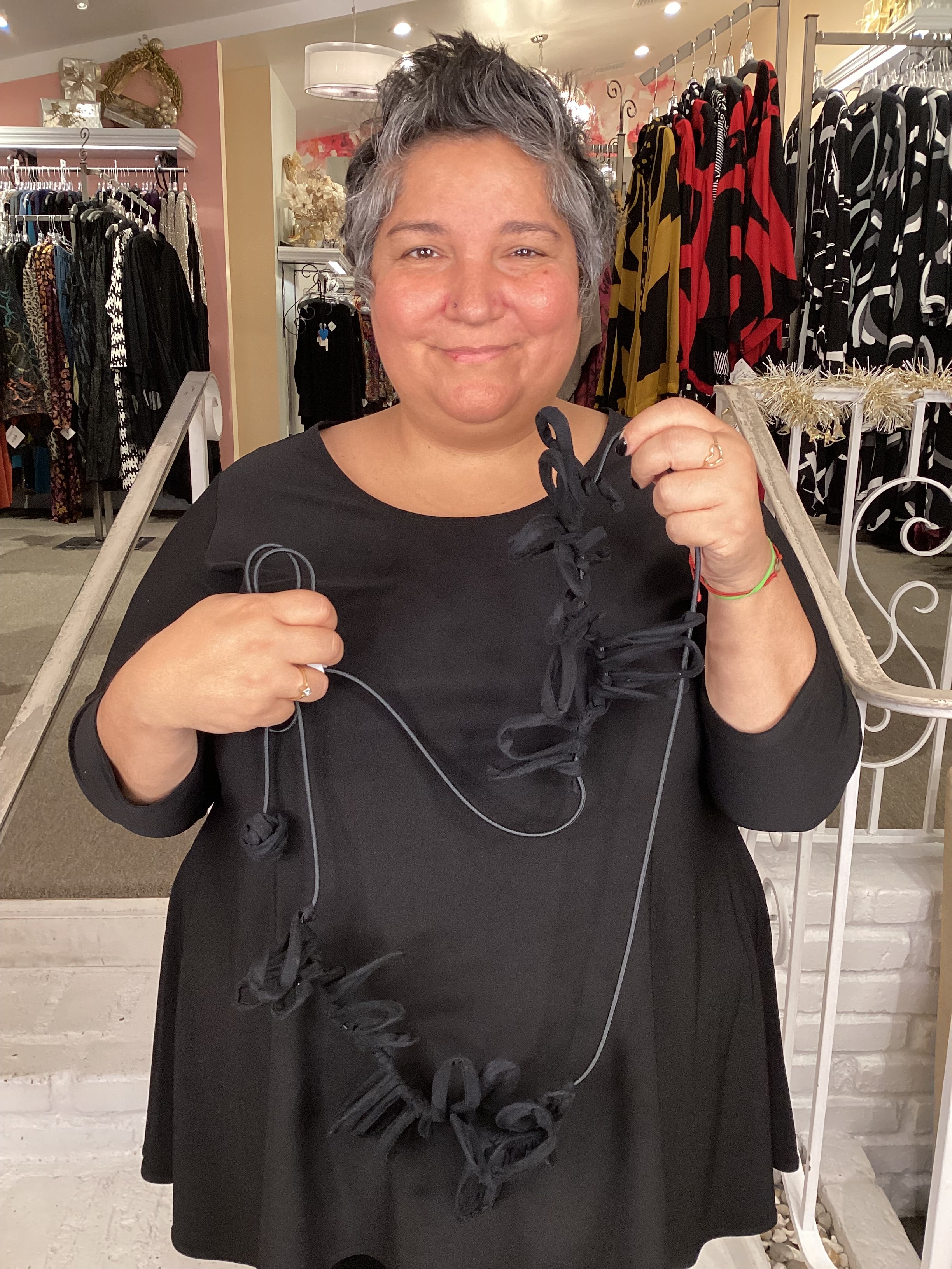 This fiddlehead boa takes a bit of artistic license. You can fiddle with it all types of ways! It can be worn boa-style, with the cord and balls dangling, or doubled around your neck to make it look like a collar! Approximately 7′ long, 3.5′ around the neck.