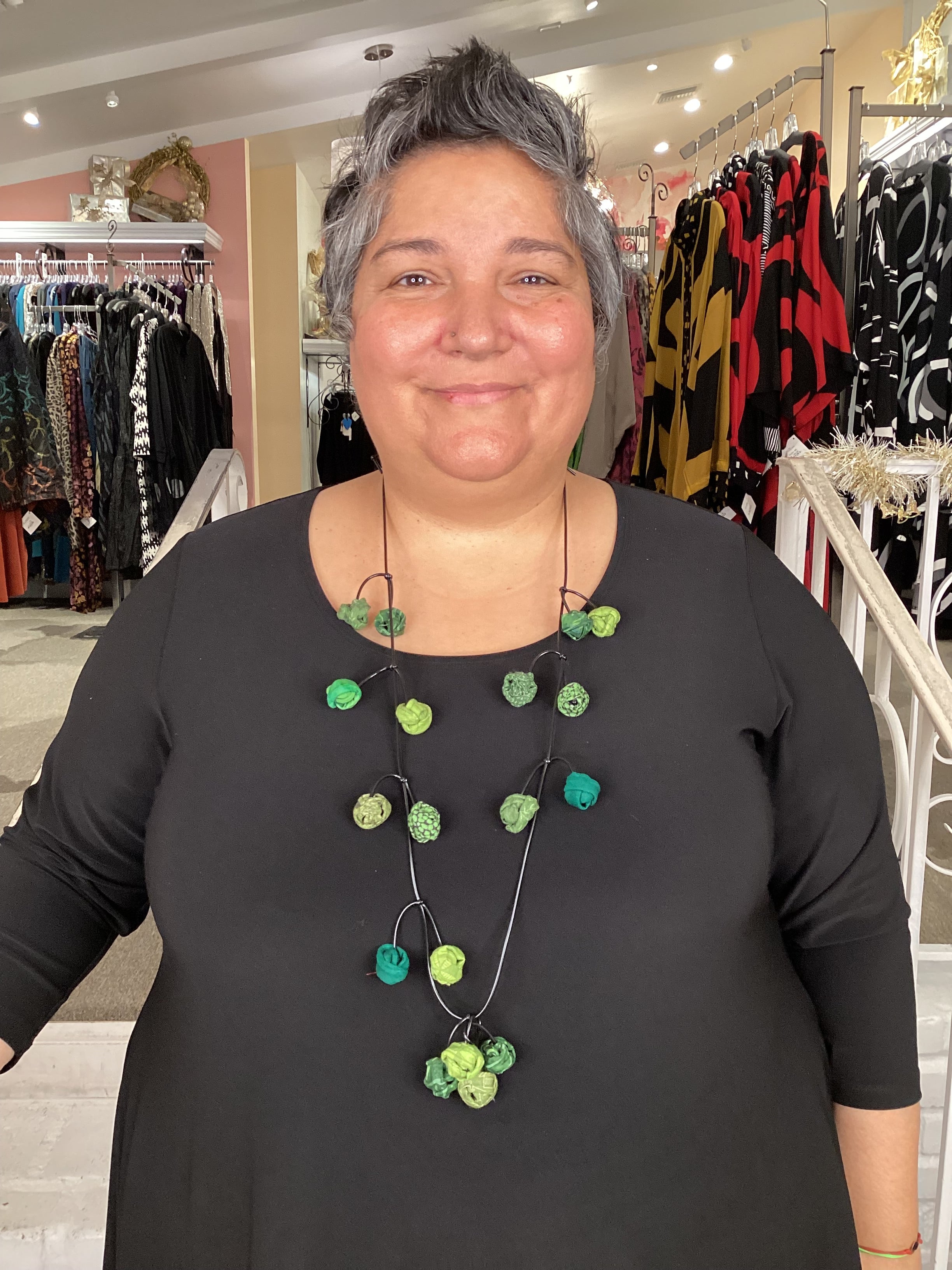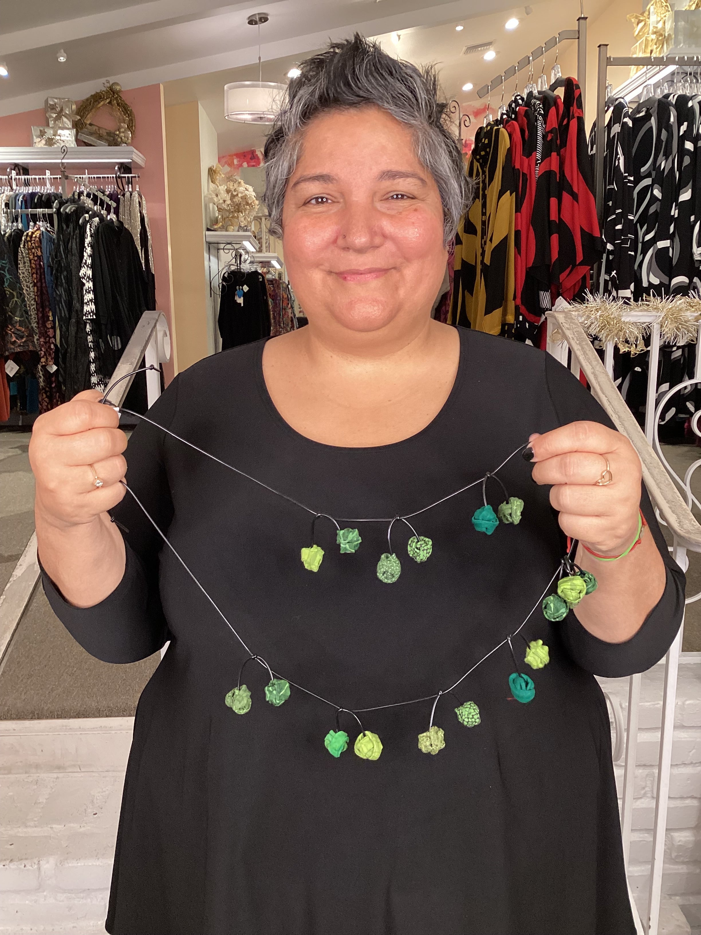 These small gumballs decided to have a little more fun! 18 bouncy ‘cherries’ that are suspended from a black cord. Each fabric ‘cherry’ is held together by the wire inside! This kinetic ‘neck sculpture’ is sure to turn heads. Approximately 18 inch long