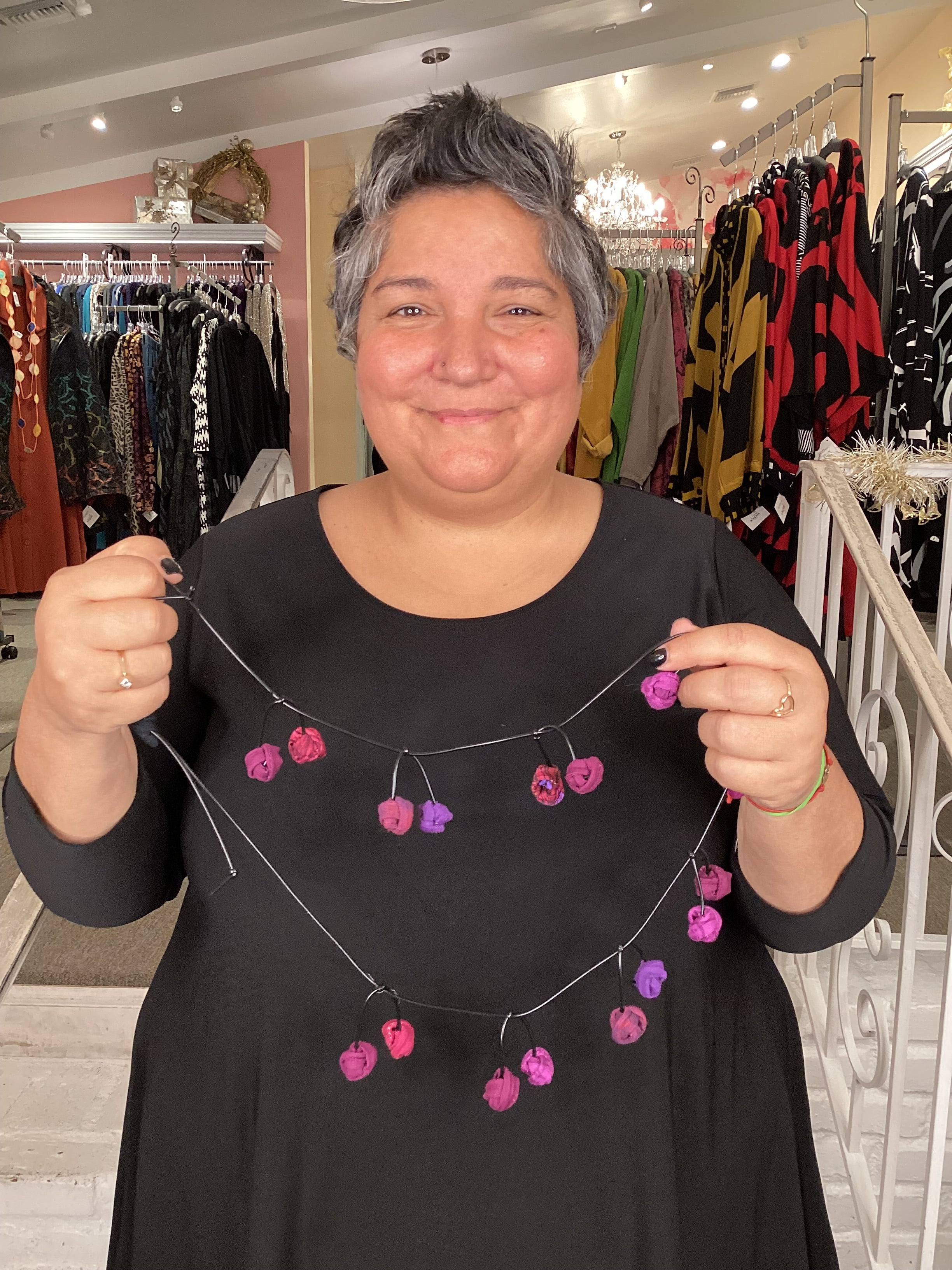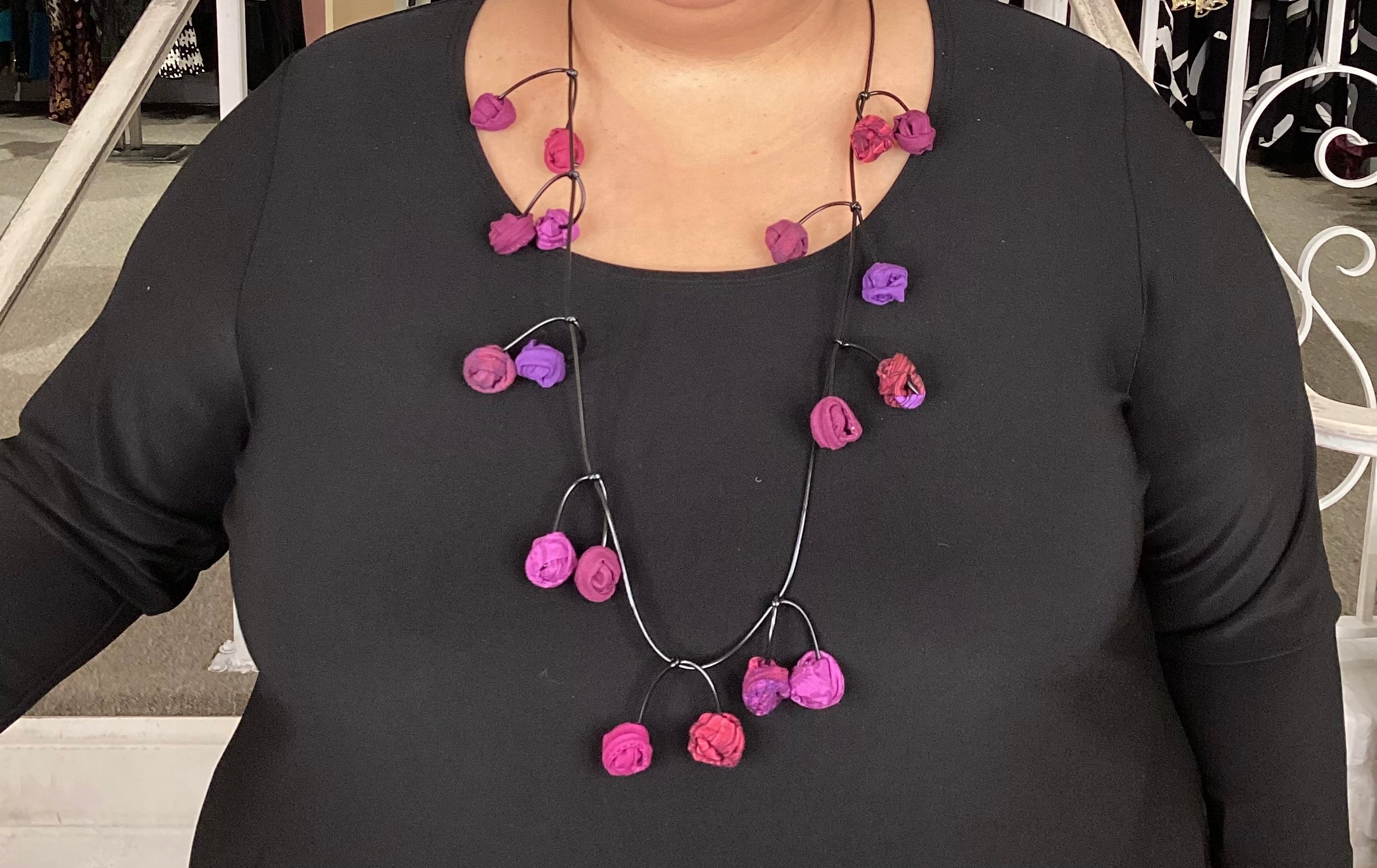 These small gumballs decided to have a little more fun! 18 bouncy ‘cherries’ are suspended from a black cord. Each fabric ‘cherry’ is held together by the wire inside! This kinetic ‘neck sculpture’ is sure to turn heads! Approximately 18 inch long