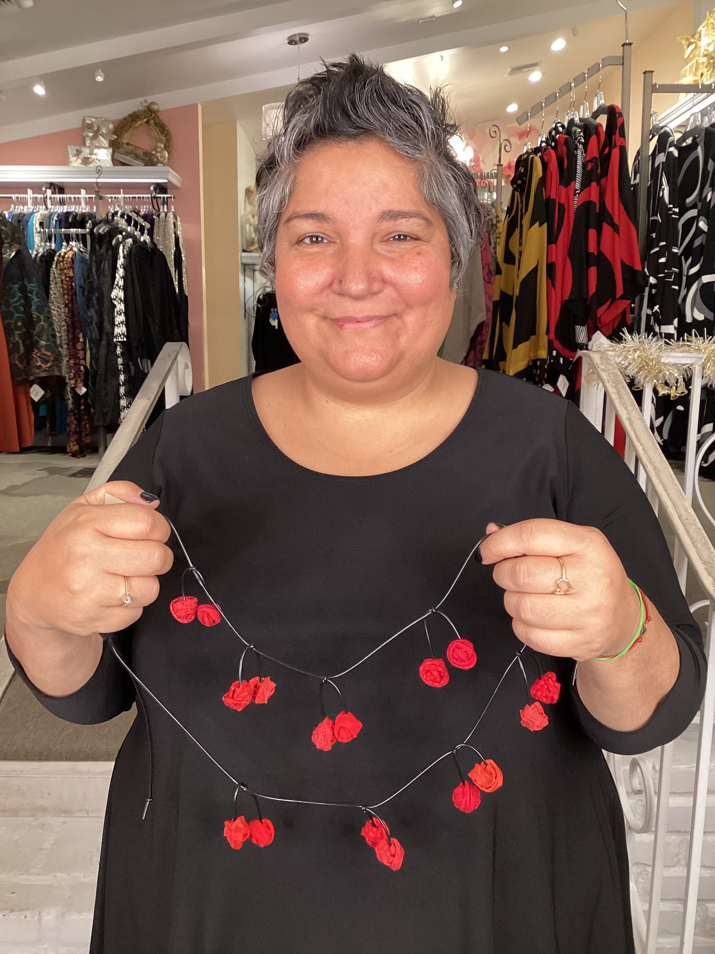 These small gumballs decided to have a little more fun! 18 bouncy ‘cherries’ that are suspended from a black cord. Each fabric ‘cherry’ is held together by the wire inside! This kinetic ‘neck sculpture’ is sure to turn heads! Approximately 18 inch long