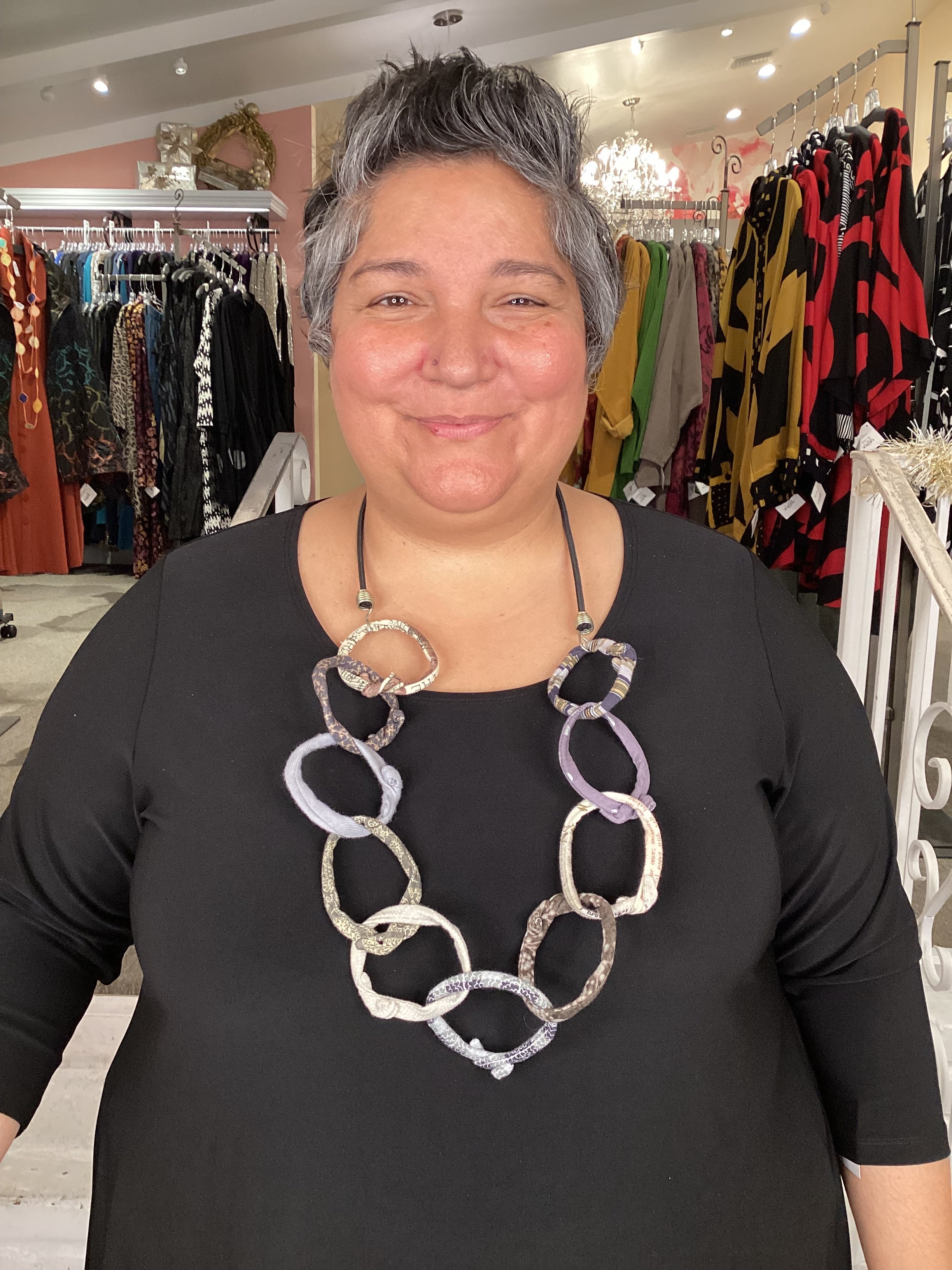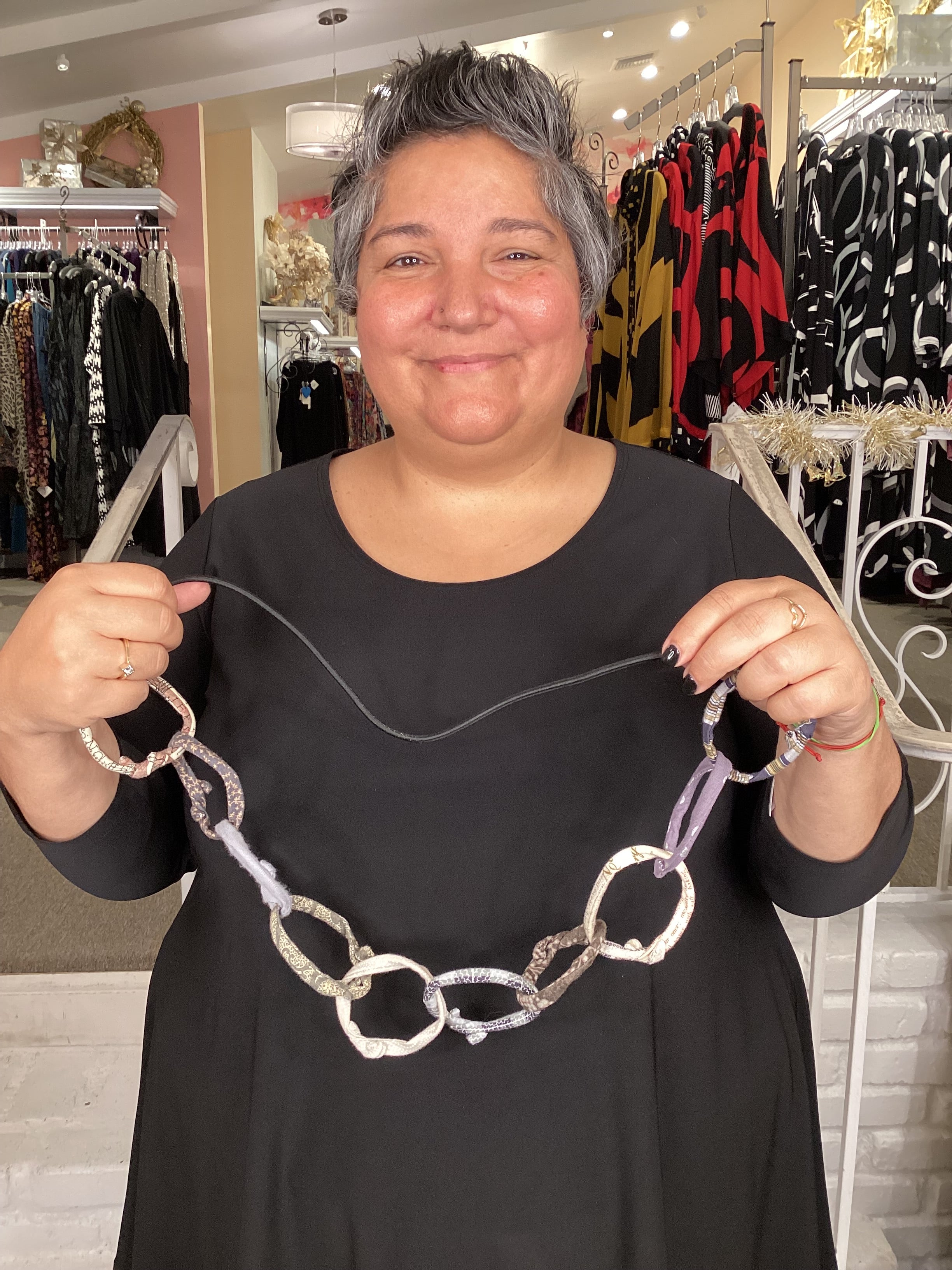 A large chain of 10 Ficklesticks linked together on black bungee cord, this necklace is light-weight and has a lot of movement! Unique neutral greys, approximately 22 in. long (44 in. circumference).