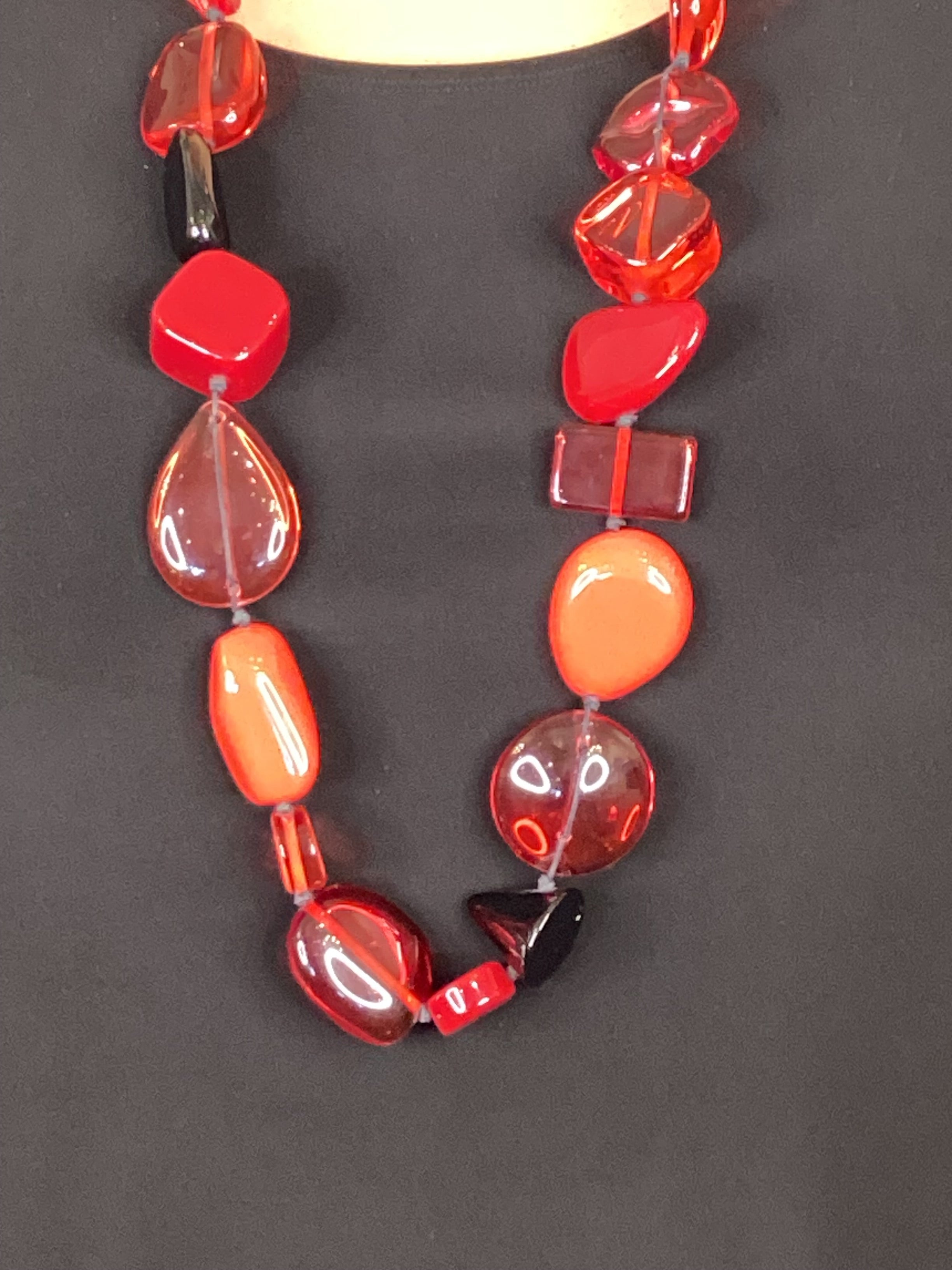 This vibrant red statement necklace features bold geometric shapes cast in smooth resin, showcasing the skilled craftsmanship of Brazilian artisans. A playful pop of color that brings personality to any outfit. Each necklace is a one of a kind. No two are alike so there may be minor differences in selected elements.