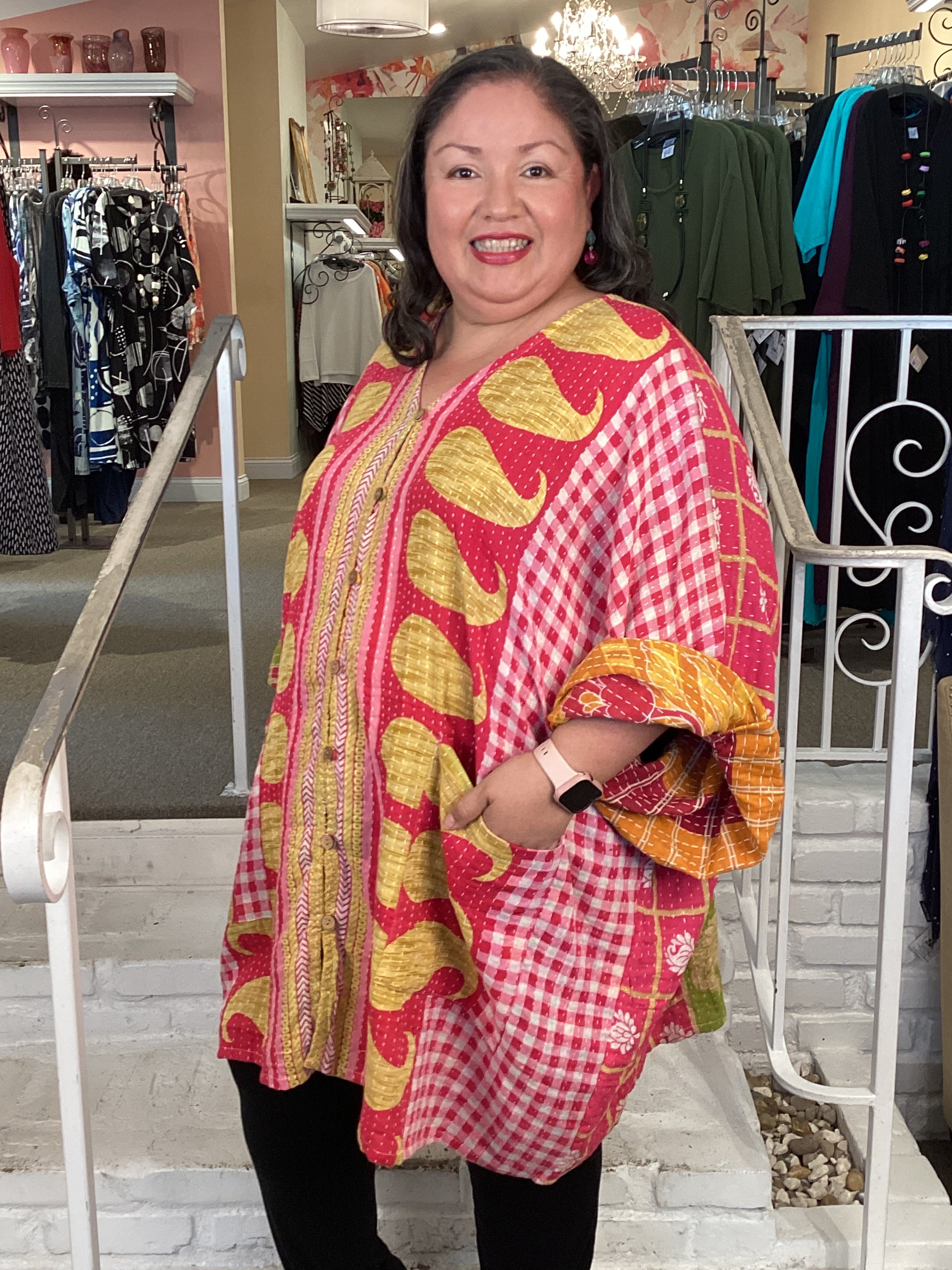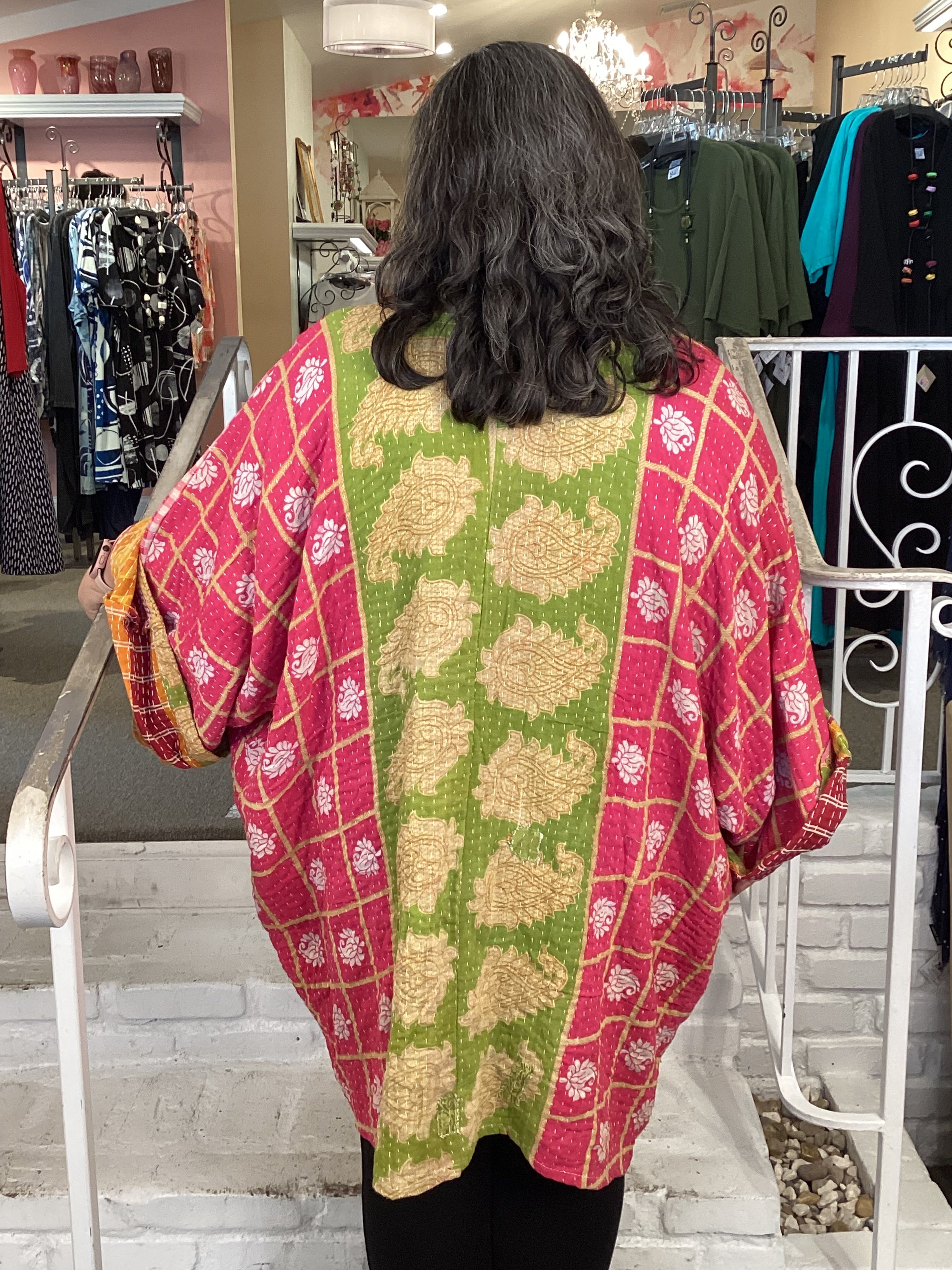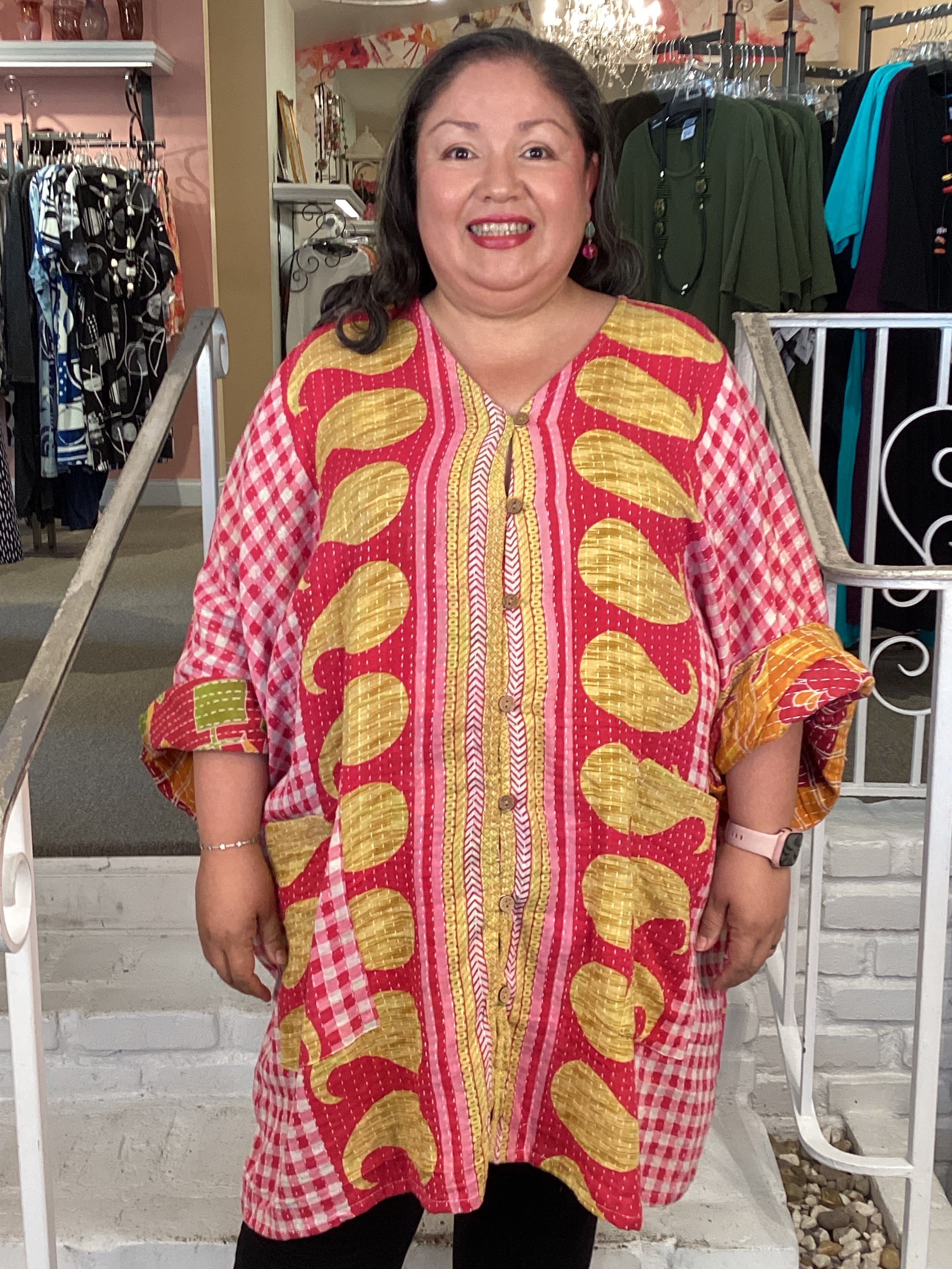 Gaia Button-Down Kimono in ultra lux Kantha stitched cotton sari fabric. Features full button-down front and two slouchy pockets for effortless style. This flowy wonder drapes beautifully for a relaxed, versatile look. Crafted from vintage saris that have lived a full life before becoming our designs. Each piece is sewn together to extend durability and celebrate sustainable fashion. Please note: fabrics may show small threads, holes in layers, color inconsistency, or minor stains—these are marks of character and authenticity.
