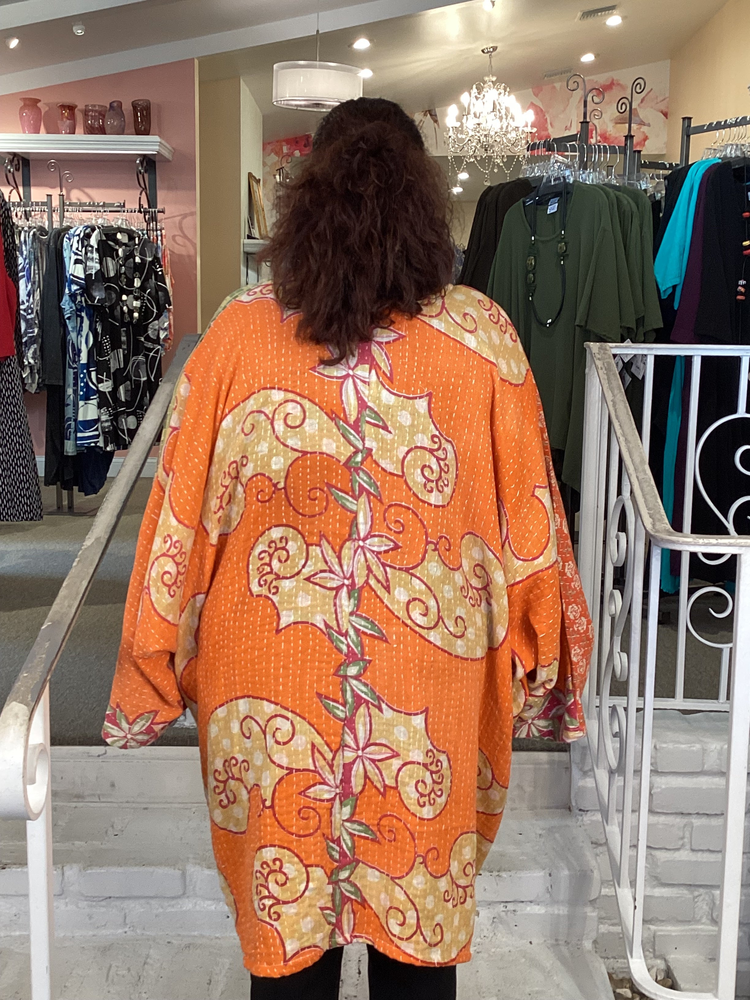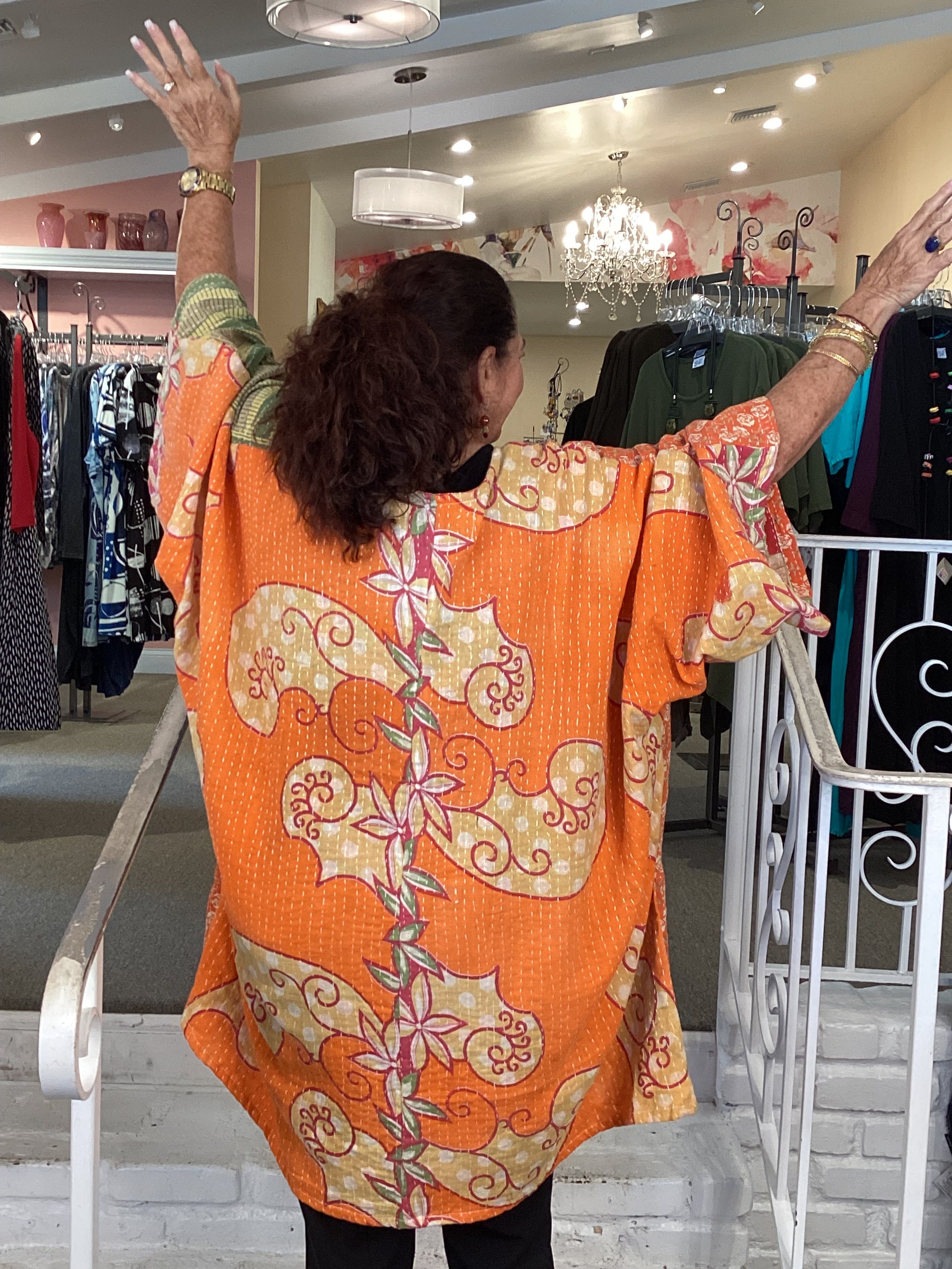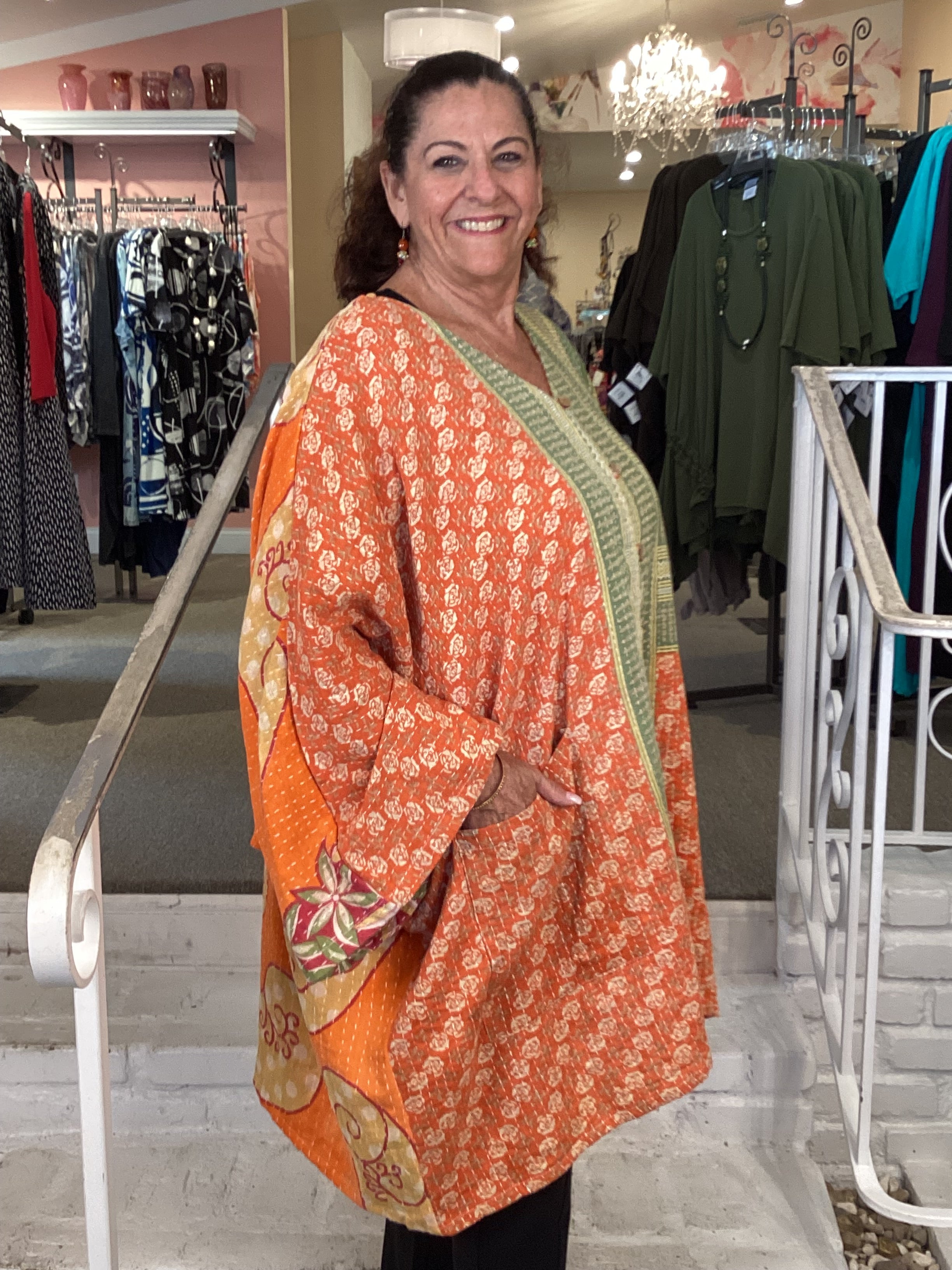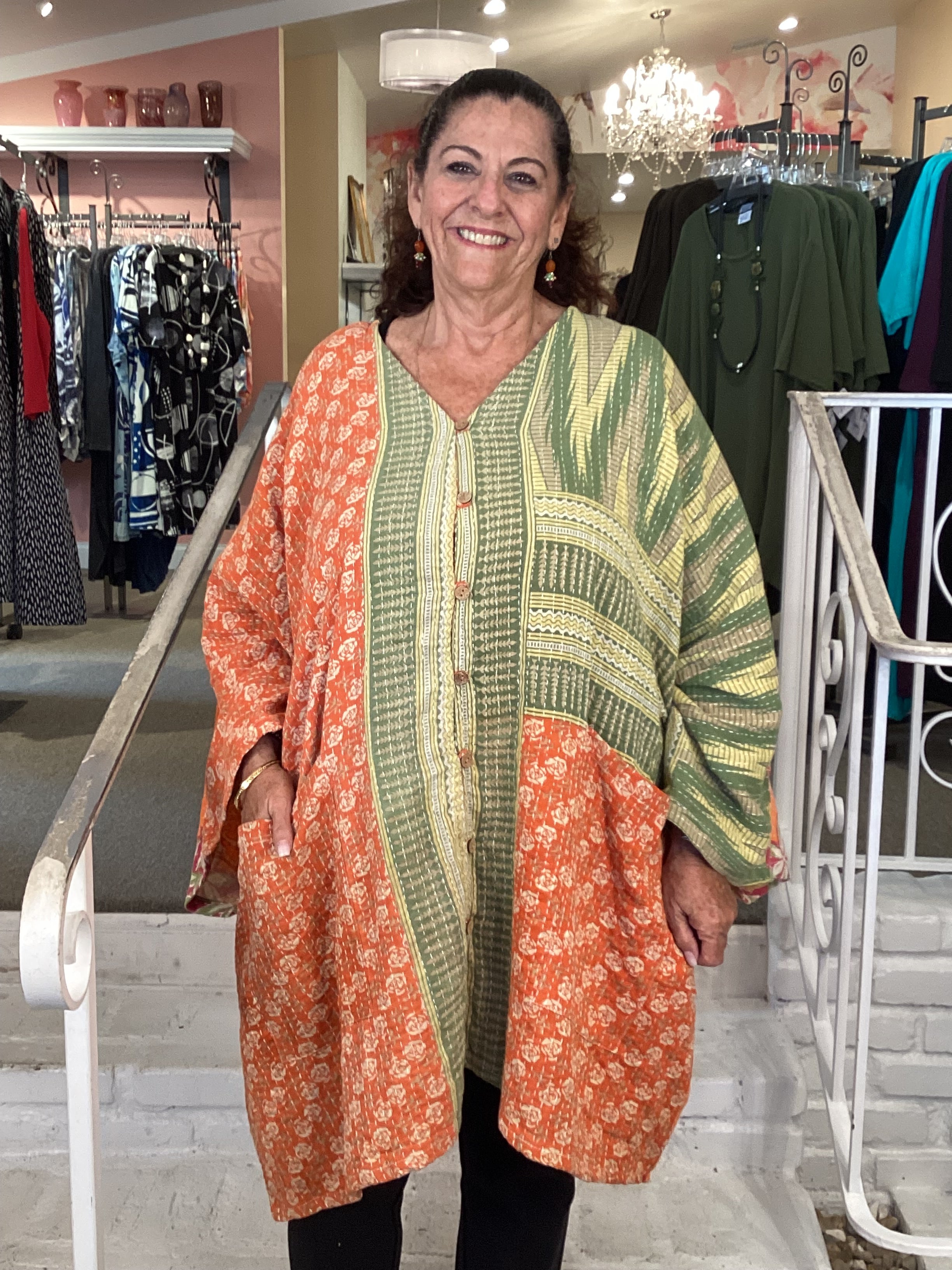 Gaia Button-Down Kimono in ultra lux Kantha stitched cotton sari fabric. Features full button-down front and two slouchy pockets for effortless style. This flowy wonder drapes beautifully for a relaxed, versatile look. Crafted from vintage saris that have lived a full life before becoming our designs. Each piece is sewn together to extend durability and celebrate sustainable fashion. Please note: fabrics may show small threads, holes in layers, color inconsistency, or minor stains—these are marks of character and authenticity.