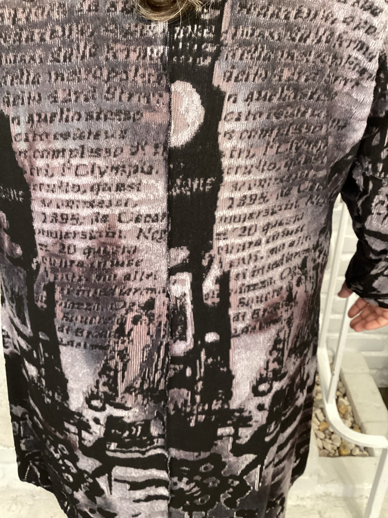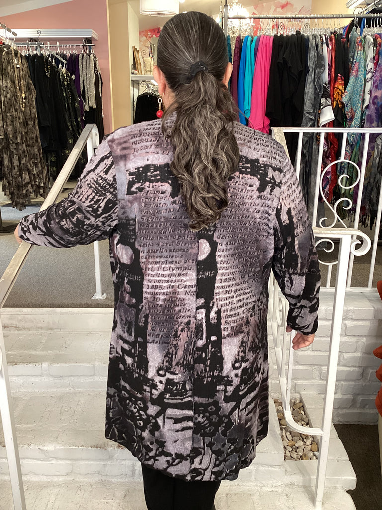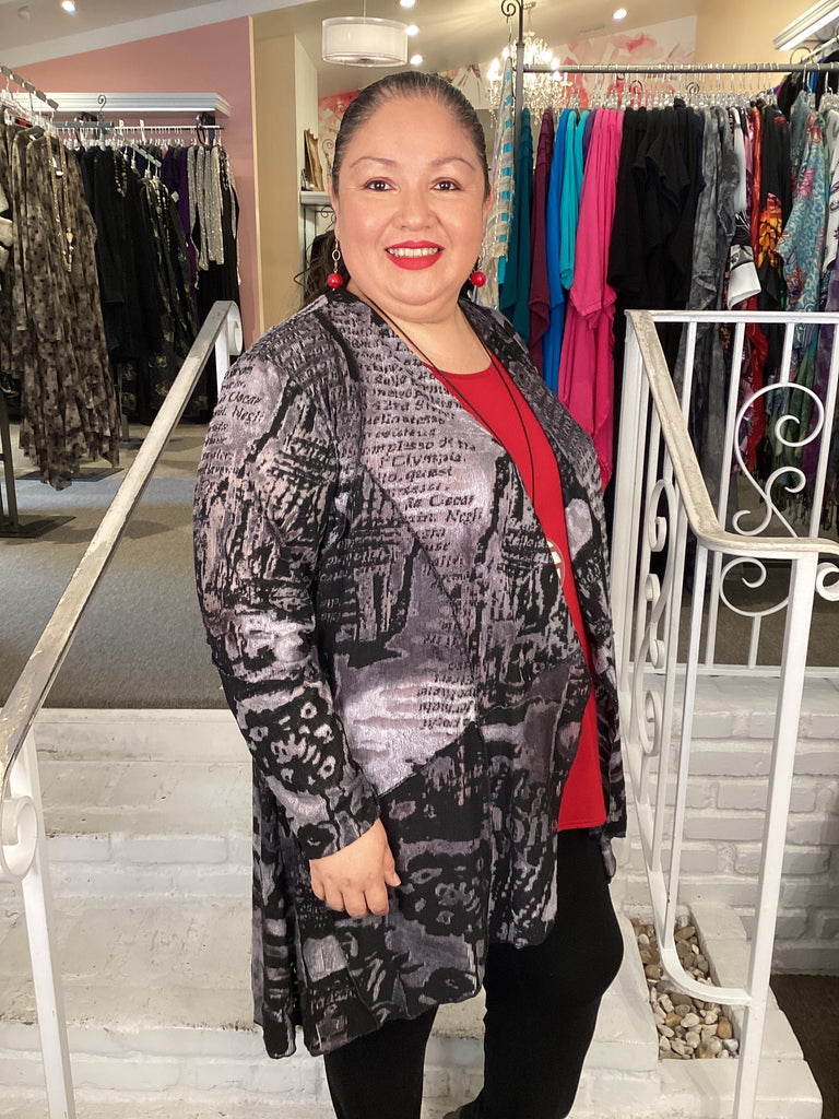 A semi sheer, textured burn out knit jacket....perfect for layering this fall. Front panels and sleeves are comprised of stitched together patches and the back panel is center seamed. Multiple grey and black patterns. Our model is 1X/2X. 48" bust, 30" front length, 38" back length.