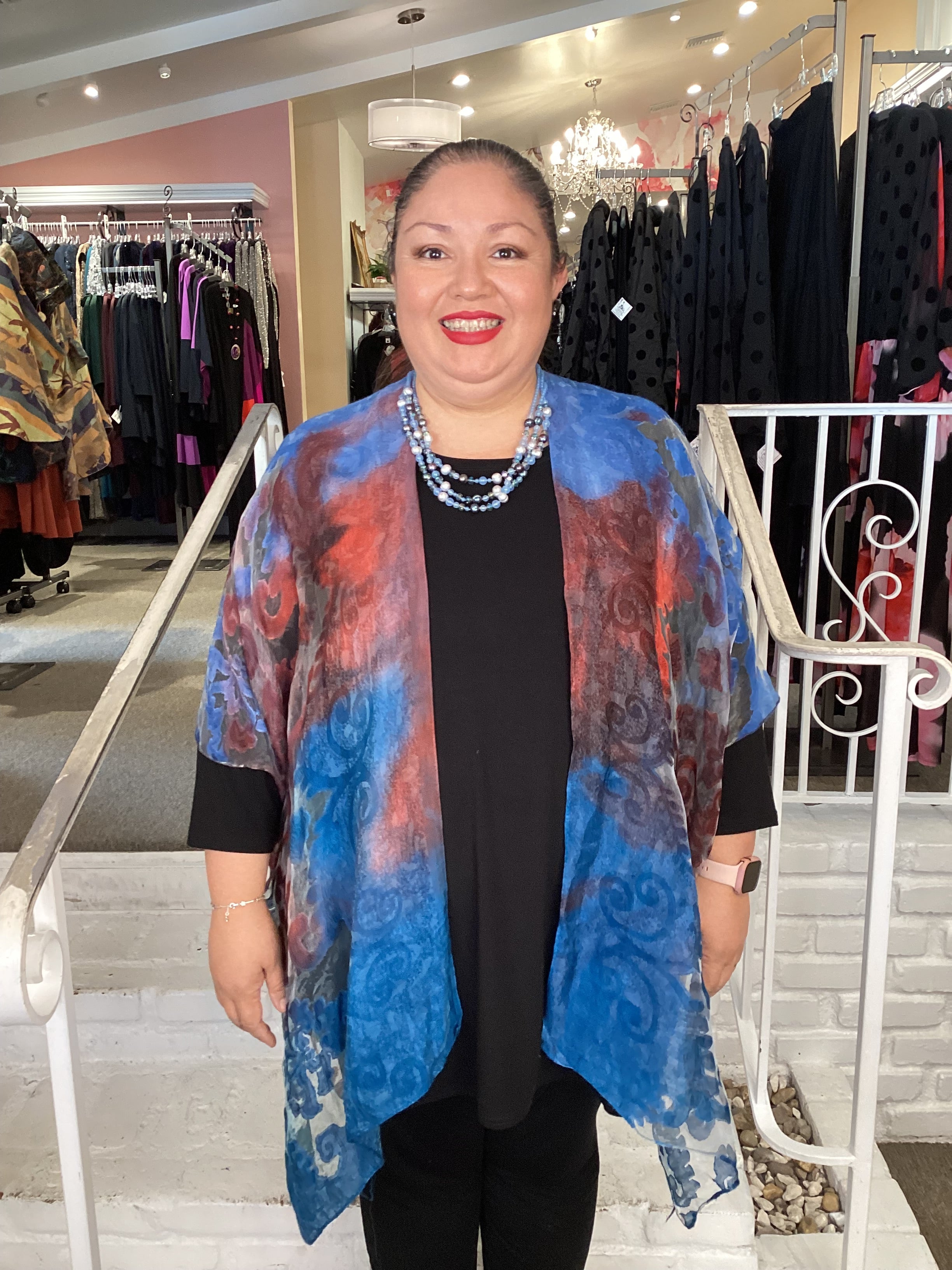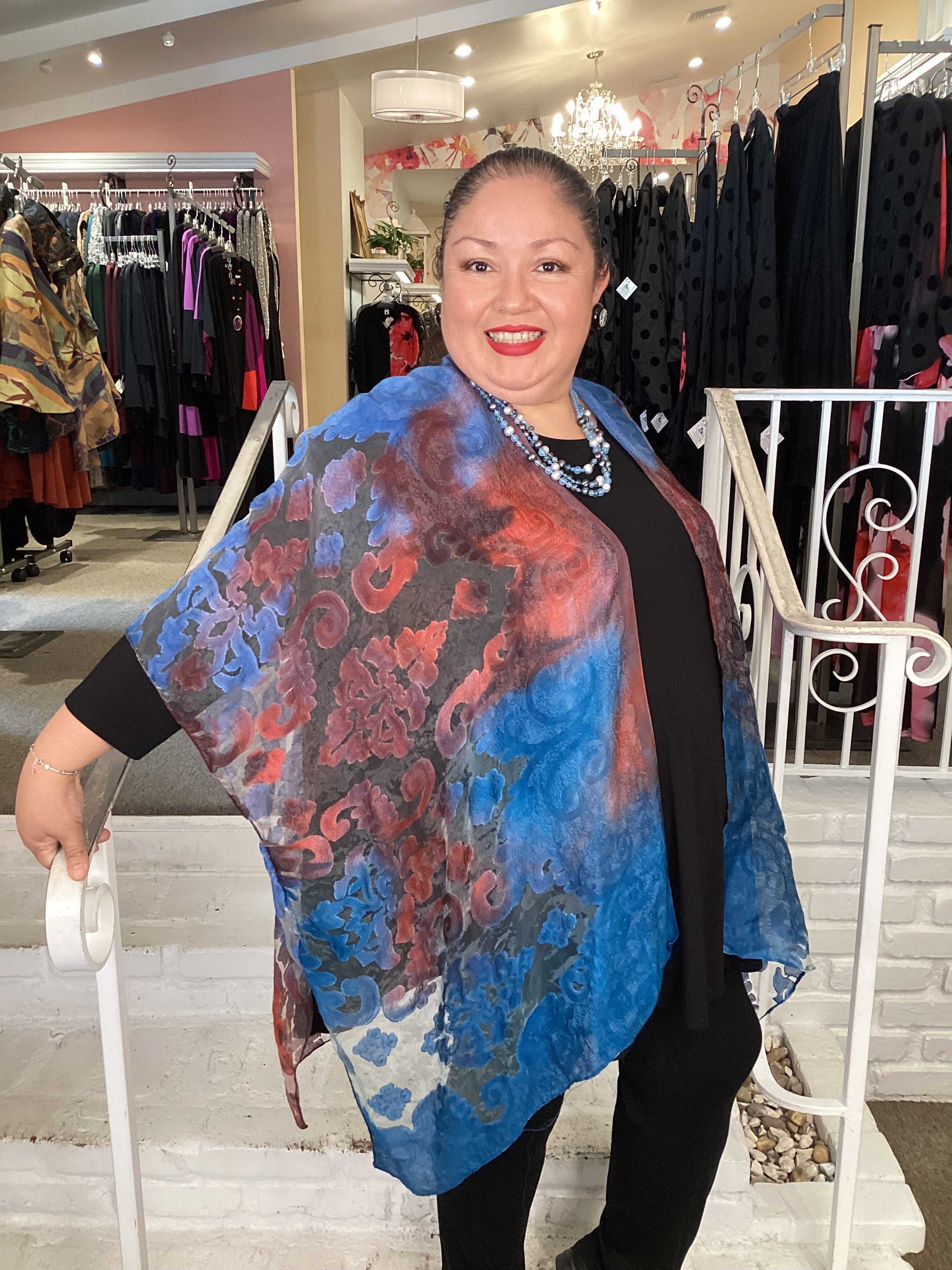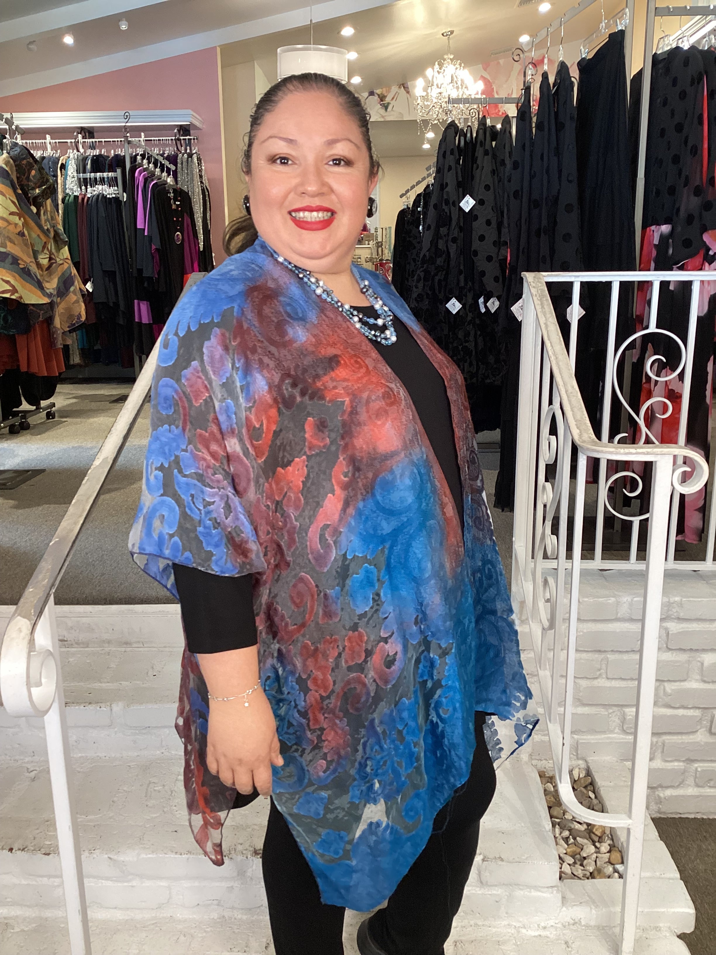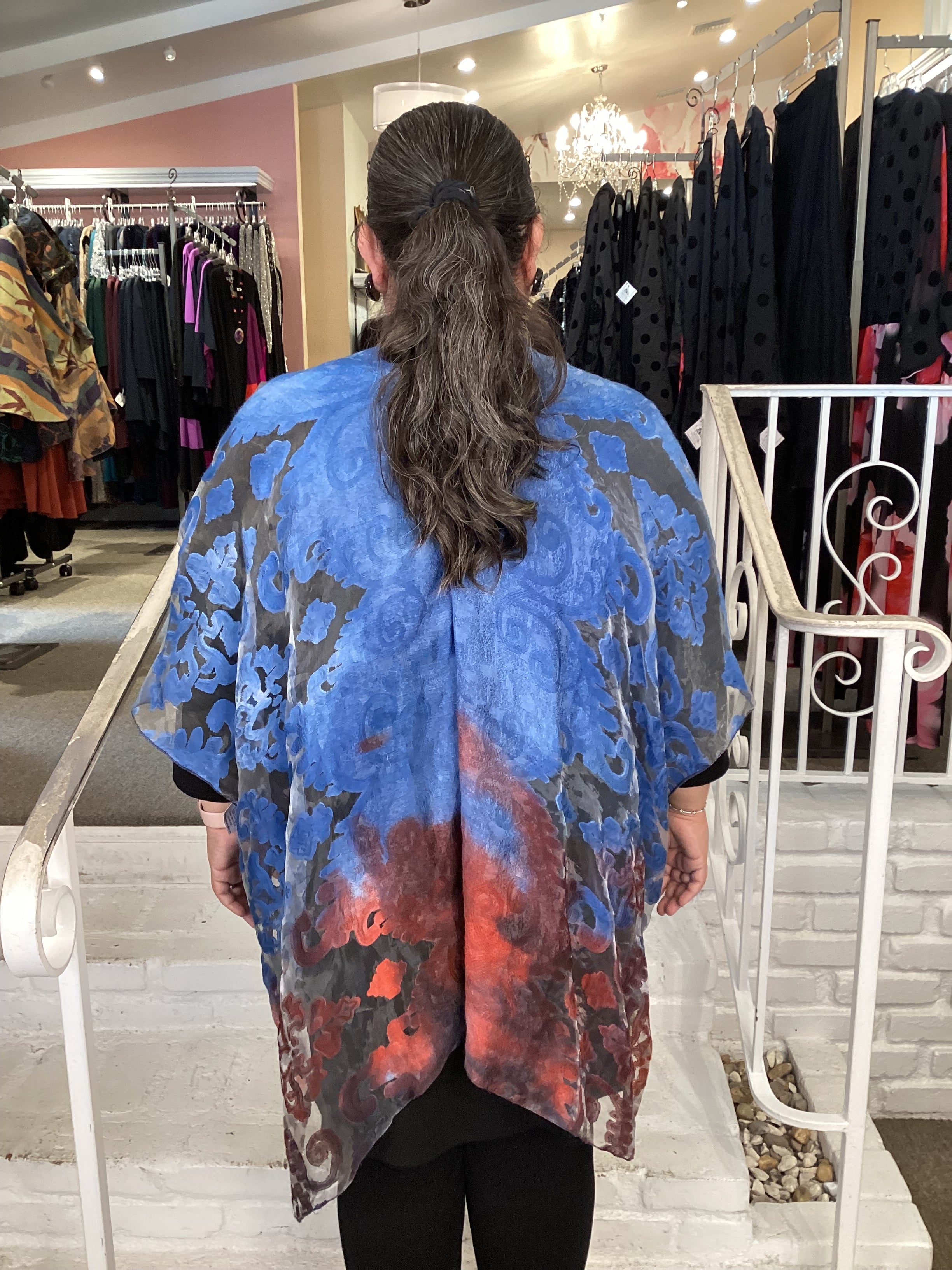 This playful kimono duster from Spain in America features stunning hand-dyed burnout fabrics in a rainbow of colors. Designed as a one-size, one-of-a-kind statement piece, it drapes beautifully on plus-size women. The flowing length falls anywhere from below the knees to midcalf depending on your height—making it a fun and dramatic addition to your wardrobe. These wonderful pieces fit up to size 4X.