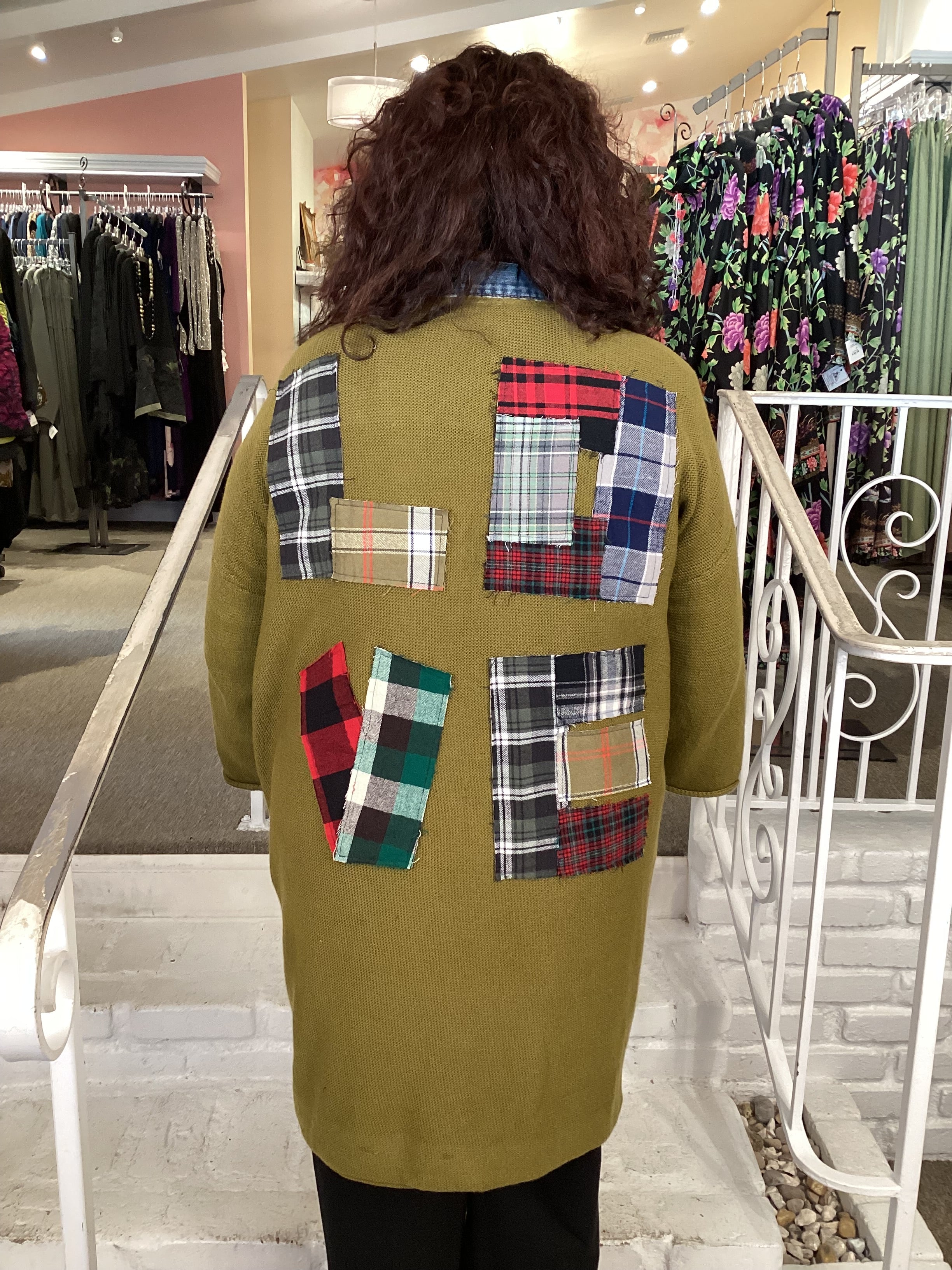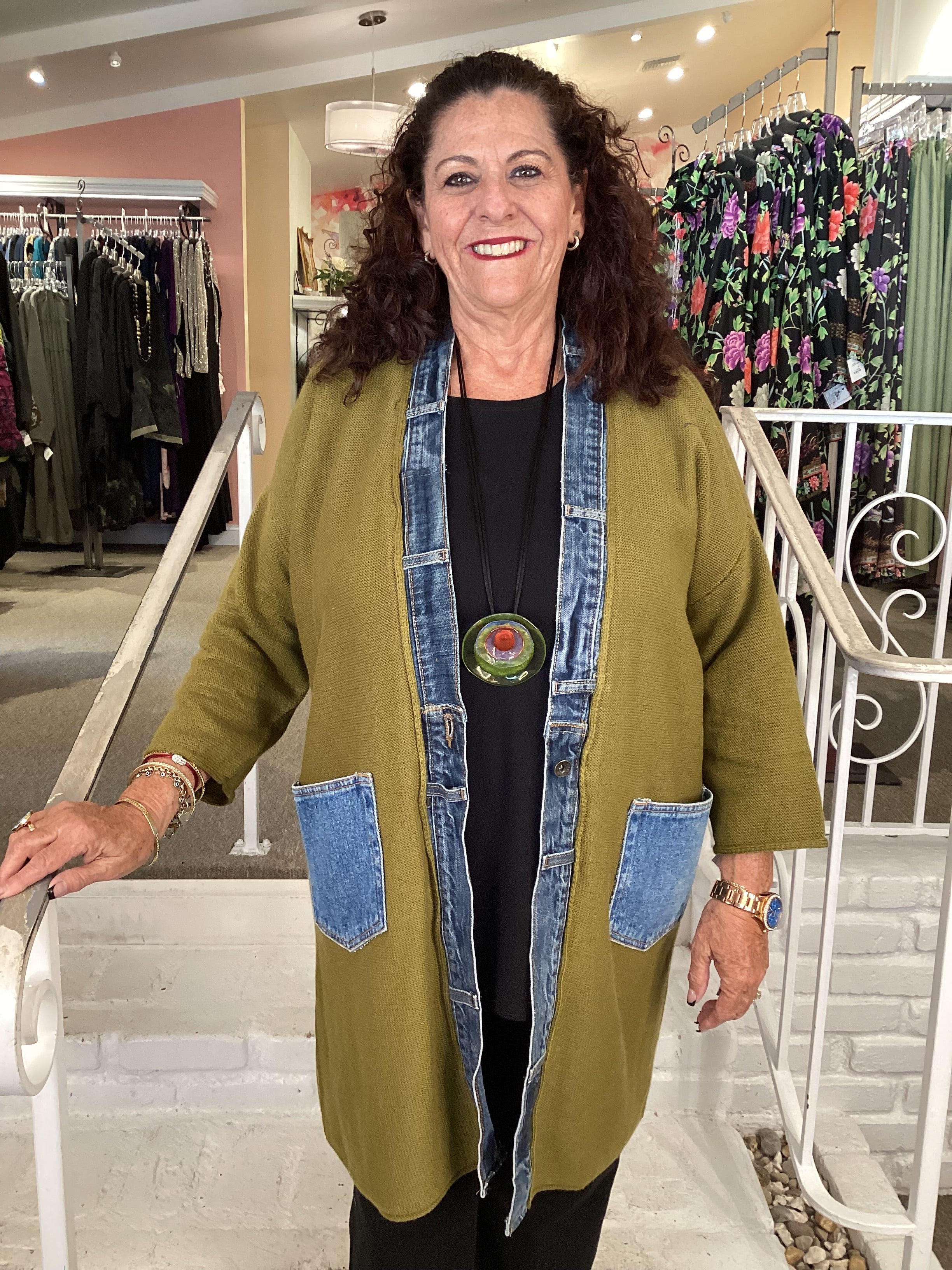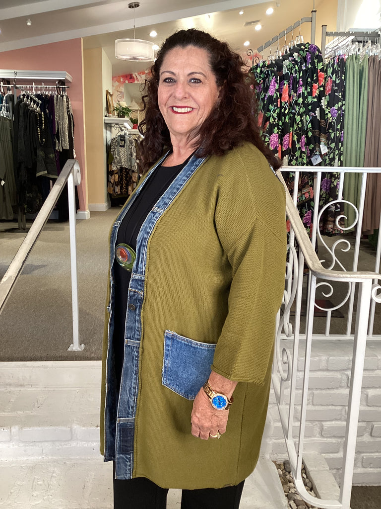 Add a pop of color to your wardrobe with the Passion Cardigan. Crafted from cotton, this versatile piece features striking denim lapels and two functional front pockets that deliver unexpected visual interest. The back showcases a distinctive "love" patchwork detail that elevates any casual or dressy ensemble. Layer it over your favorite outfits for effortless style with personality.