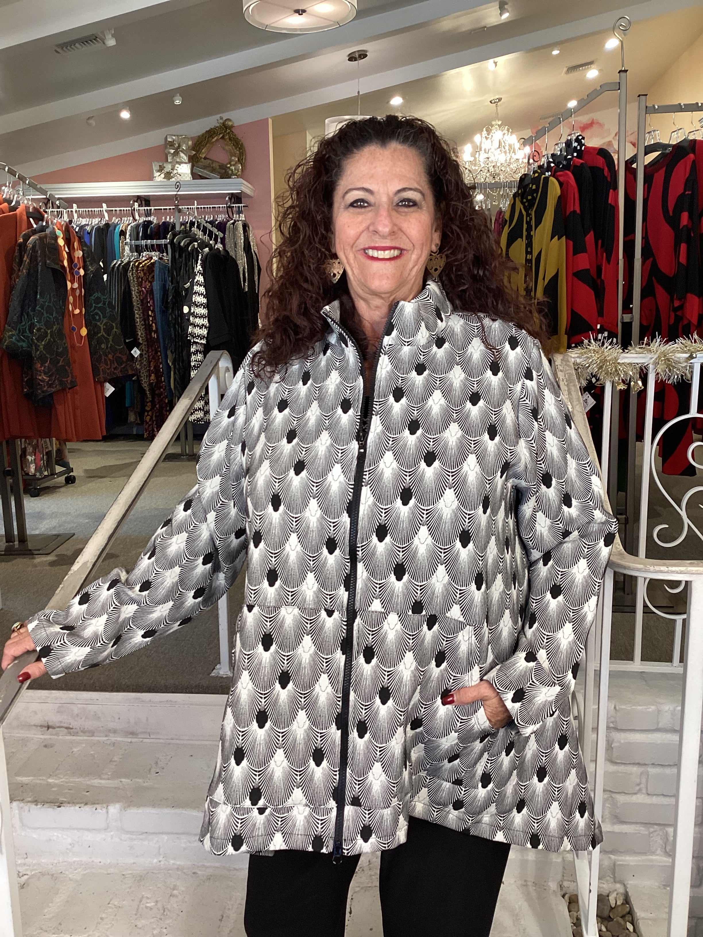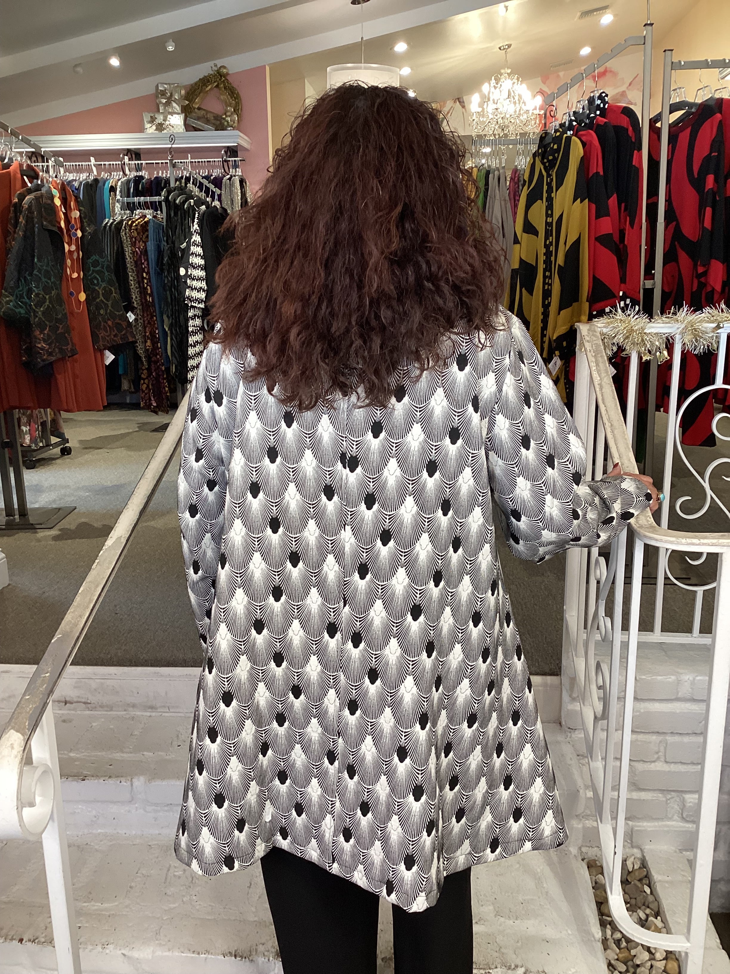This is a great jacket for fall!! The textured jacquard fabric is light weight and a multi color pattern on black, very unique and stylish. The zipper front jacket has a stand up or fold back collar and kangaroo pockets with a very generous a-line silhouette and a high/low hemline.