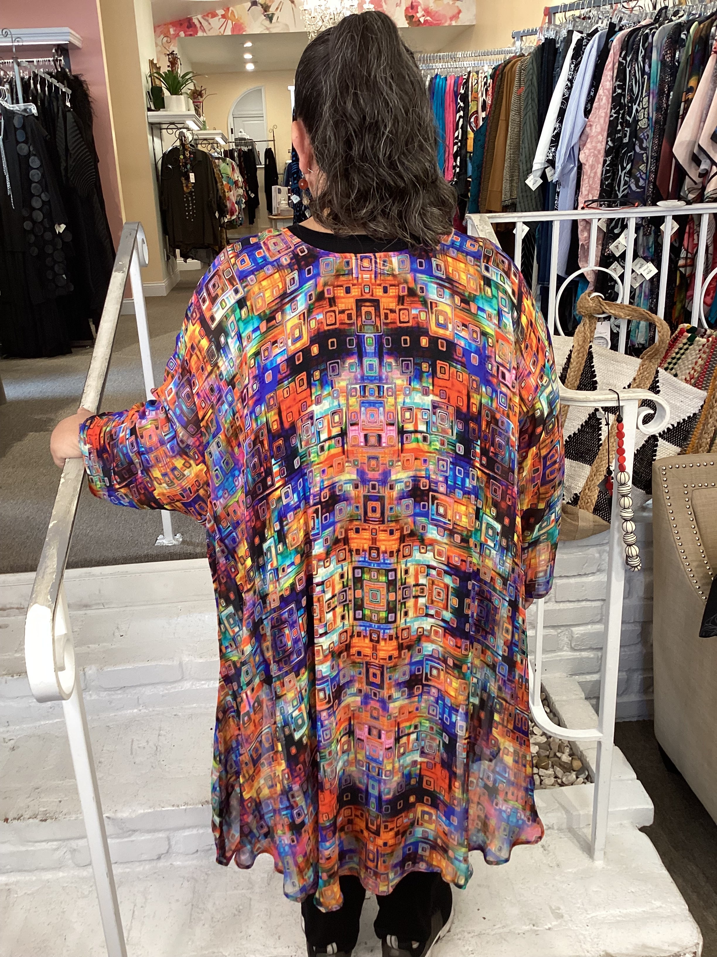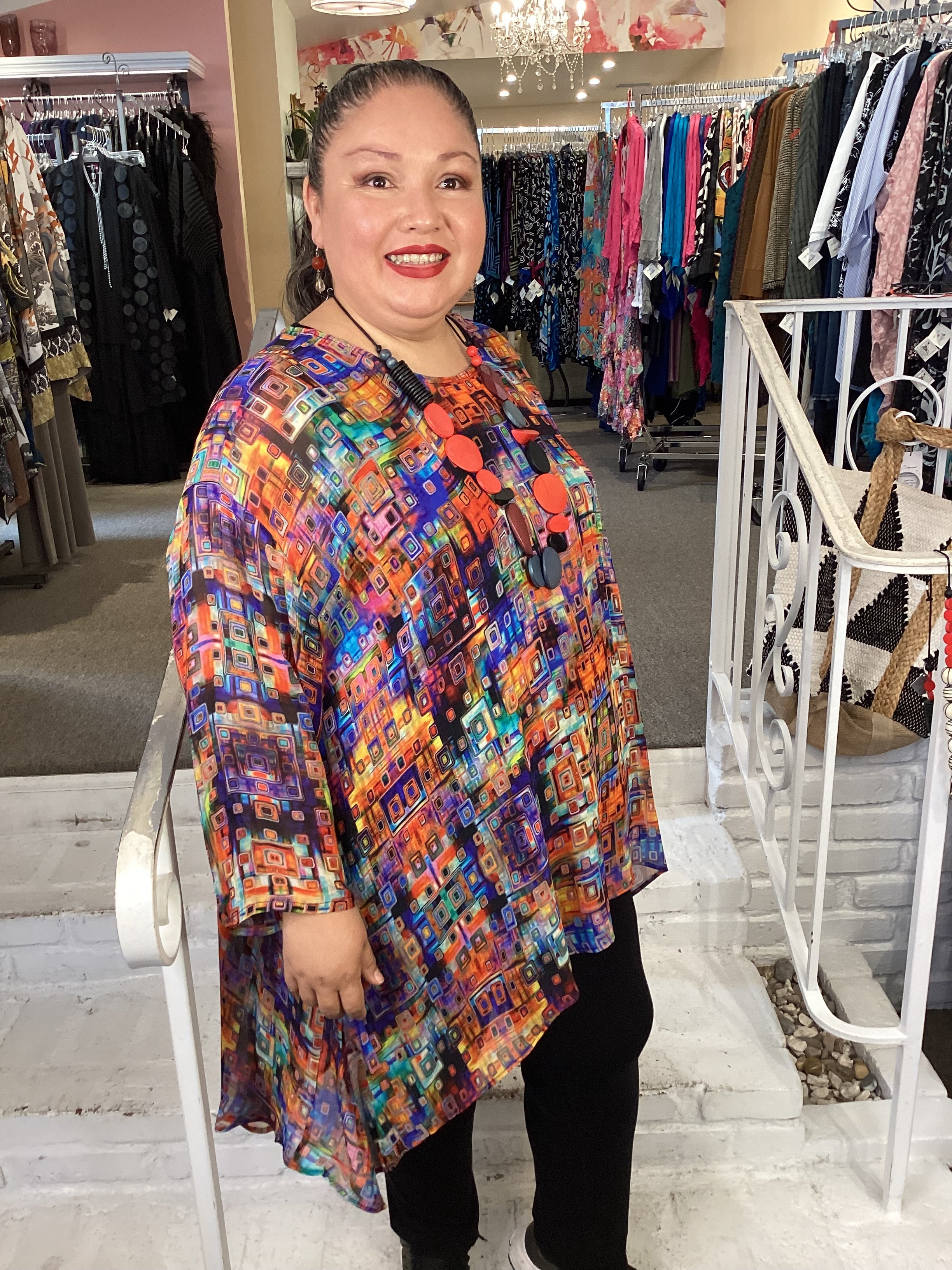 This version of the Whisper top features a semi sheer chiffon in a super colorful print and round neckline with generous sleeve. Designed in a boxy shape, the hem is arched in front and curved downward in back in a high/low contrast. Our model wears this one size piece which will work for 1X-4X.