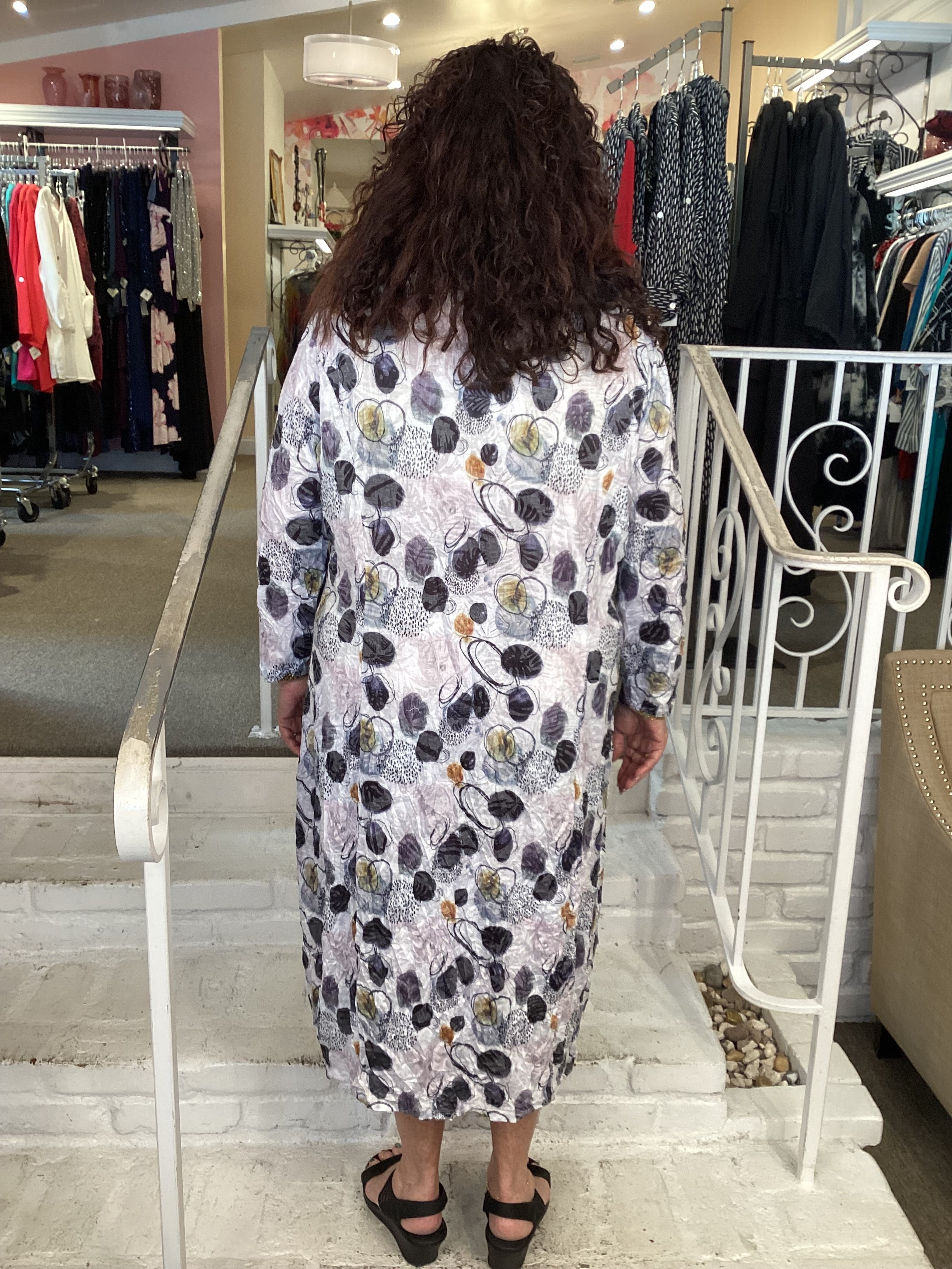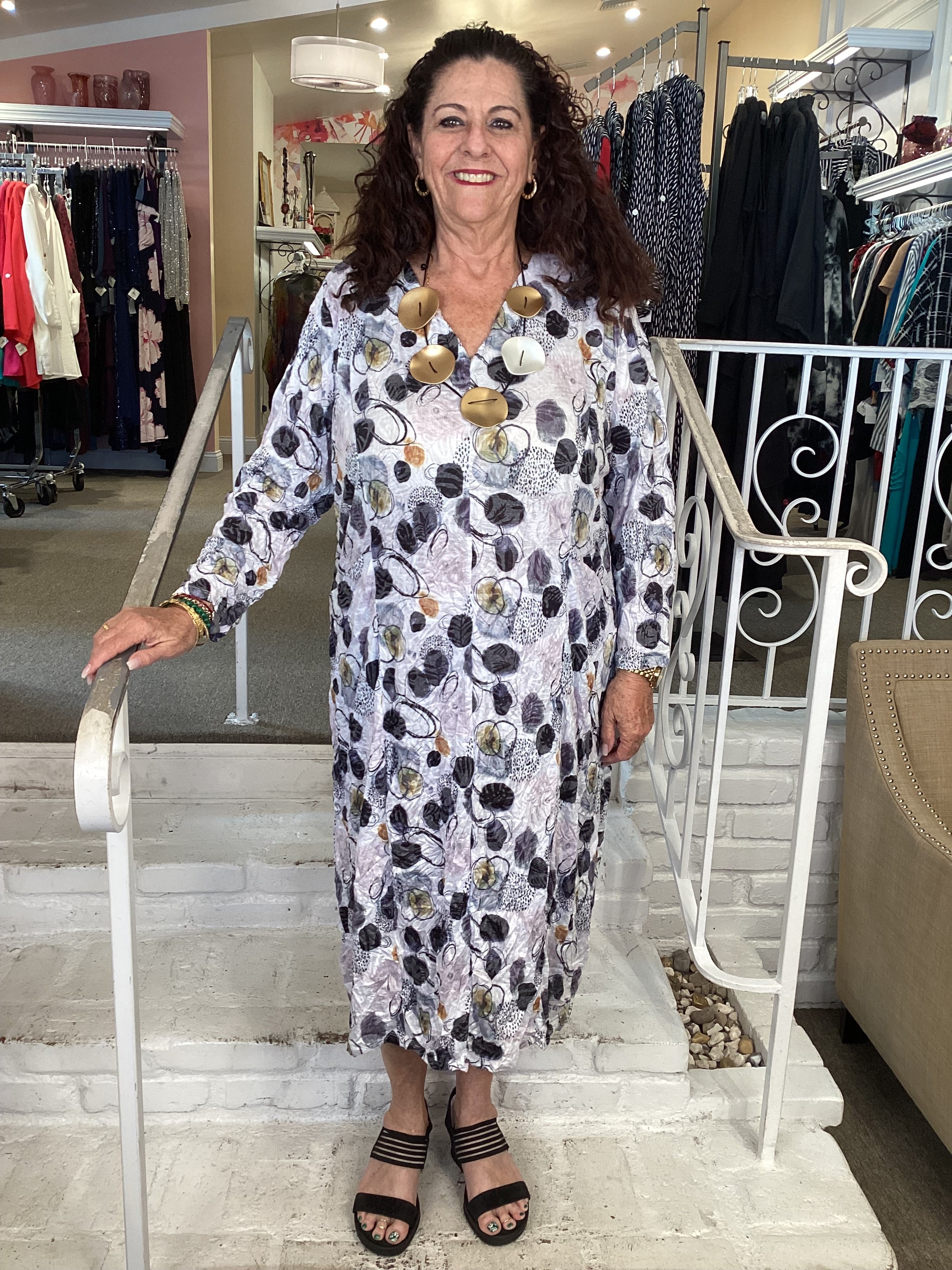 A new twist on Shana's crinkle dress, v-neckline, a-line silhouette, princess seams.  This white knit has a great graphic art print, double front pockets.  1X bust is 48", hips 50", length 46"/ 2X bust is 50", hips 52", length 46"