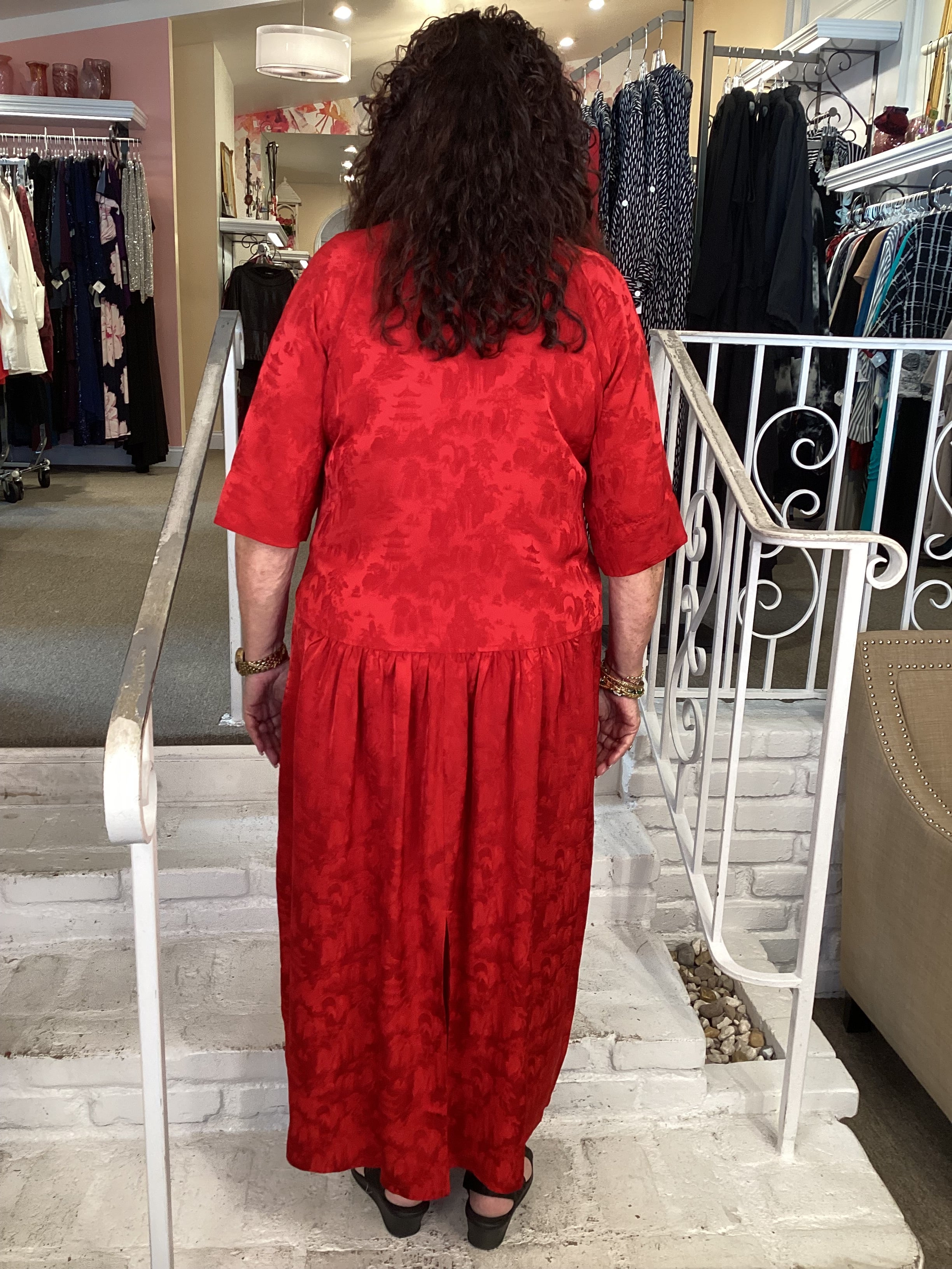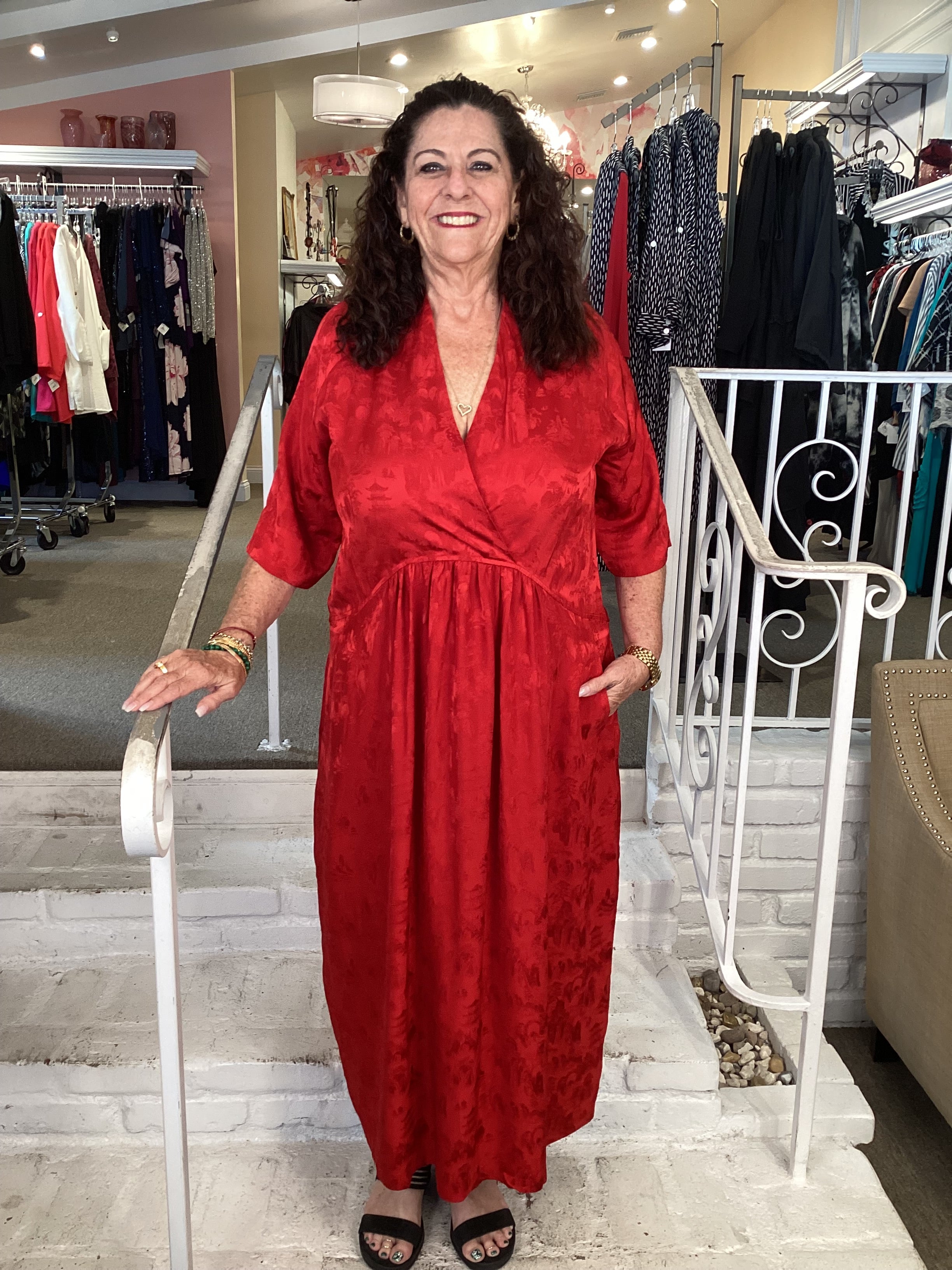 This stunning red maxi dress combines timeless elegance with practical comfort. The flattering V-neckline and empire waistline create a graceful silhouette that flatters all body types, while three-quarter sleeves provide modest coverage. Functional side pockets add everyday versatility to this sophisticated piece. Whether you're dressing up for an event or elevating your casual wardrobe, this dress delivers both style and wearability in a rich red shade.  Our model wears the size 2 bust 42", hips 60", length 50"