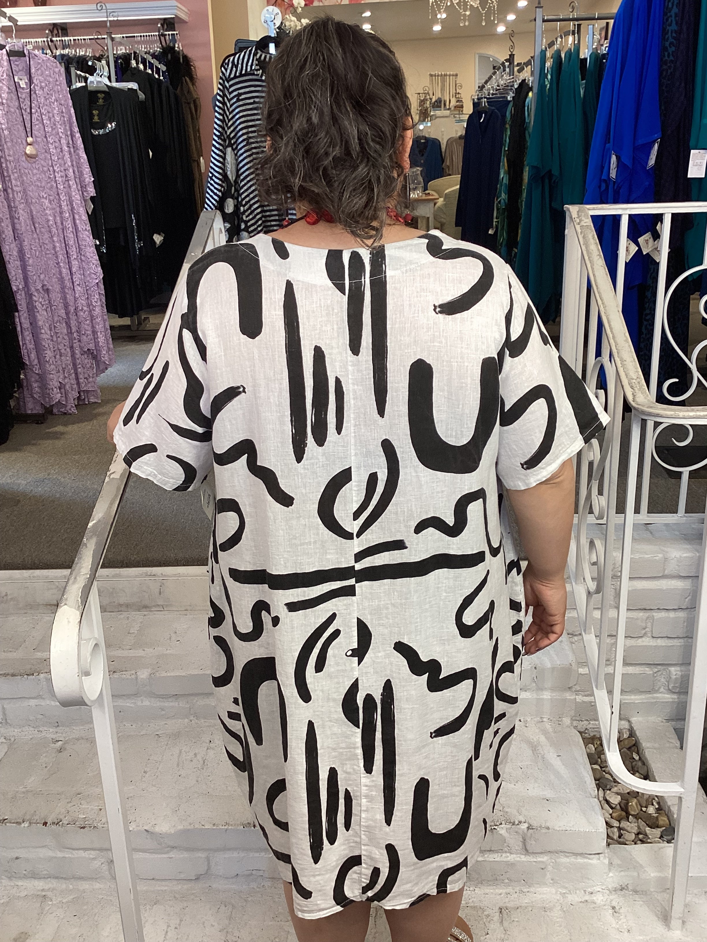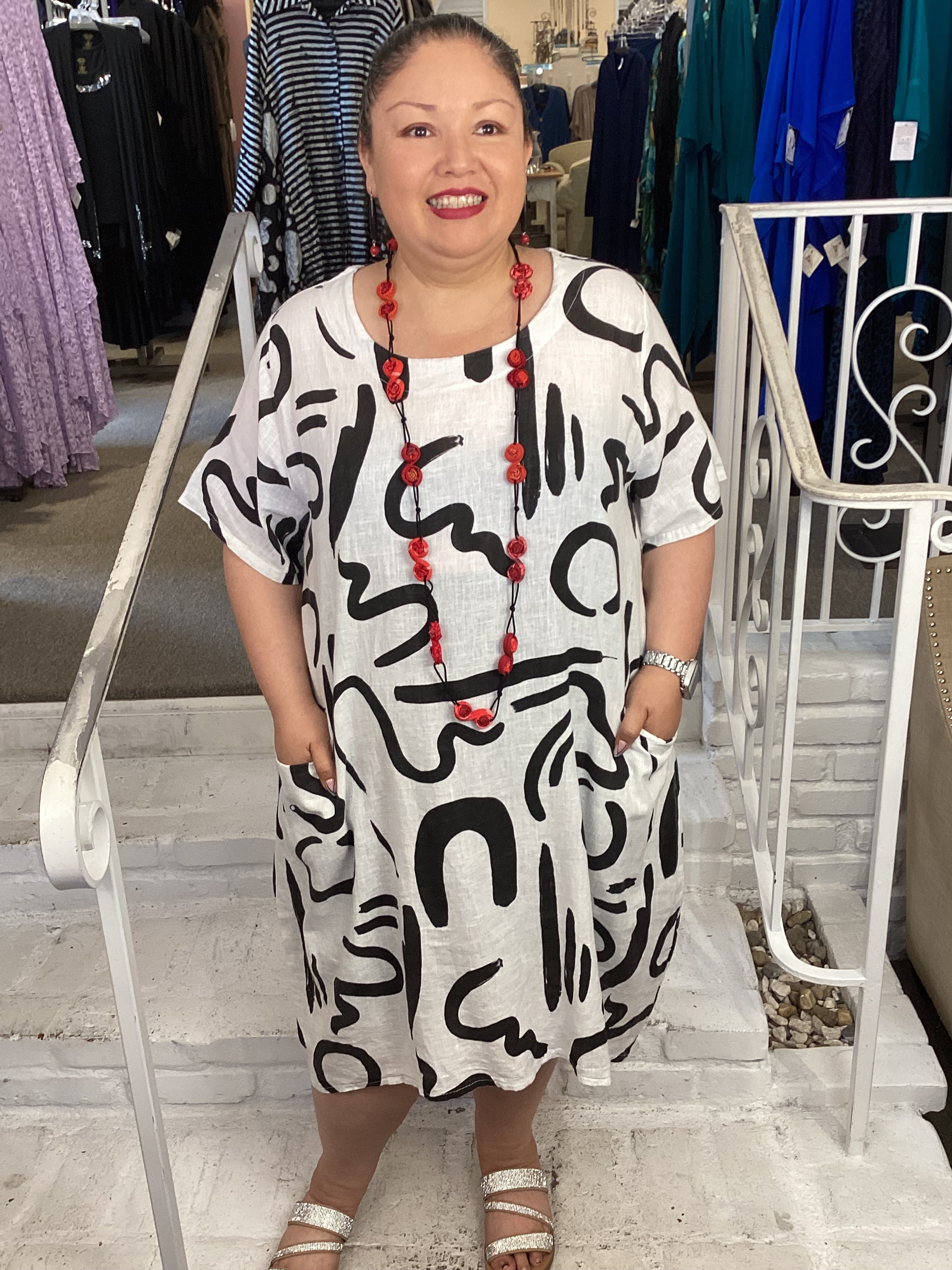 Introducing the GIBBERISH DRESS in WHITE. Made with a crisp white color and playful print, this midi length dress is a must-have for any fashion-forward individual. Its sleeve hits right in the middle of your arm, adding some extra coverage. Start you summer right with this must have piece!