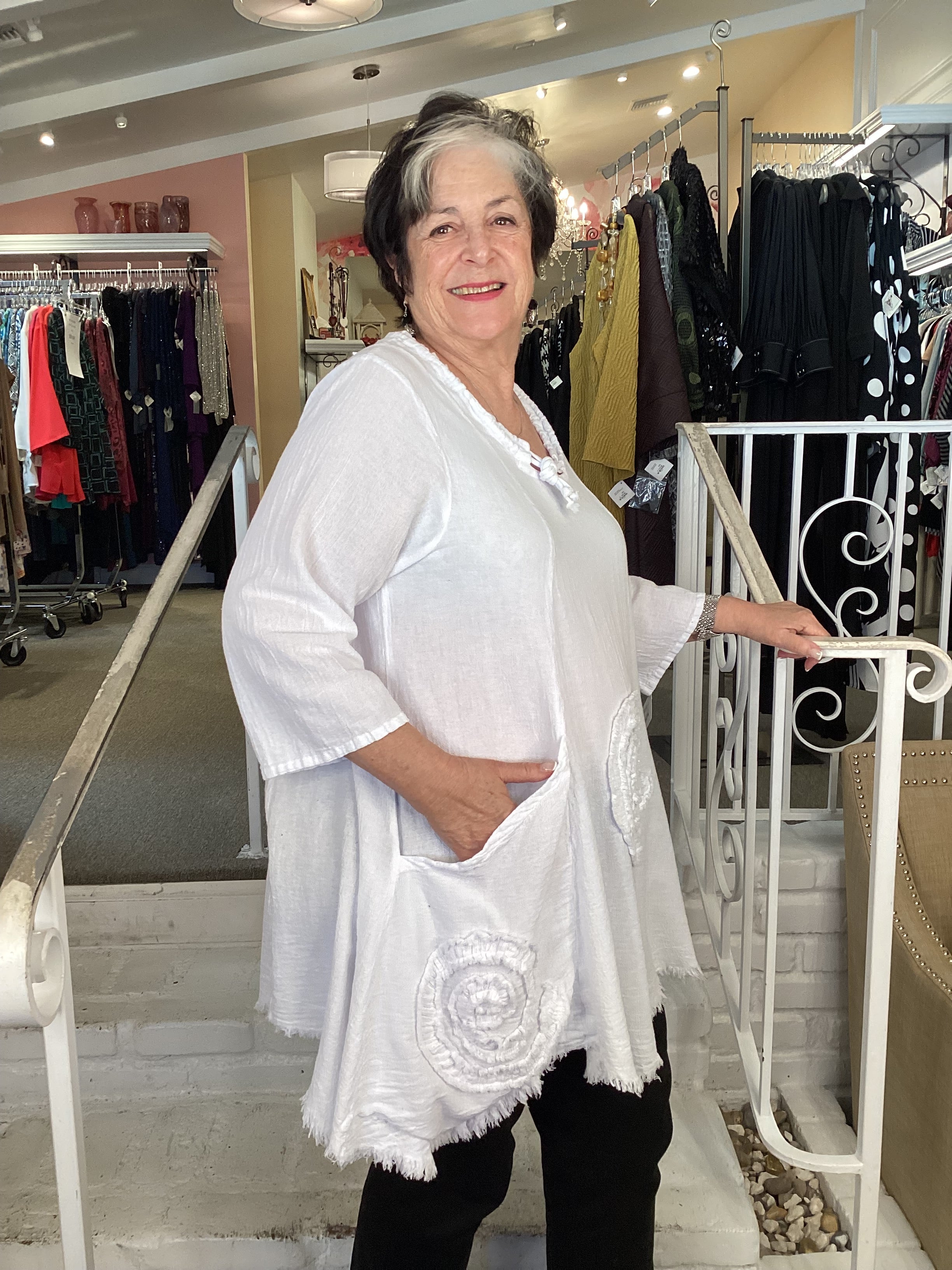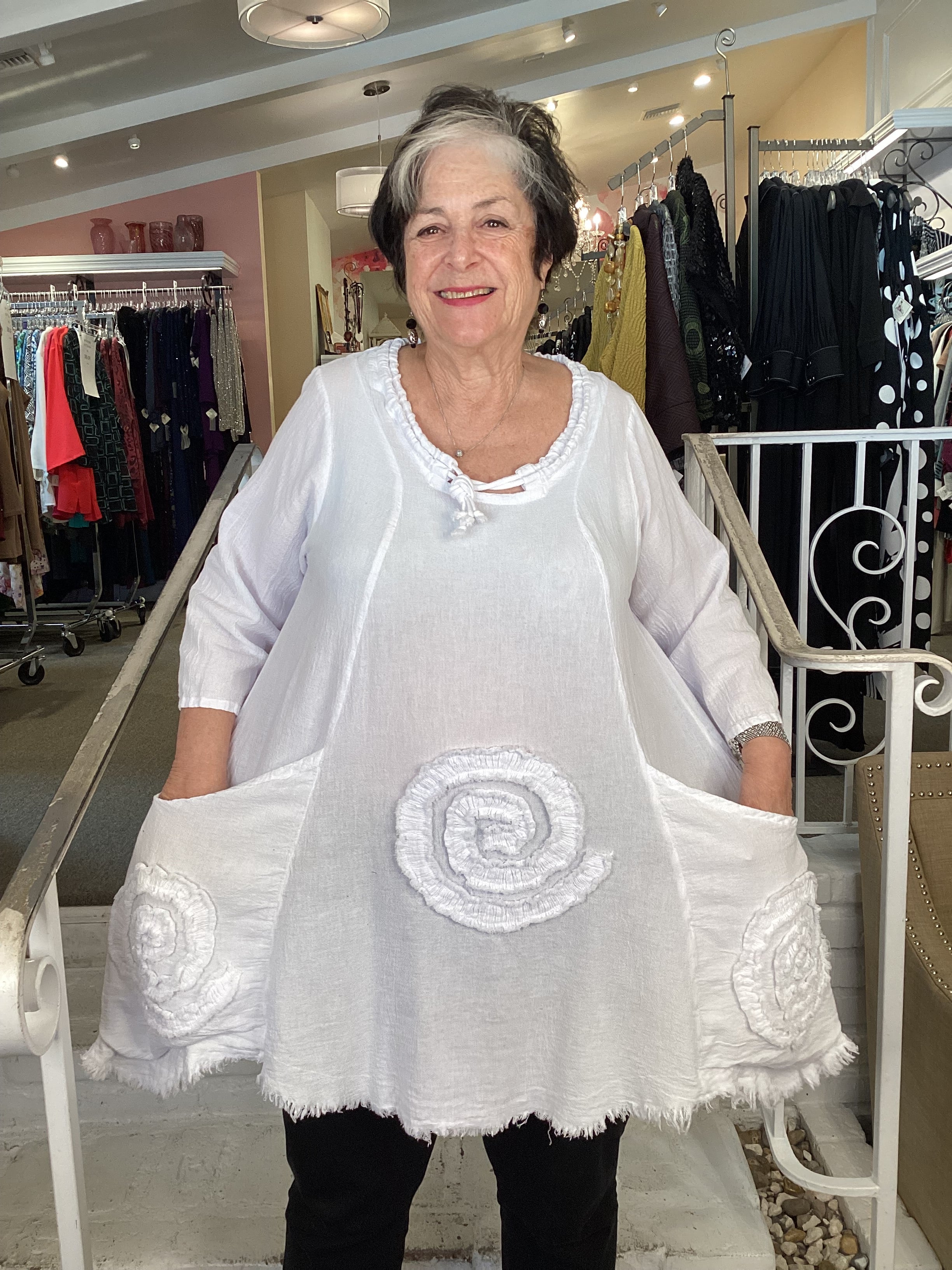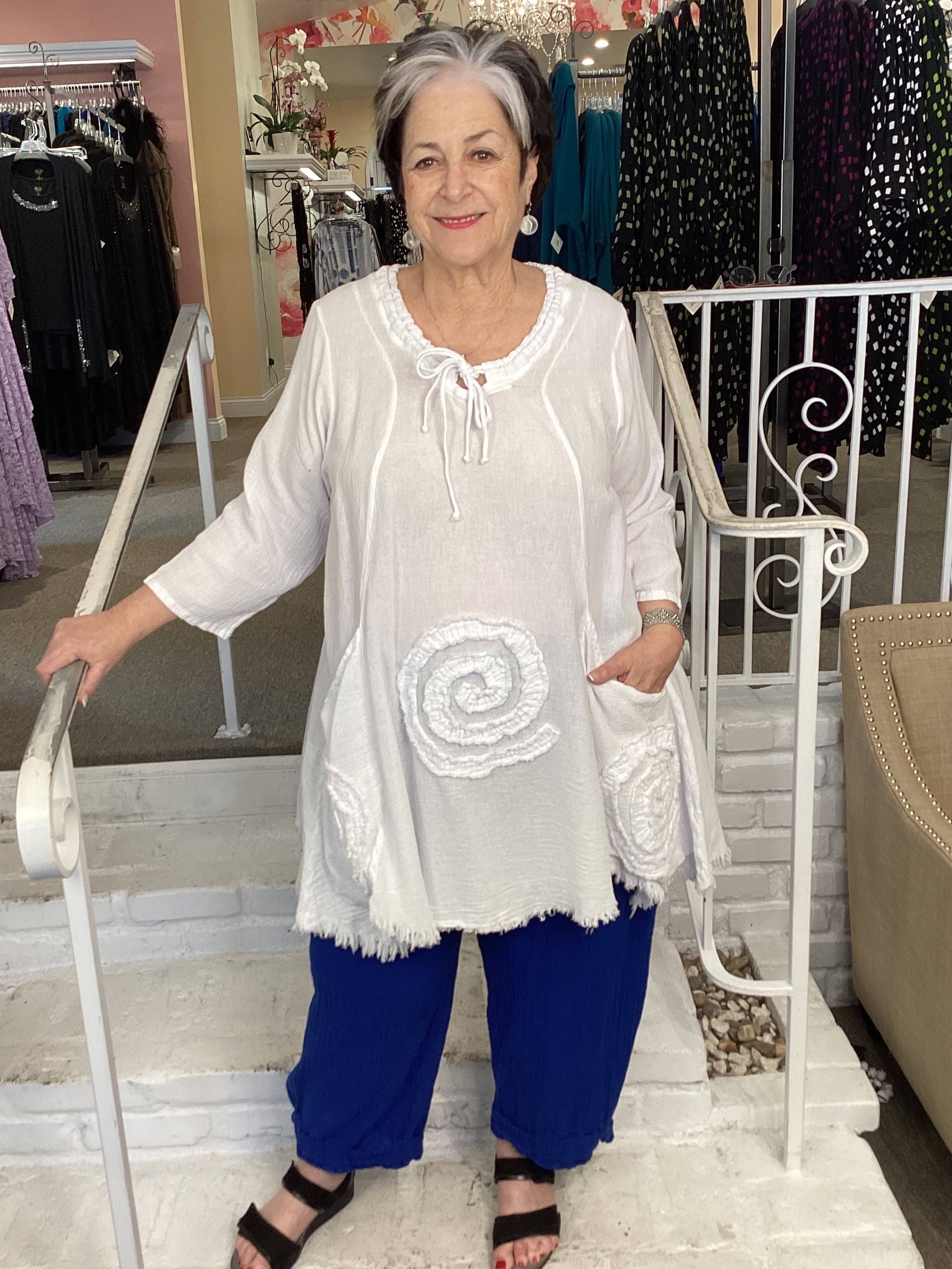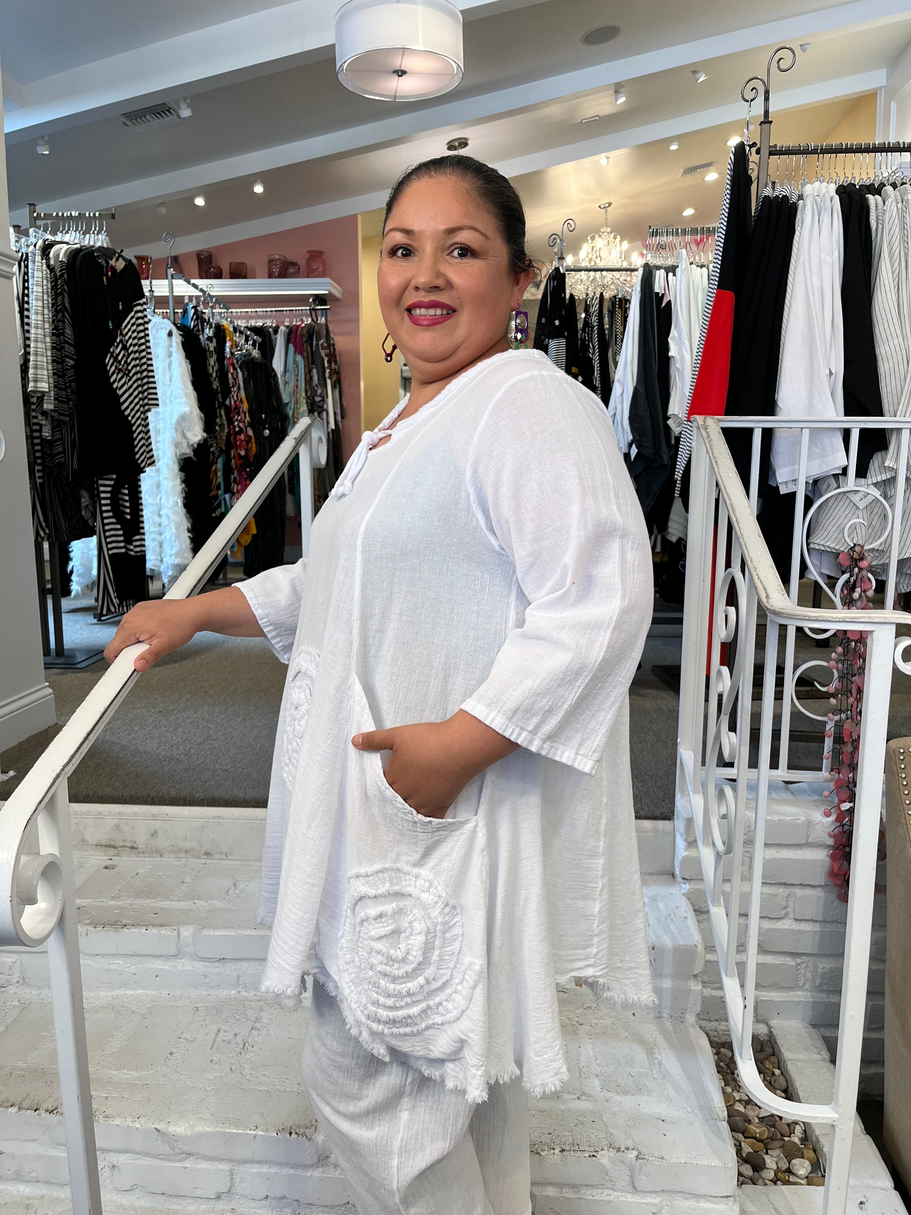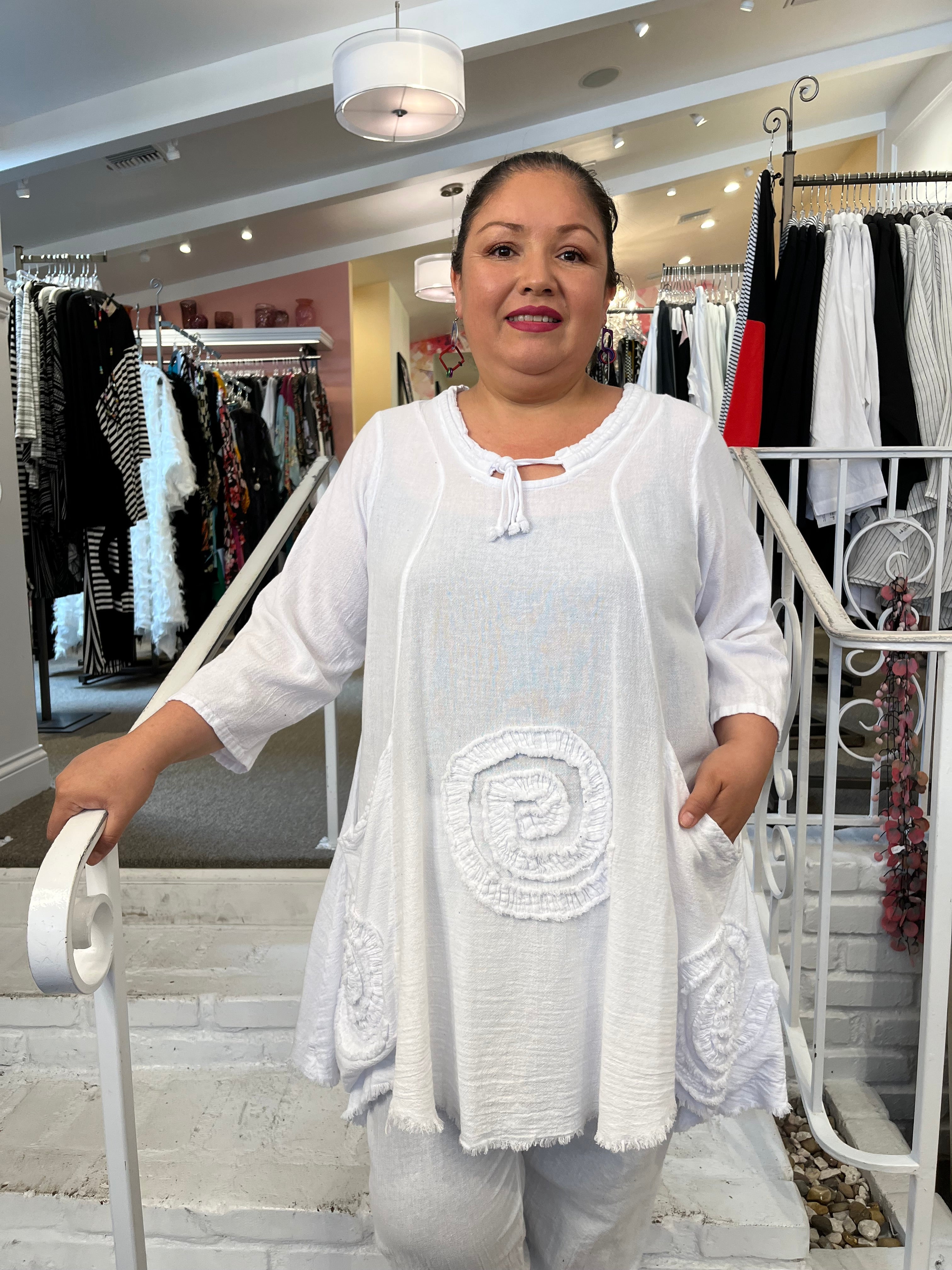 The Circle tunic from OH MY GAUZE  is available in several colors.  Light weight fabric and great detailing:  drawstring round neckline, two deep pockets on front panels, frayed circle appliques front and back.  A-line shape with 3/4 length sleeves