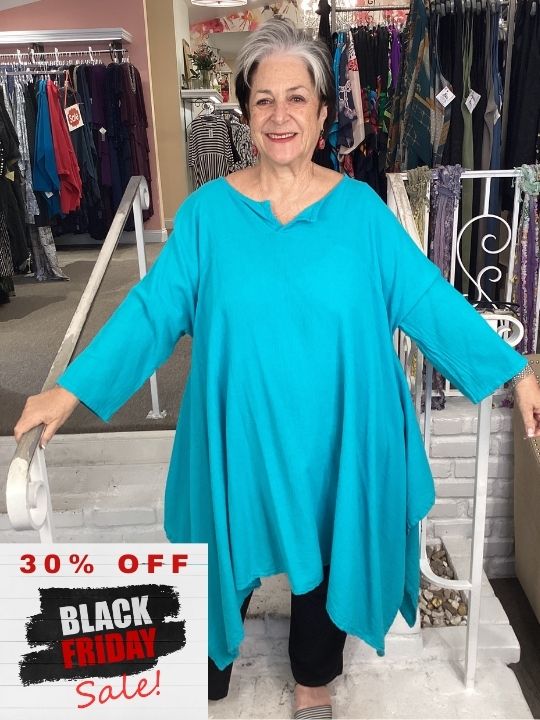 The Tiki top from OH MY GAUZE is a very generous a-line tunic. with a detailed neck line opening and front yoke seam. Available in rich garment dyed colors in light weight cotton. Tiki is a one size garment with bust measuring 56" and the center length is 35" with the sides dropping a few inches lower. Very generous at the hips.