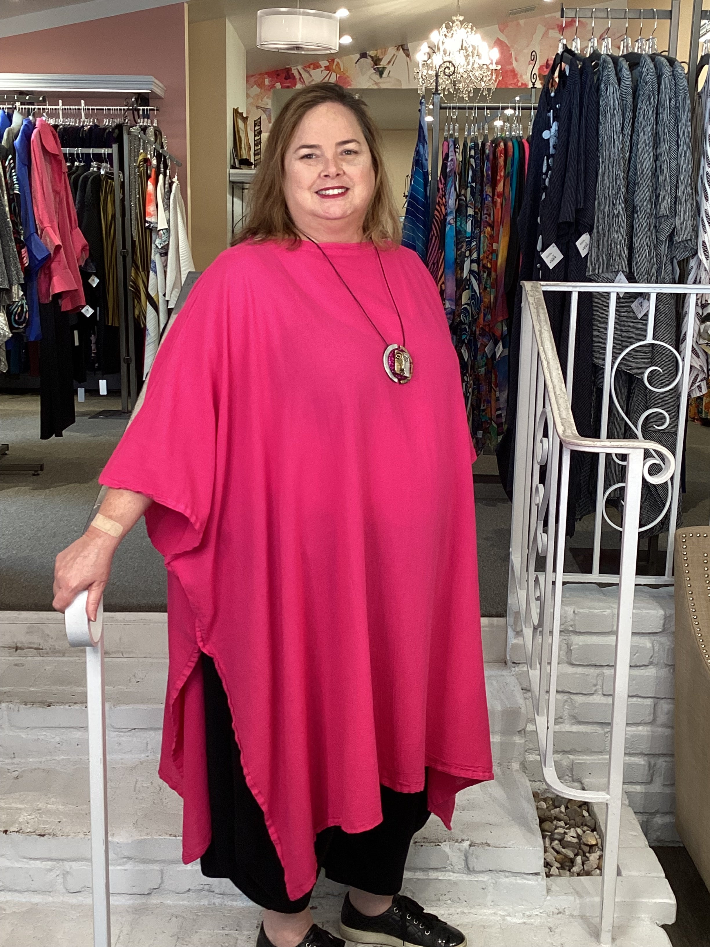 The Whisper Tunic from OH MY GAUZE is a very generous caftan style tunic with a boat neck line opening and side vents . Available in rich garment dyed colors in light weight cotton.