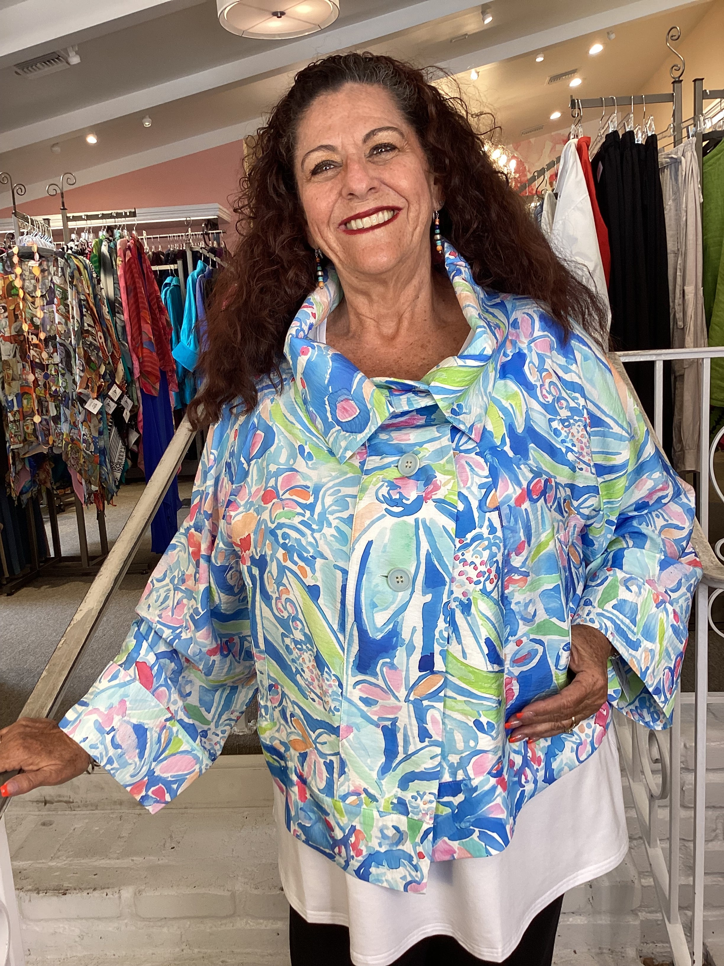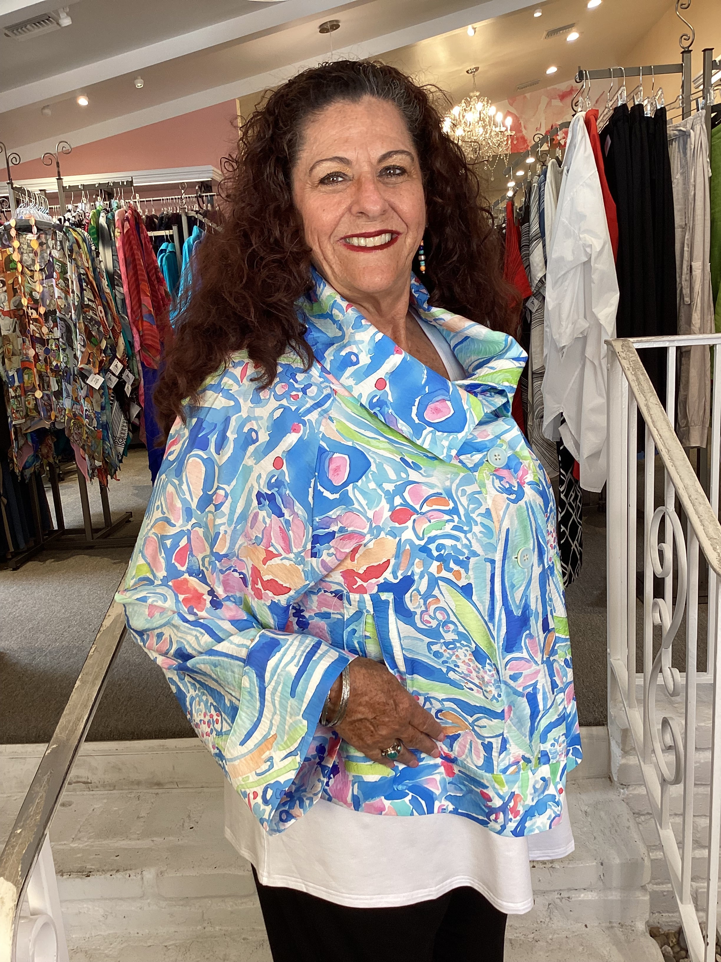 Chic!!! That's the best description for this statement jacket. Short in length, with a cross over button closure and a wide, dramatic collar. The generous sleeves are long with wide cuffs, and there are detailed pocket inserts on both front panels. Model is wearing an 1X