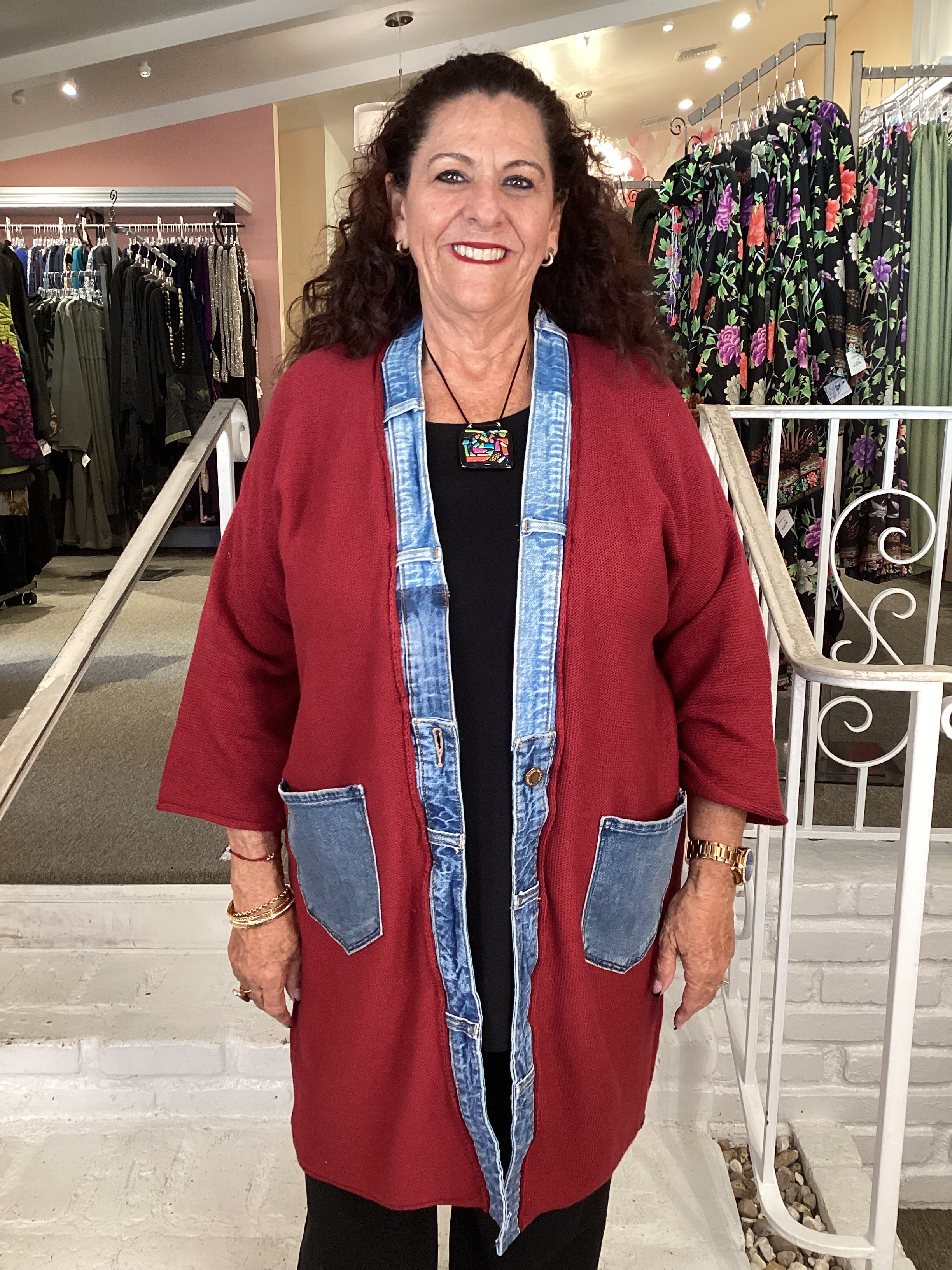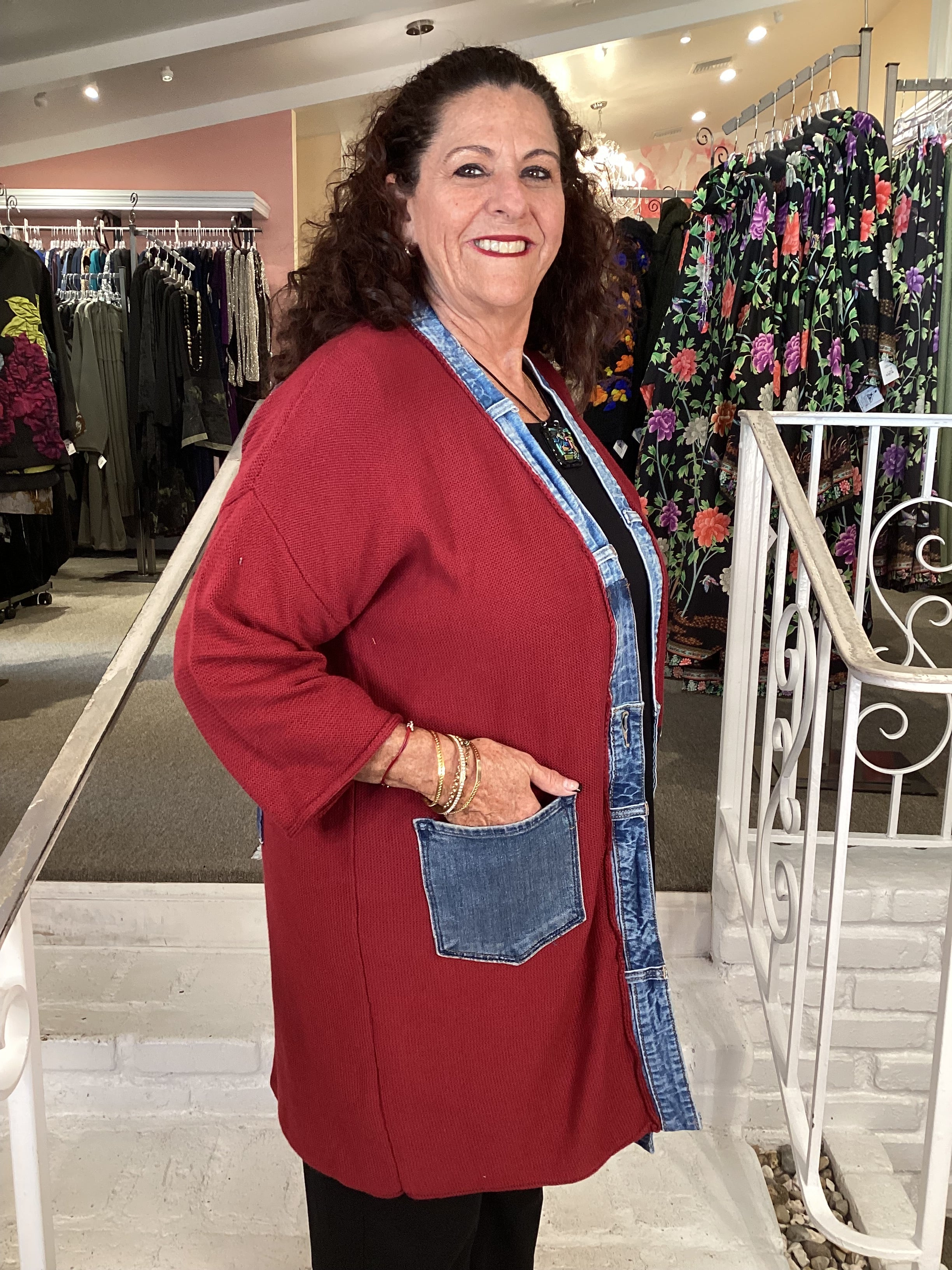 Add a pop of color to your wardrobe with the Passion Cardigan. Crafted from cotton, this versatile piece features striking denim lapels and two functional front pockets that deliver unexpected visual interest. The back showcases a distinctive "love" patchwork detail that elevates any casual or dressy ensemble. Layer it over your favorite outfits for effortless style with personality.