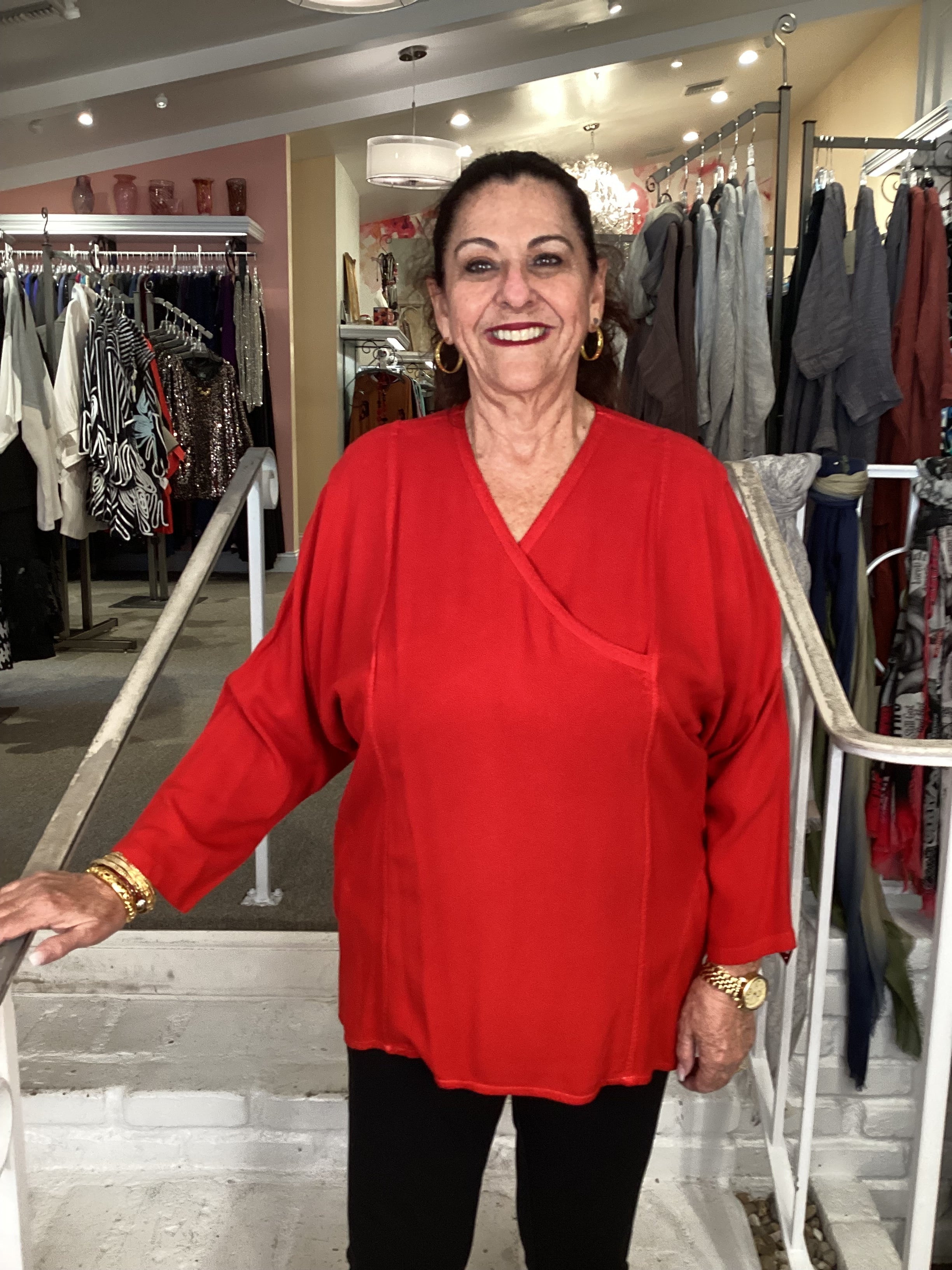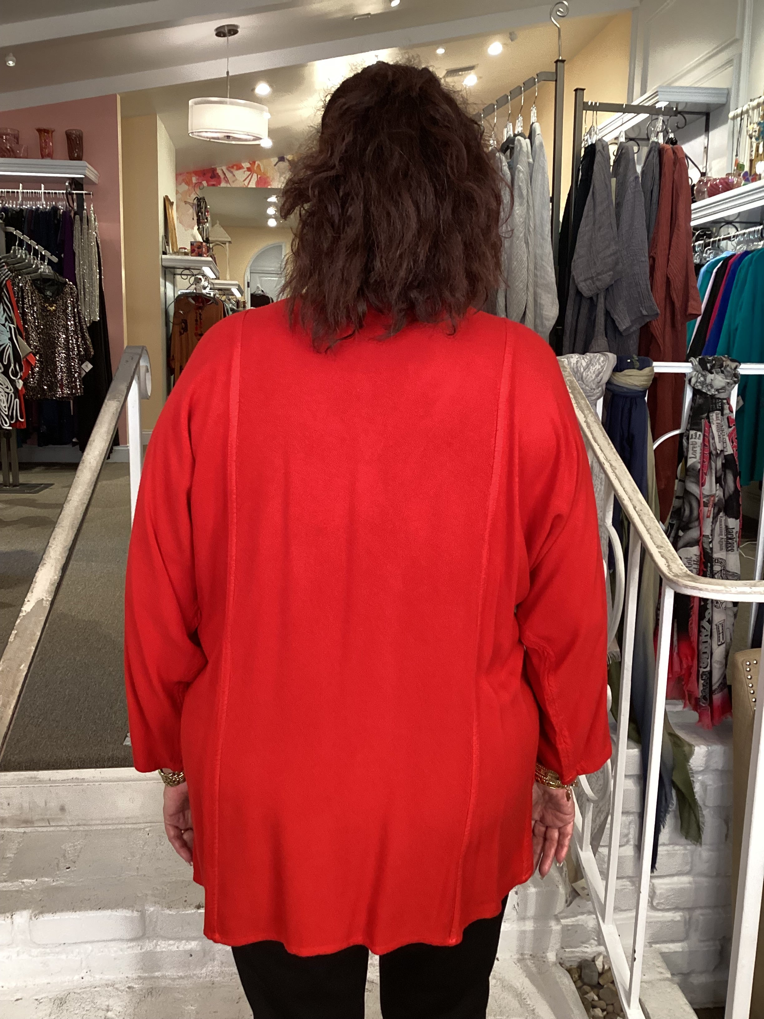 The cross over front creates a V-neck line outlined with stitching detail. The drop down long sleeves are generous on this plus size top. Two side seam pockets are generous and detailed with stitching. Our 1X model has plenty of room in this one size garment.