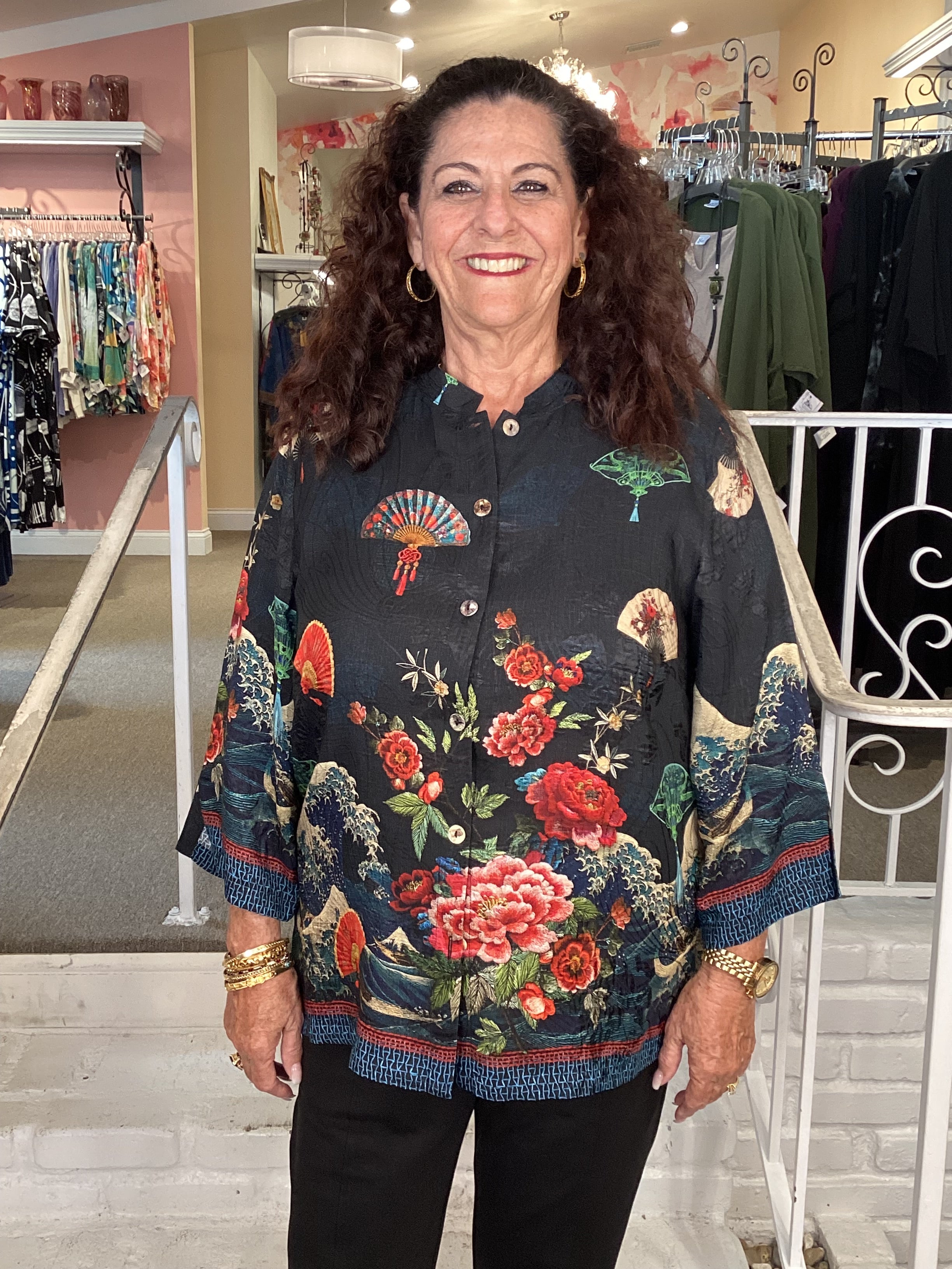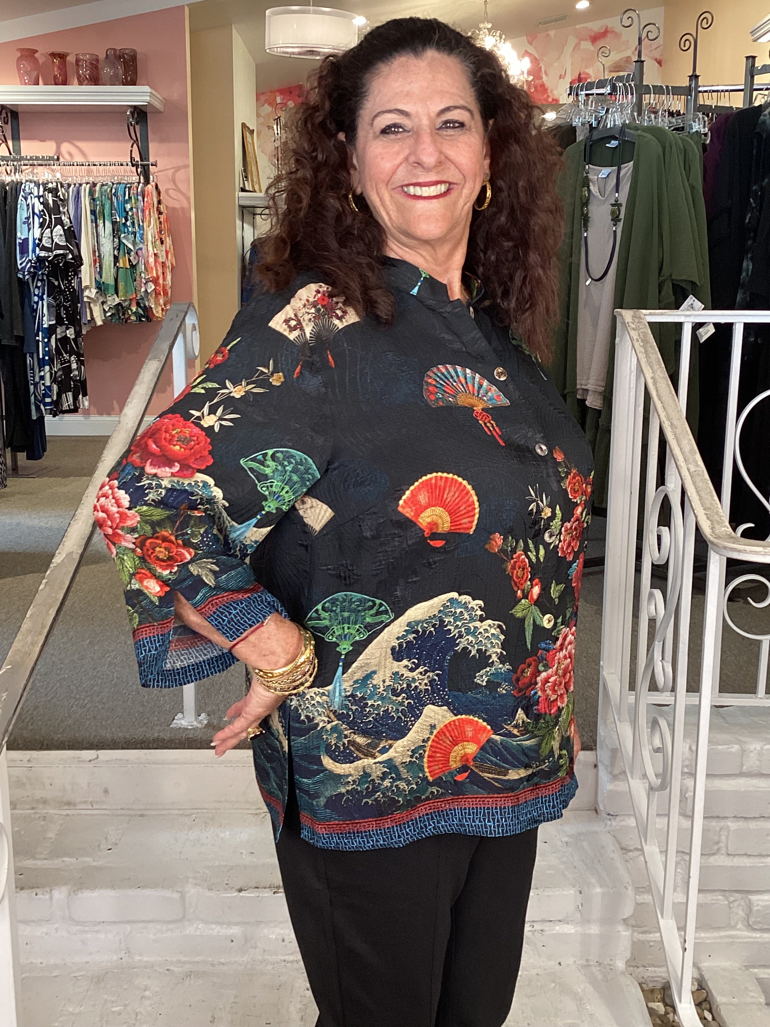 Citron blouse crafted from our textured Silk Blend fabric, featuring an elegant mix of floral motifs, fans, and scenic elements on a deep, rich background. Designed with a mandarin collar, 3/4 sleeves, and side slits for ease and comfort, this blouse offers a relaxed yet polished silhouette. A versatile piece that transitions effortlessly from everyday wear to more refined occasions.