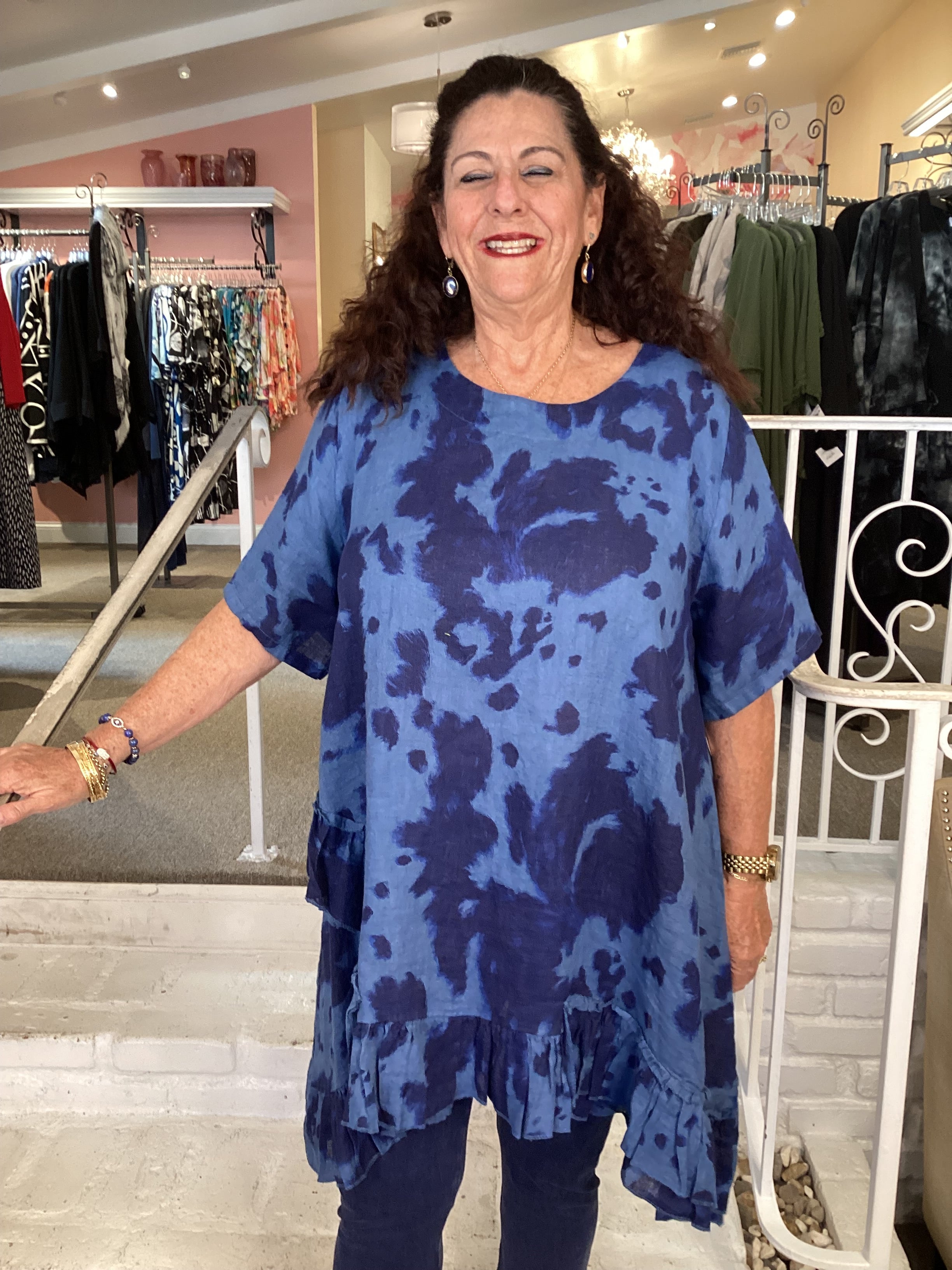 This could be your perfect summer tunic from Transparente!! Light weight linen, a-line silhouette, round neckline and short sleeves. A bold navy/black print on colorful blue and ruffle accent makes a unique piece for your summer wardrobe. The bust measures about 48" and the center length is 31", draping down on the sides.