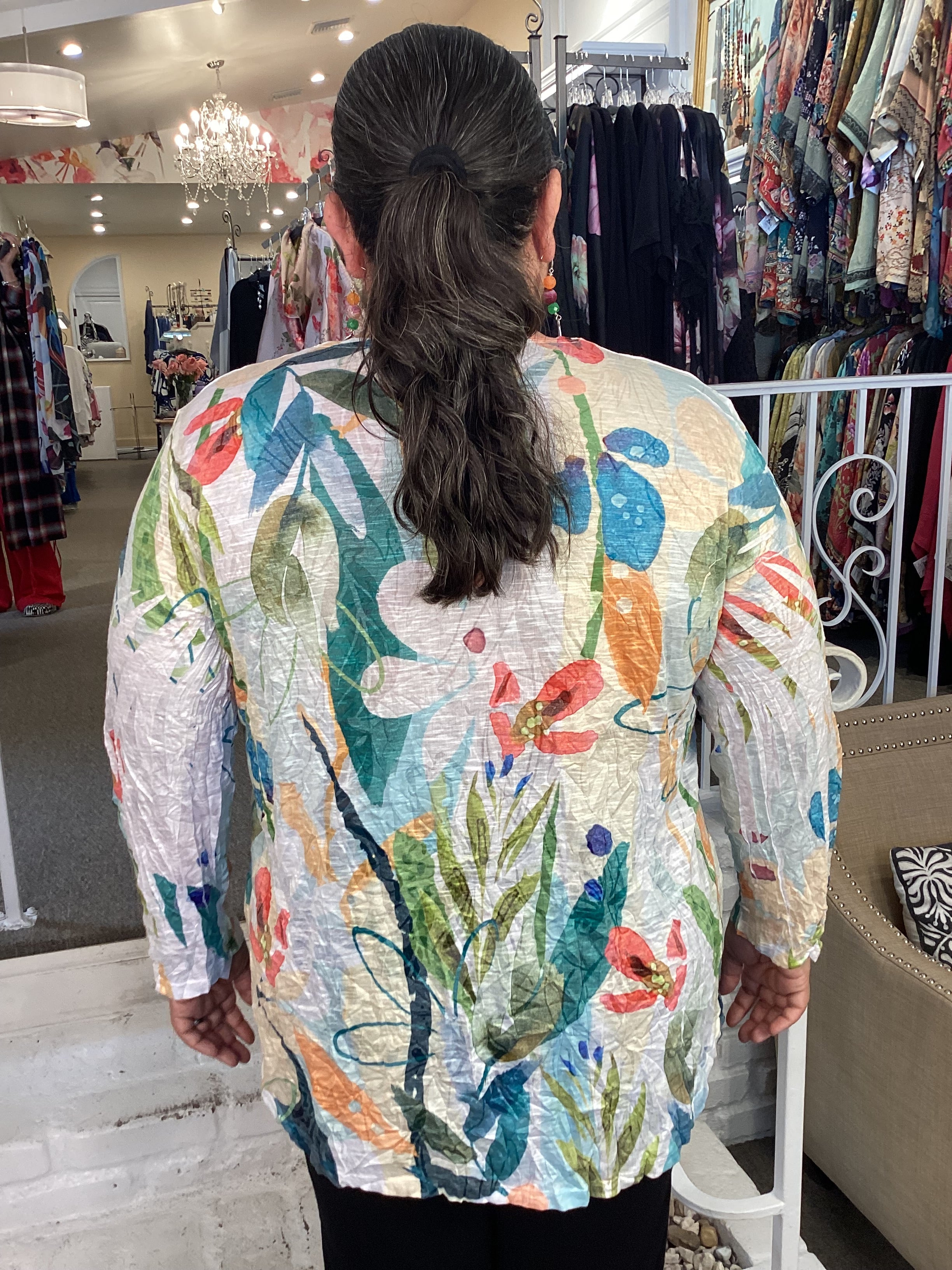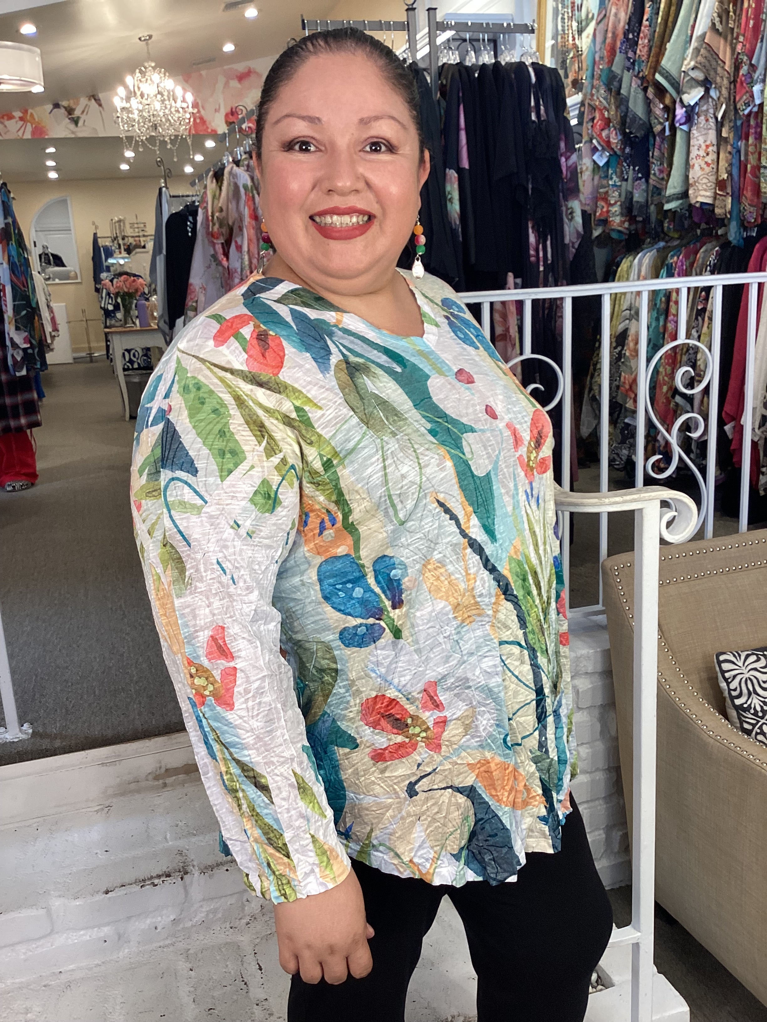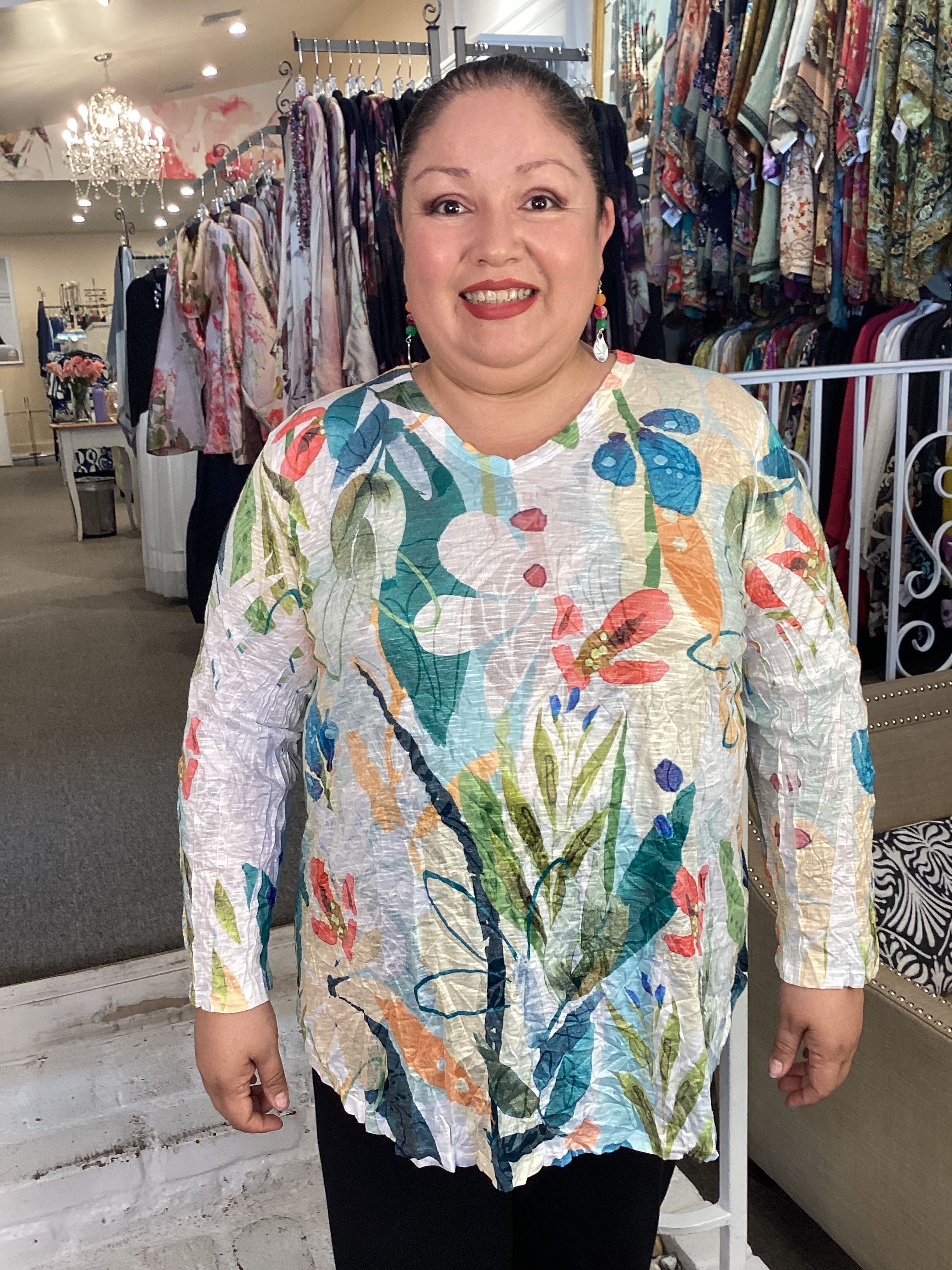This crushed, burnout fabric is cool, natural rayon that has been given an overall wrinkled appearance. These have a soft V neckline and long sleeves with a rounded, shirt tail hemline. So you can be comfortable and gorgeous.