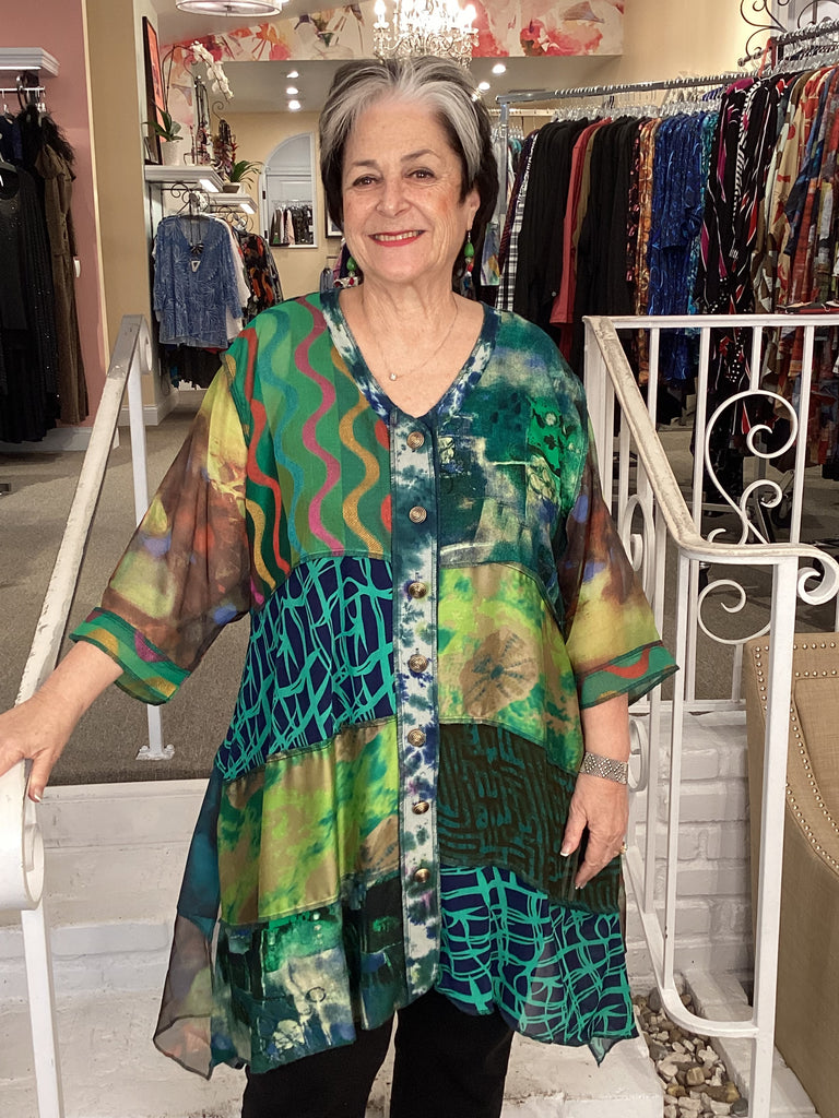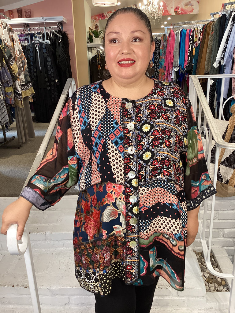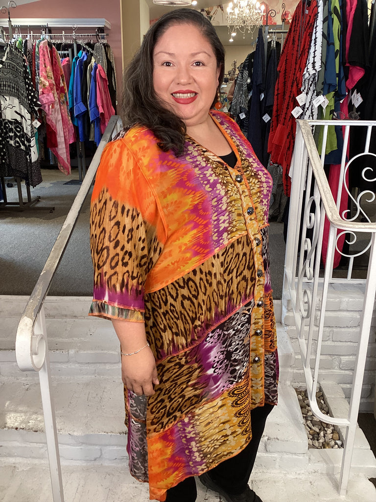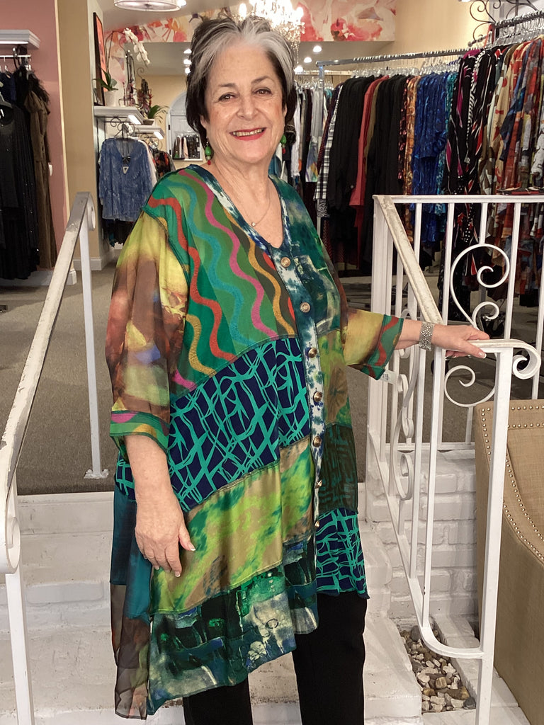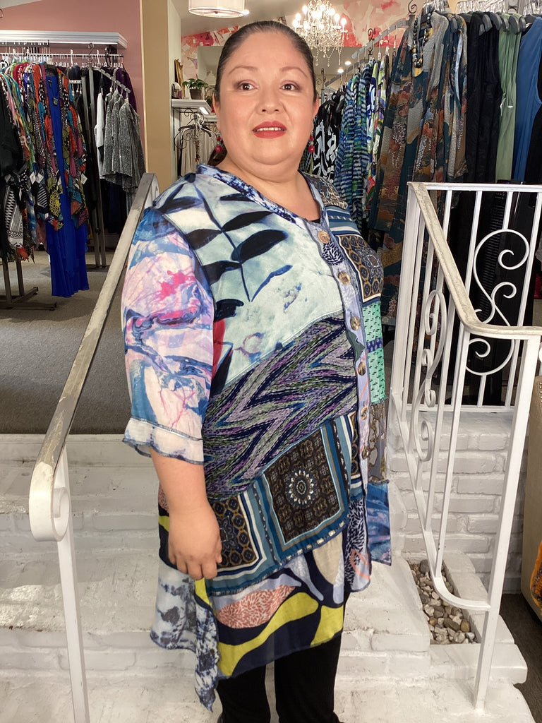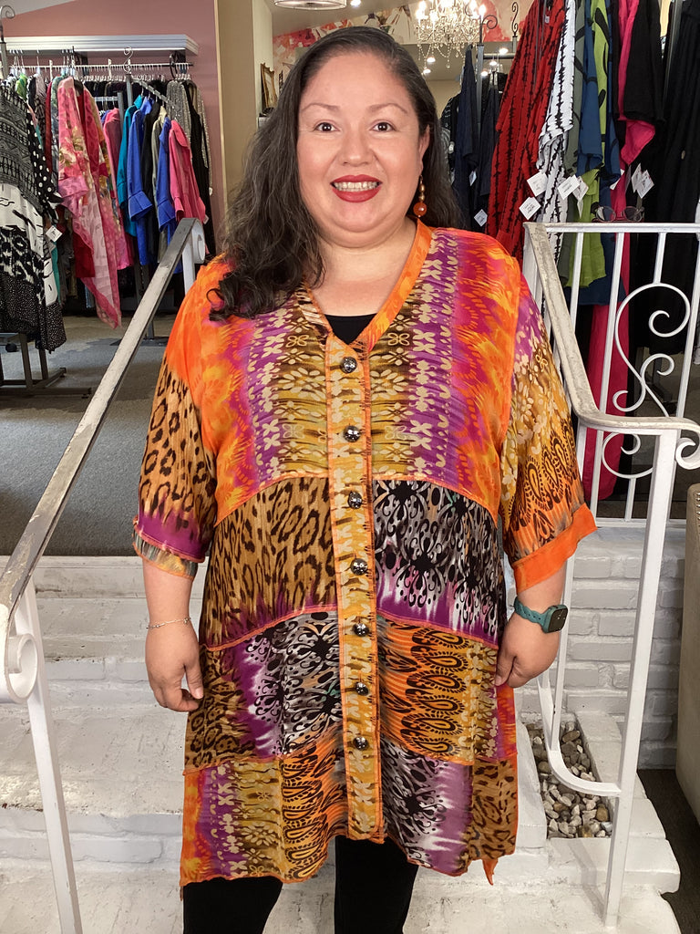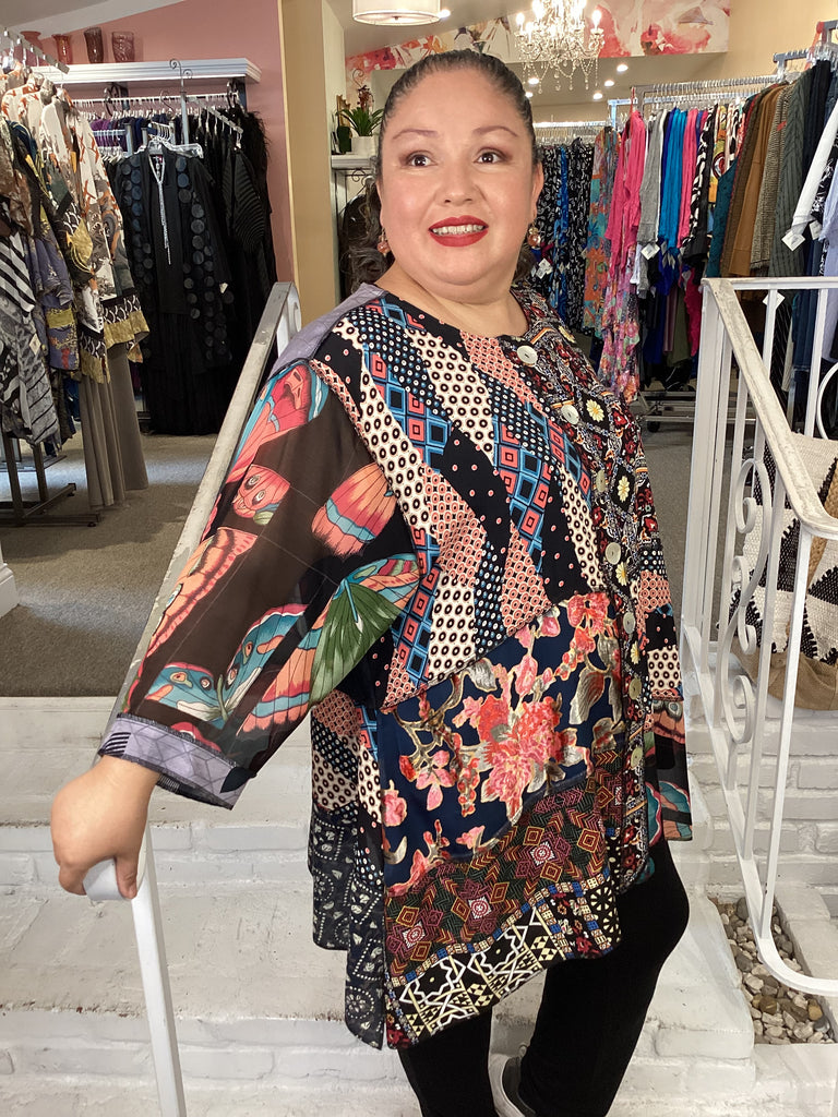 We love the Happy Coat. Feel good and happy in this button down tunic with a variety of colors and patterns. Whisper tunics are a hi-low style and fit to a 4x.