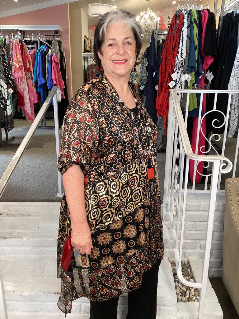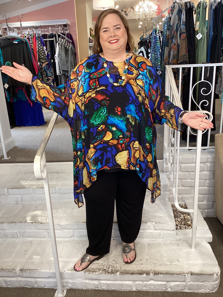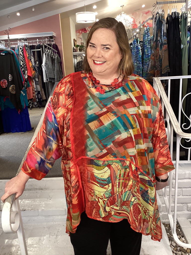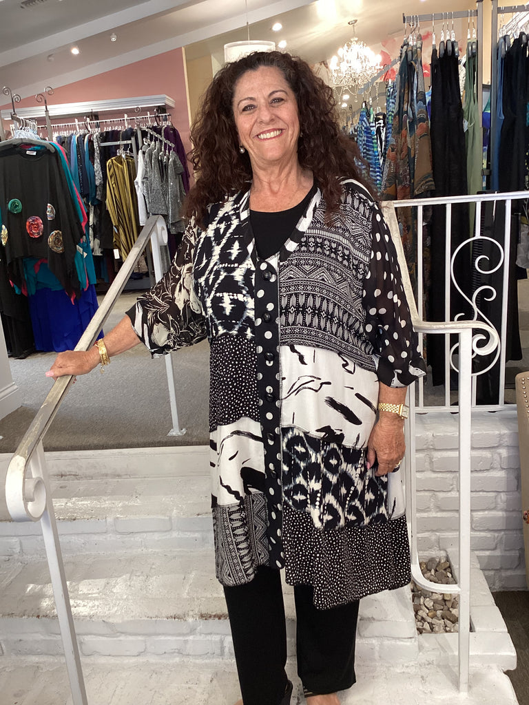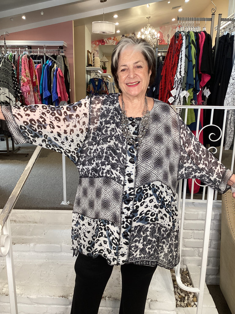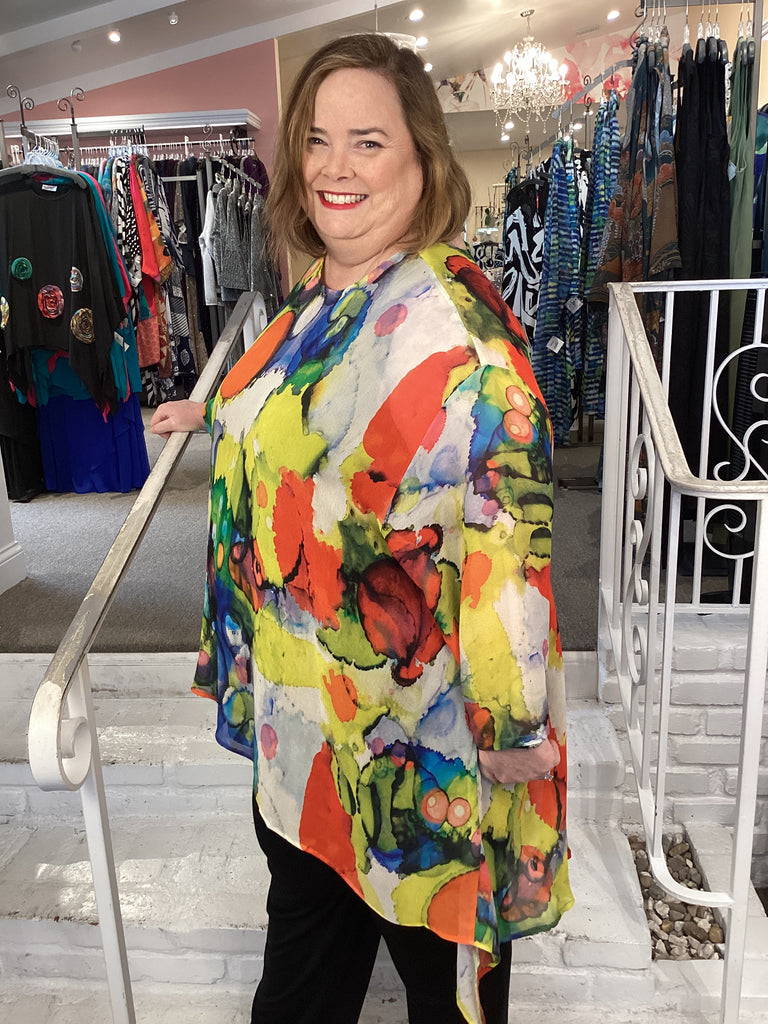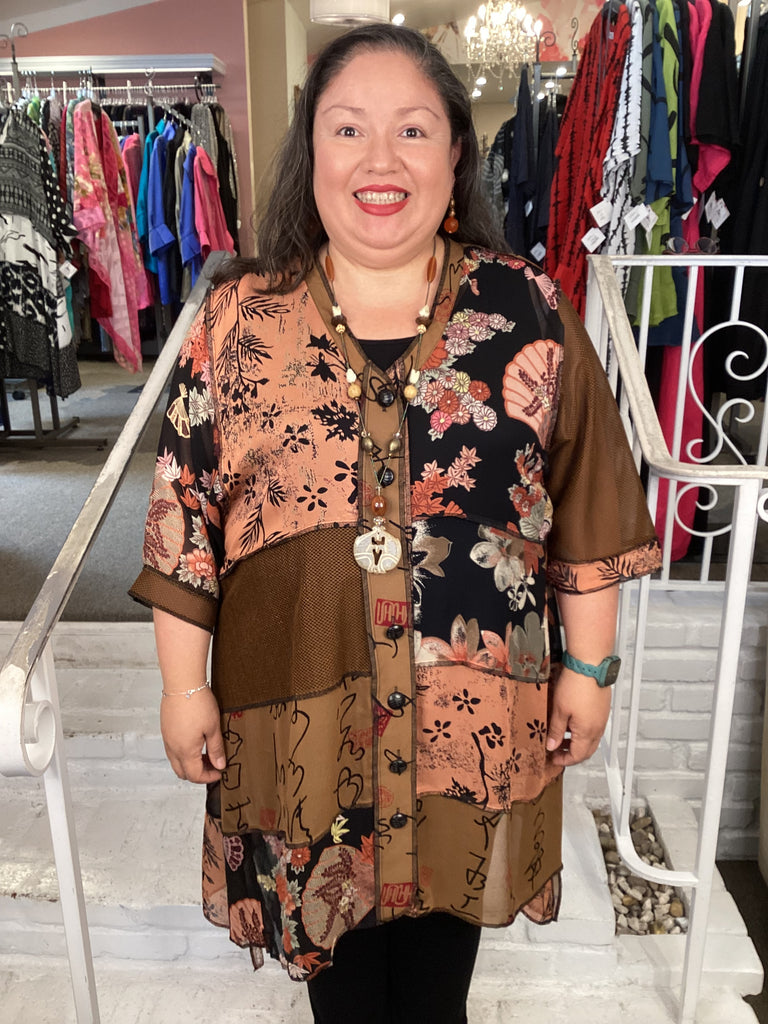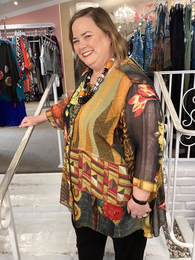 We love the Happy Coat. Feel good and happy in this button down tunic with a variety of colors and patterns. Whisper tunics are a hi-low style and fit to a 4x.