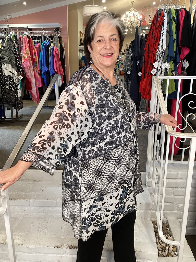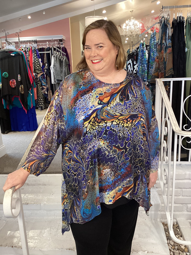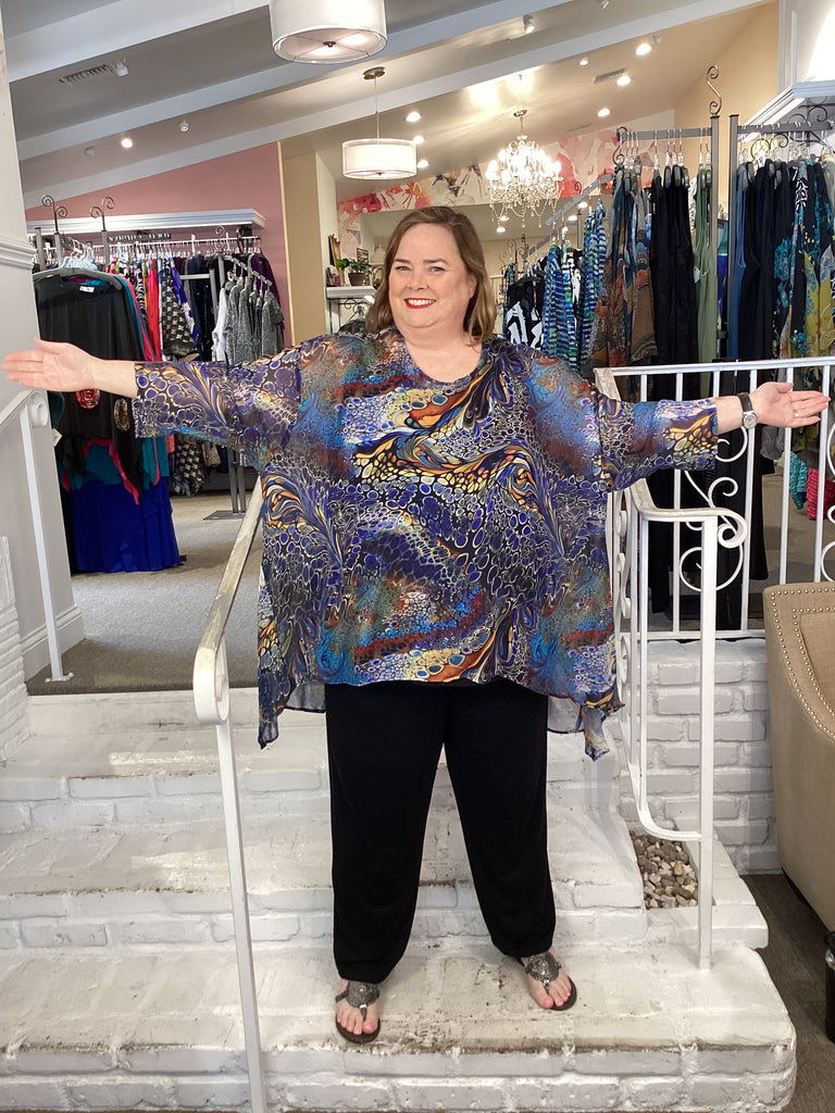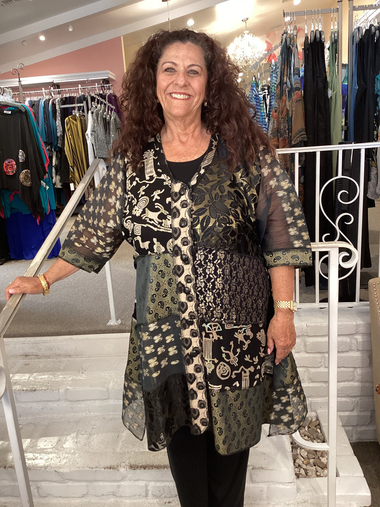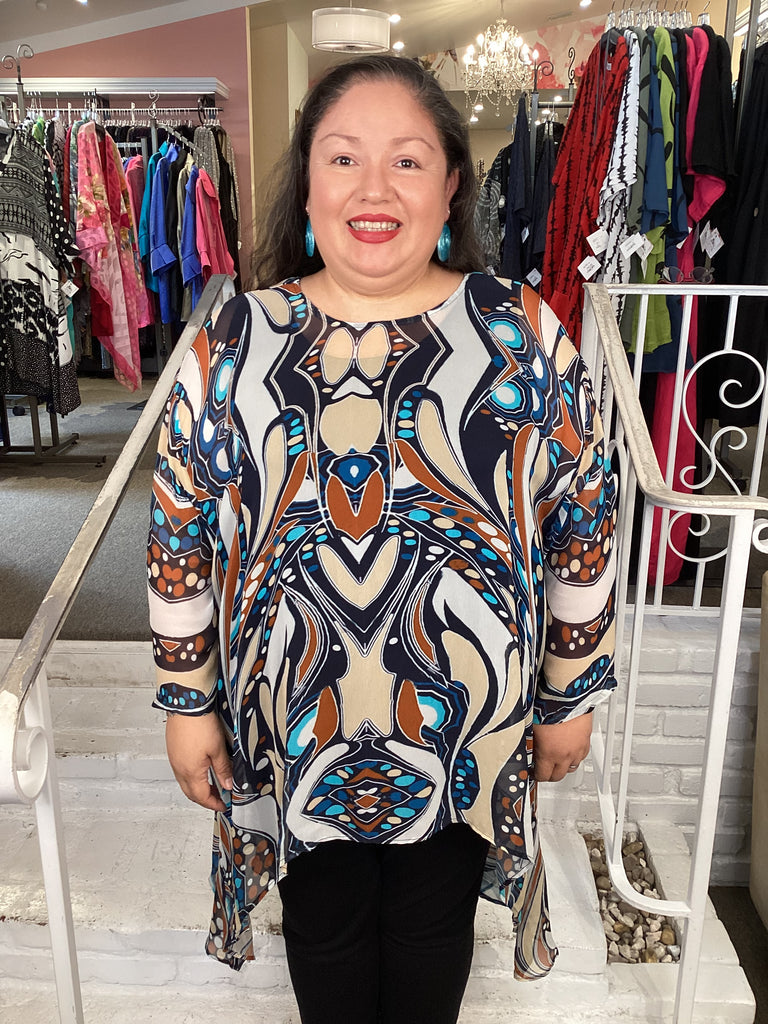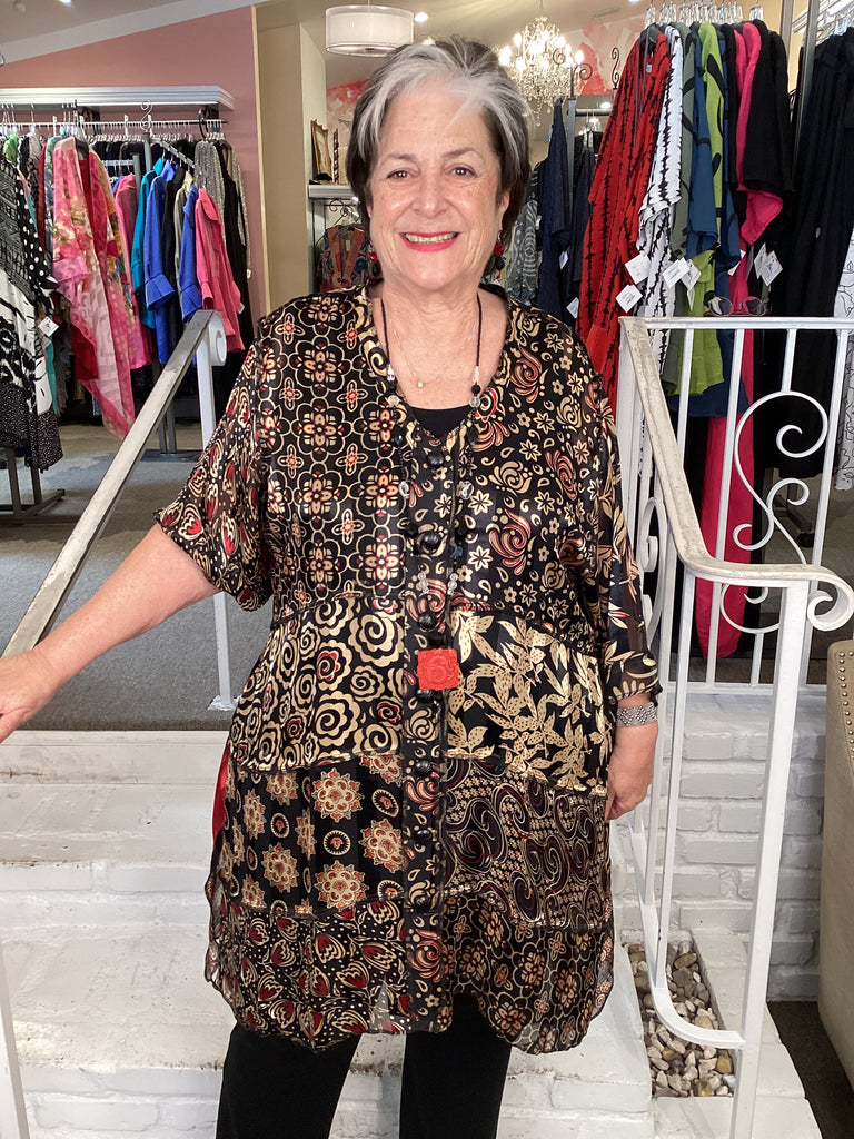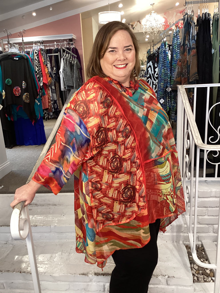 We love the Happy Coat. Feel good and happy in this button down tunic with a variety of colors and patterns. Whisper tunics are a hi-low style and fit to a 4x.