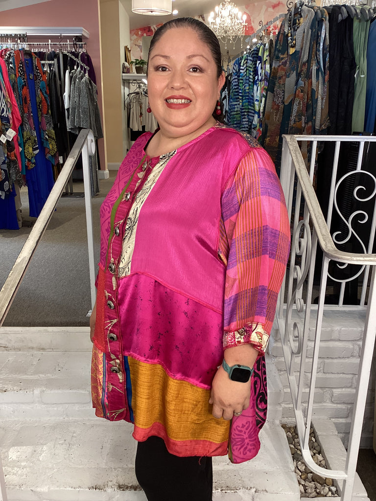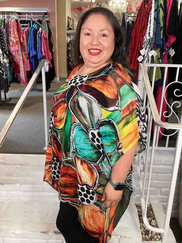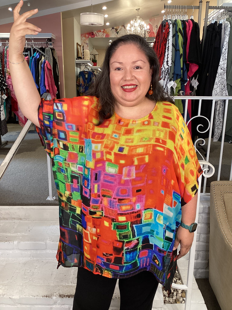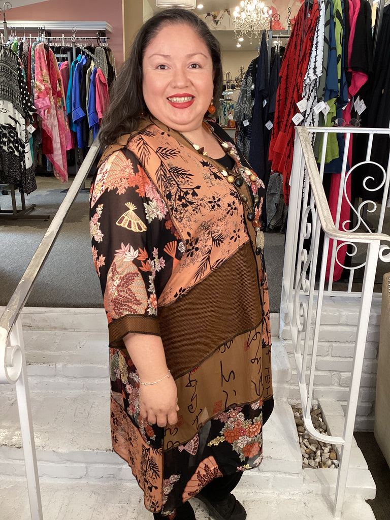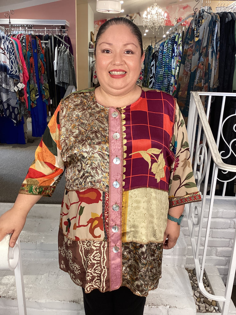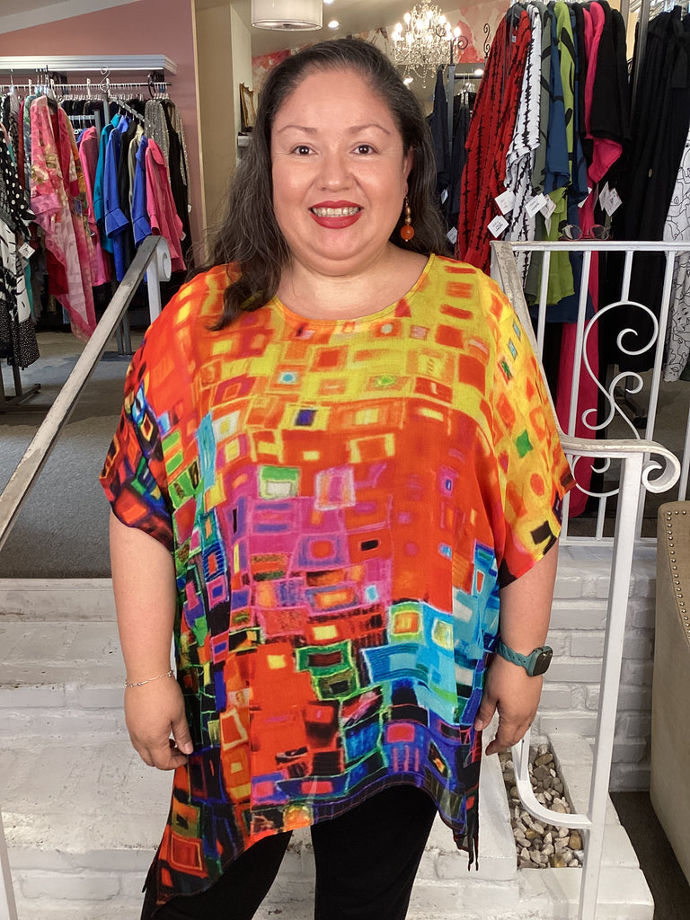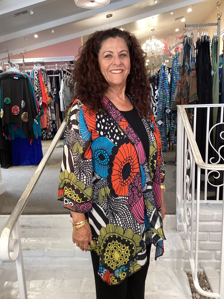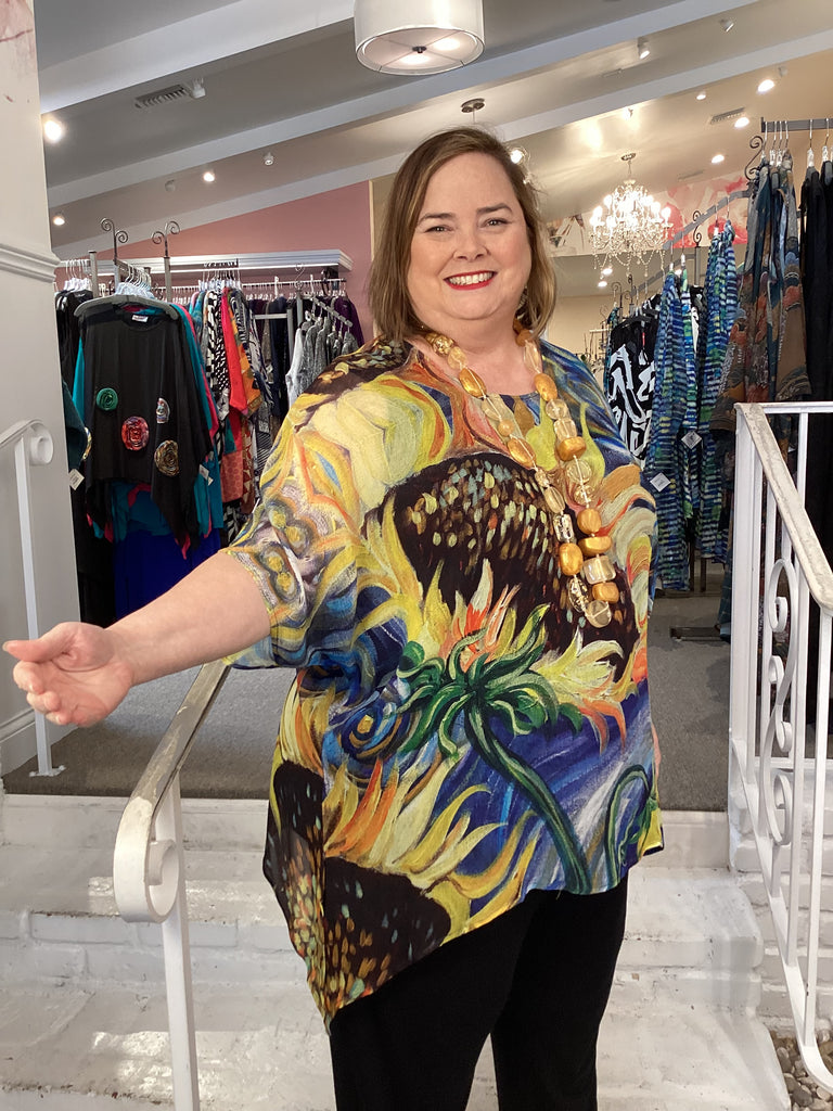 We love the Happy Coat. Feel good and happy in this button down tunic with a variety of colors and patterns. Whisper tunics are a hi-low style and fit to a 4x.