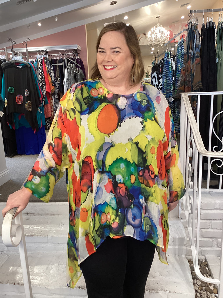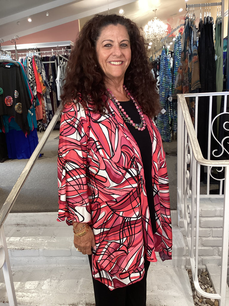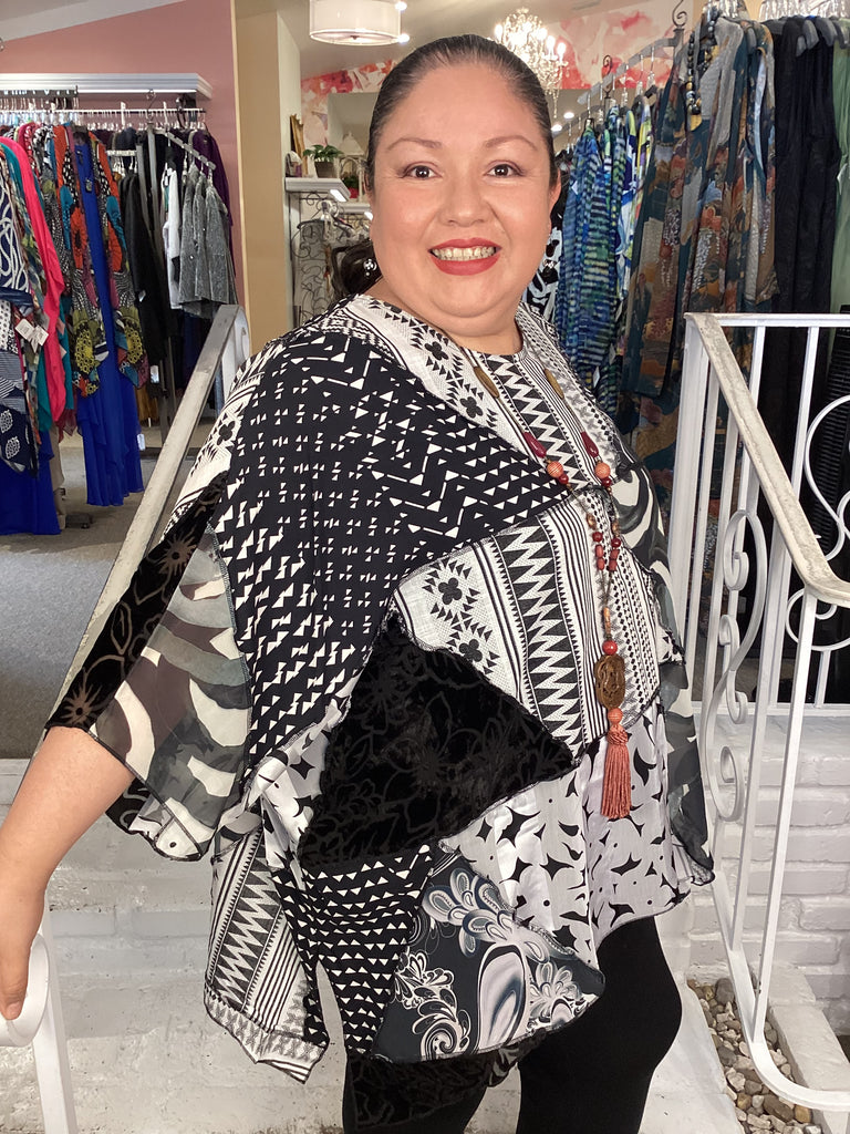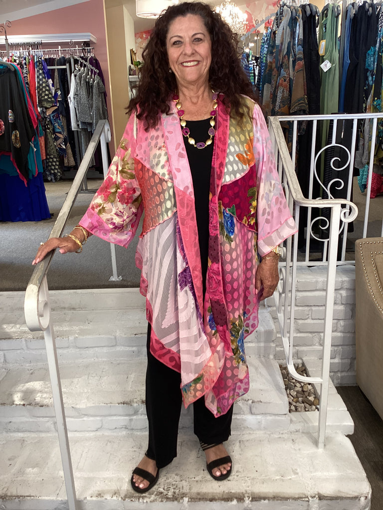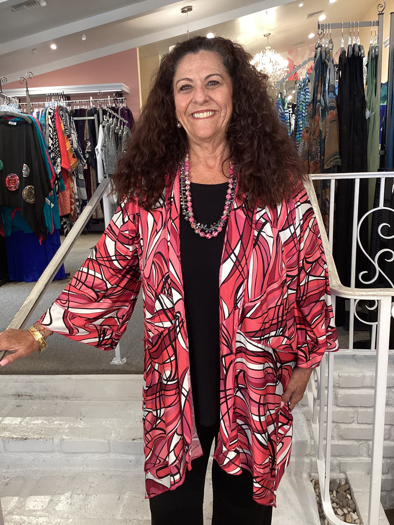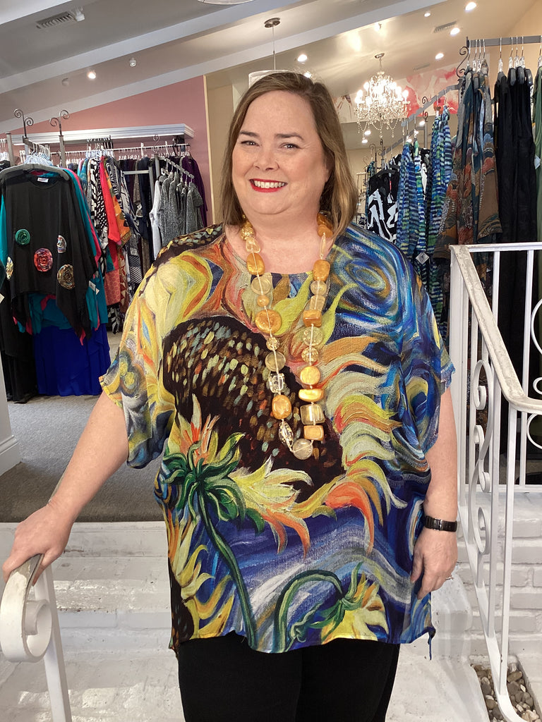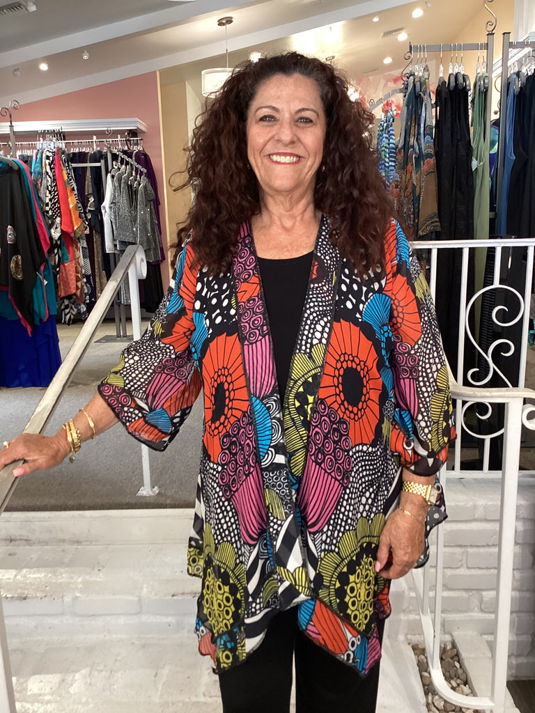 We love the Happy Coat. Feel good and happy in this button down tunic with a variety of colors and patterns. Whisper tunics are a hi-low style and fit to a 4x.