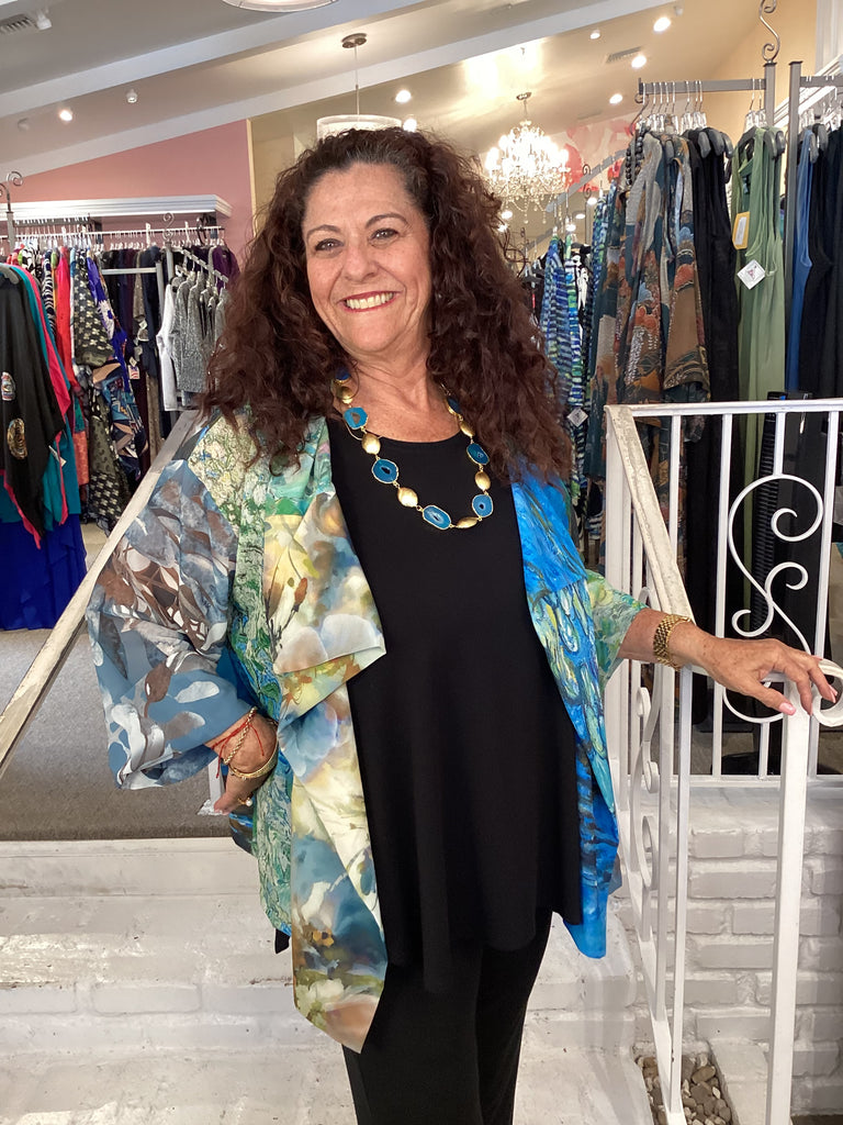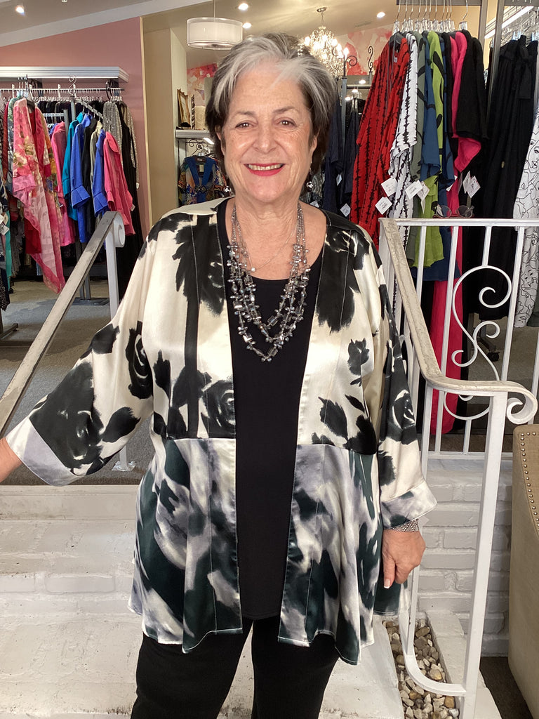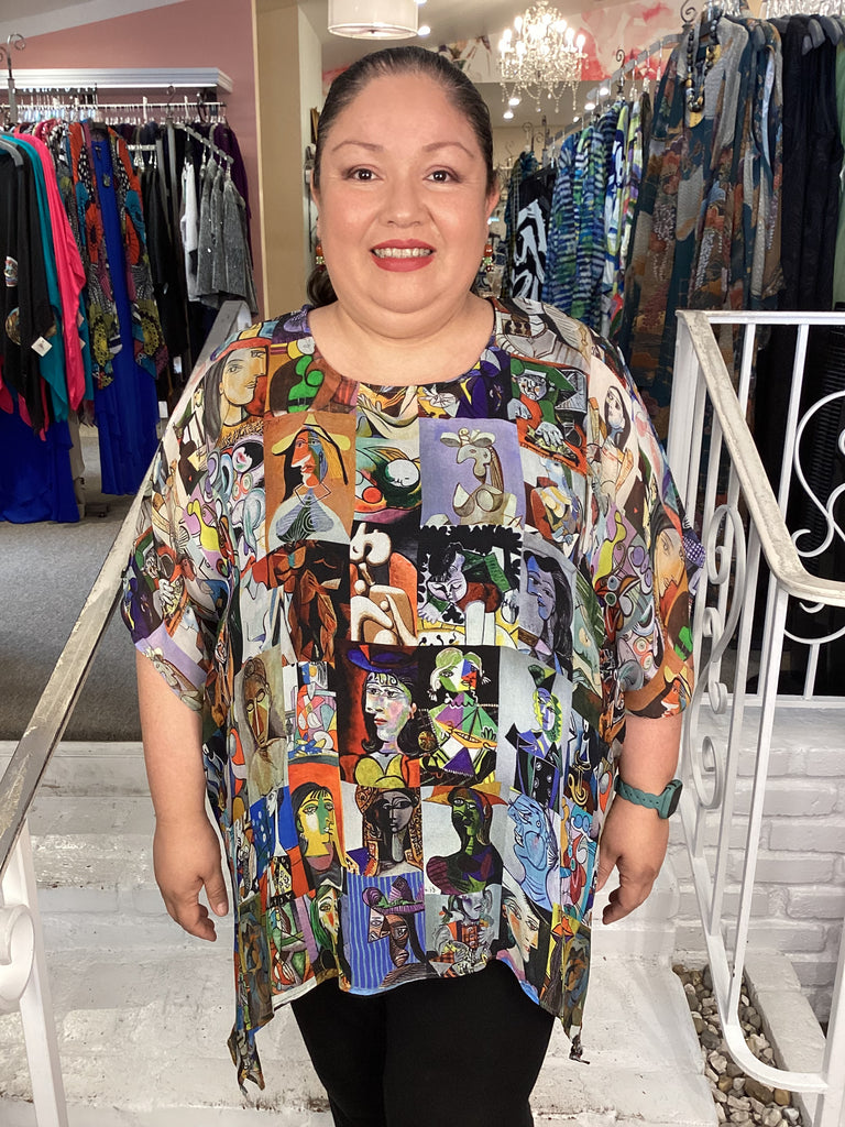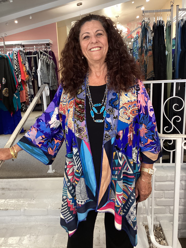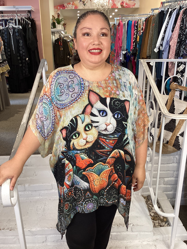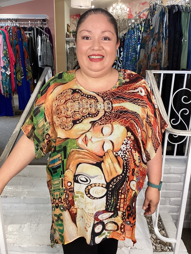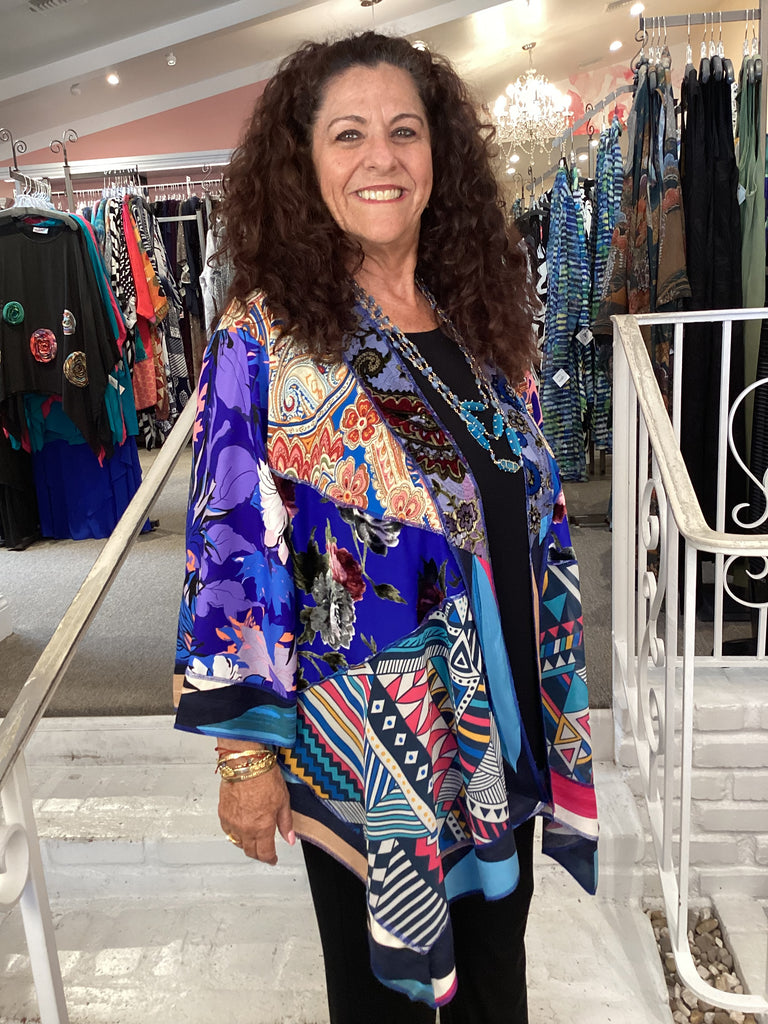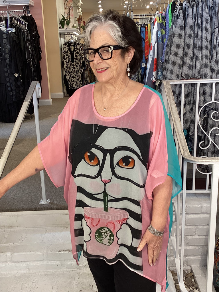 We love the Happy Coat. Feel good and happy in this button down tunic with a variety of colors and patterns. Whisper tunics are a hi-low style and fit to a 4x.
