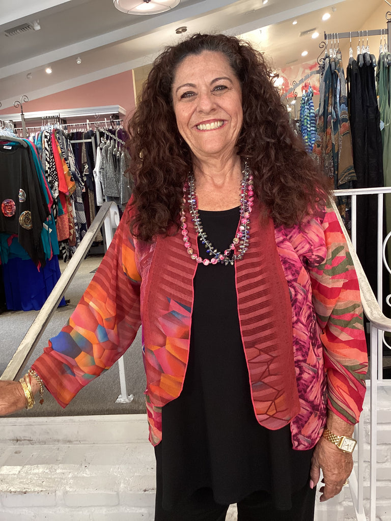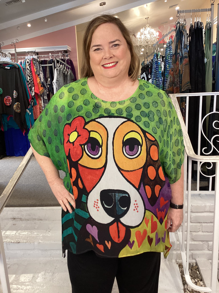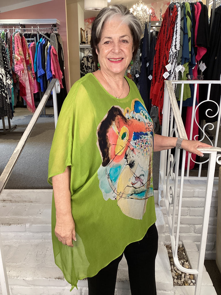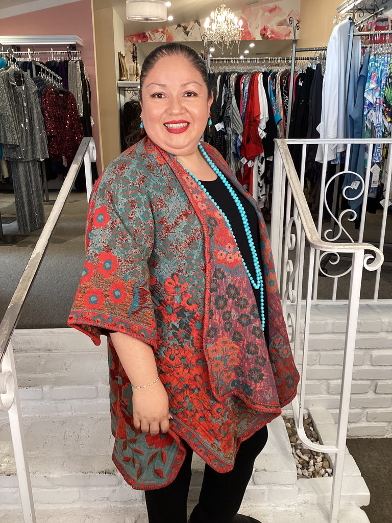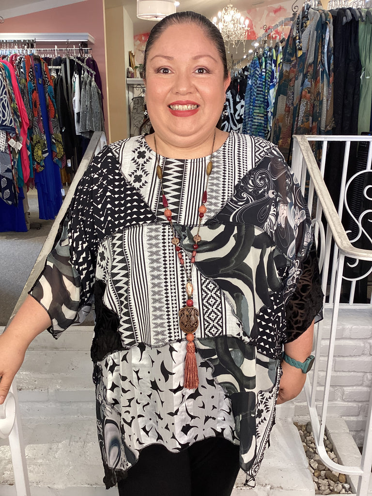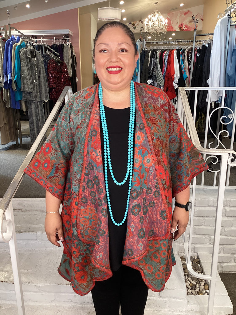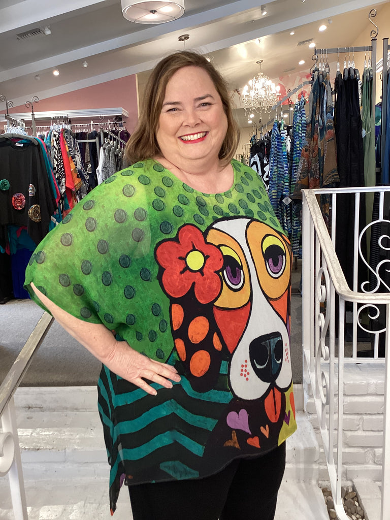 We love the Happy Coat. Feel good and happy in this button down tunic with a variety of colors and patterns. Whisper tunics are a hi-low style and fit to a 4x.