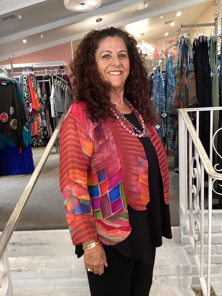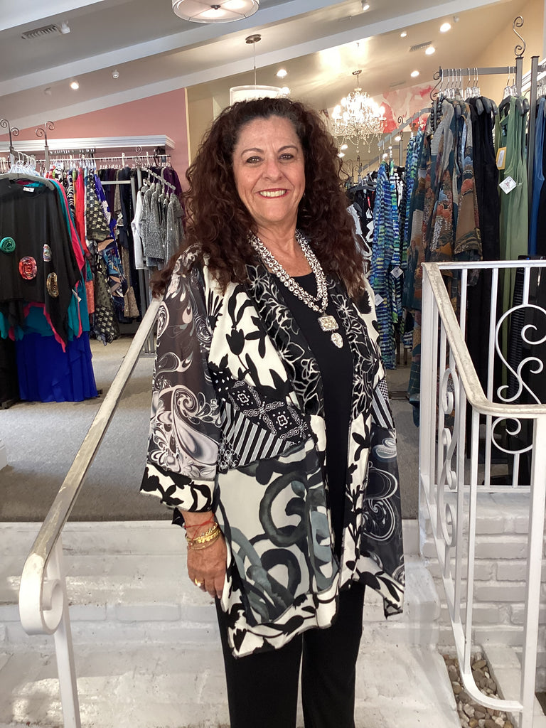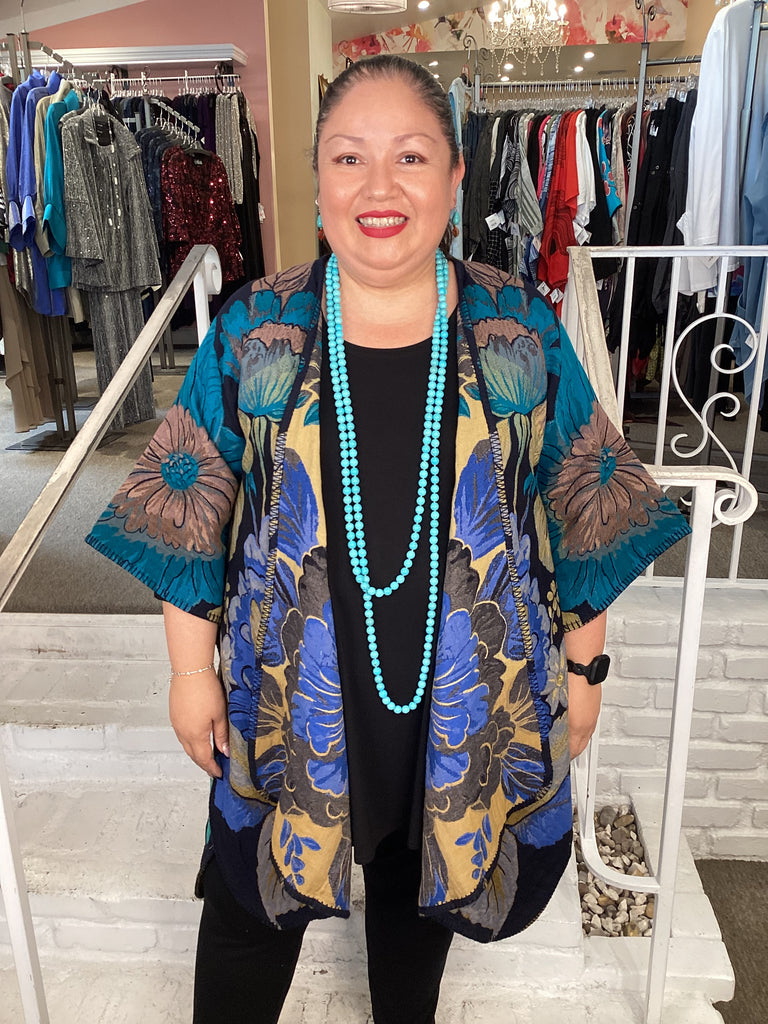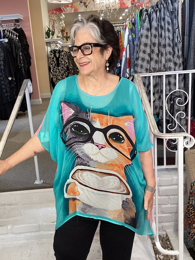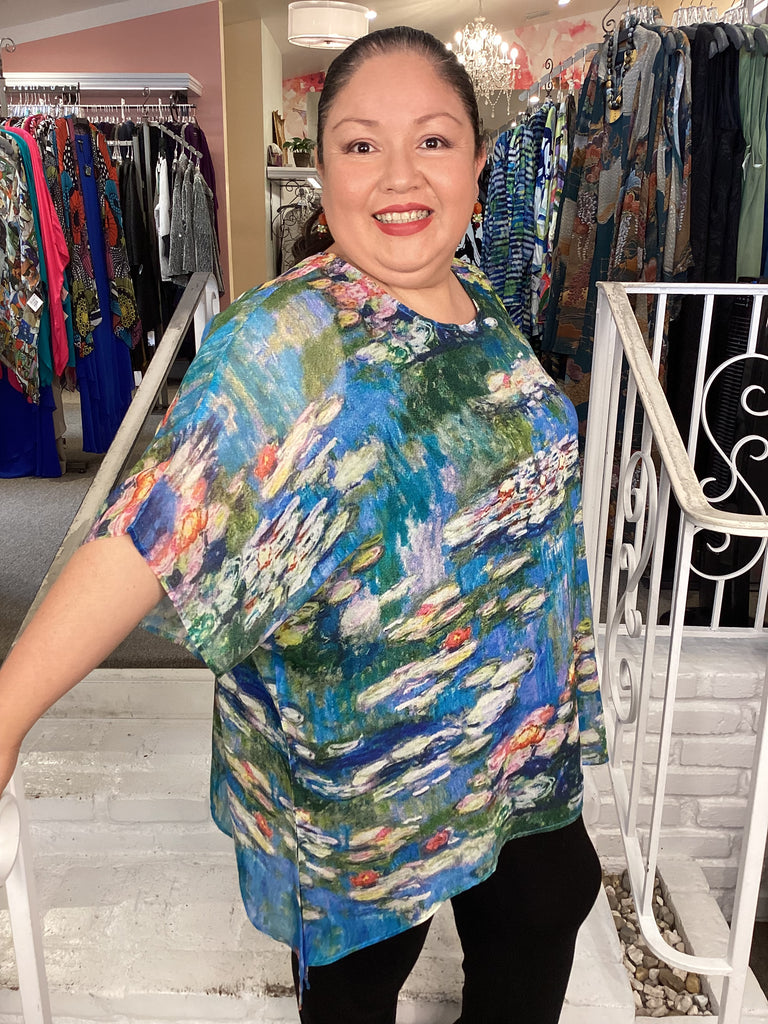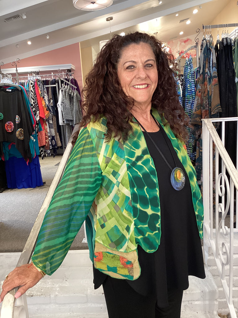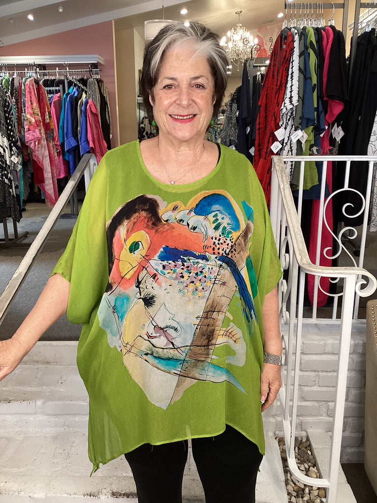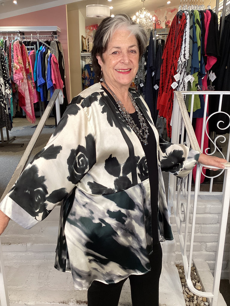We love the Happy Coat. Feel good and happy in this button down tunic with a variety of colors and patterns. Whisper tunics are a hi-low style and fit to a 4x.