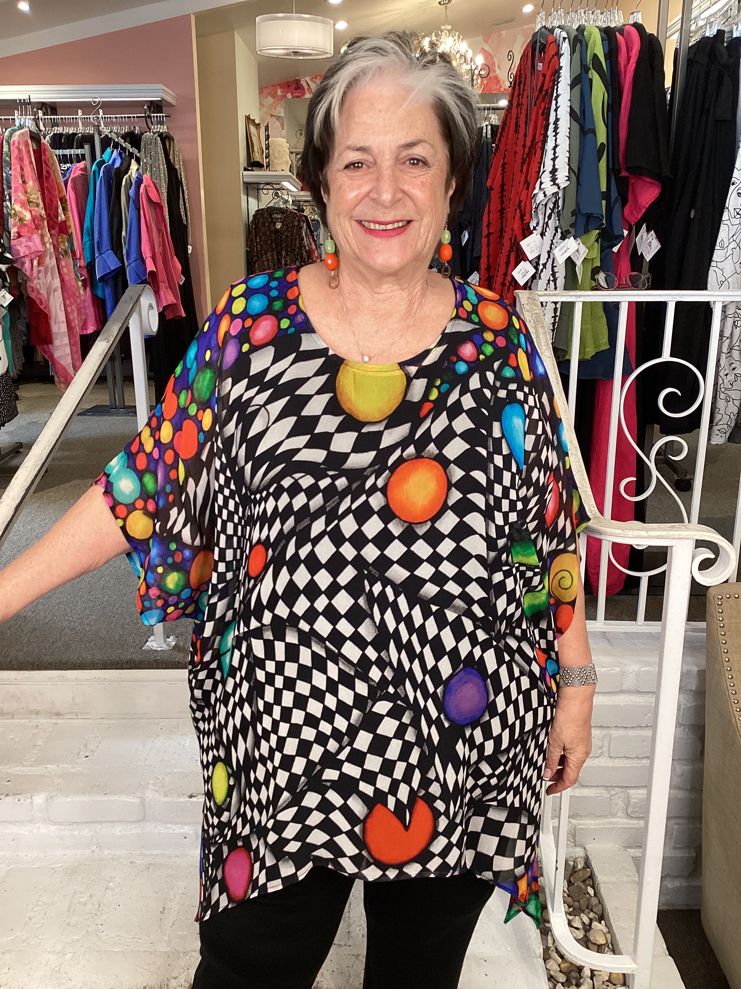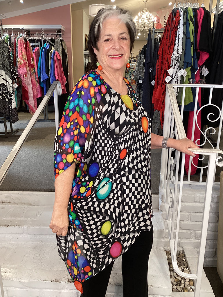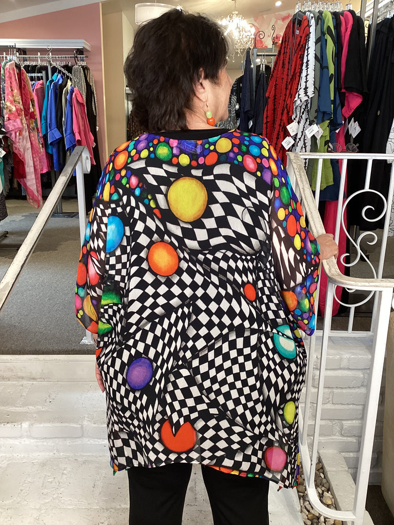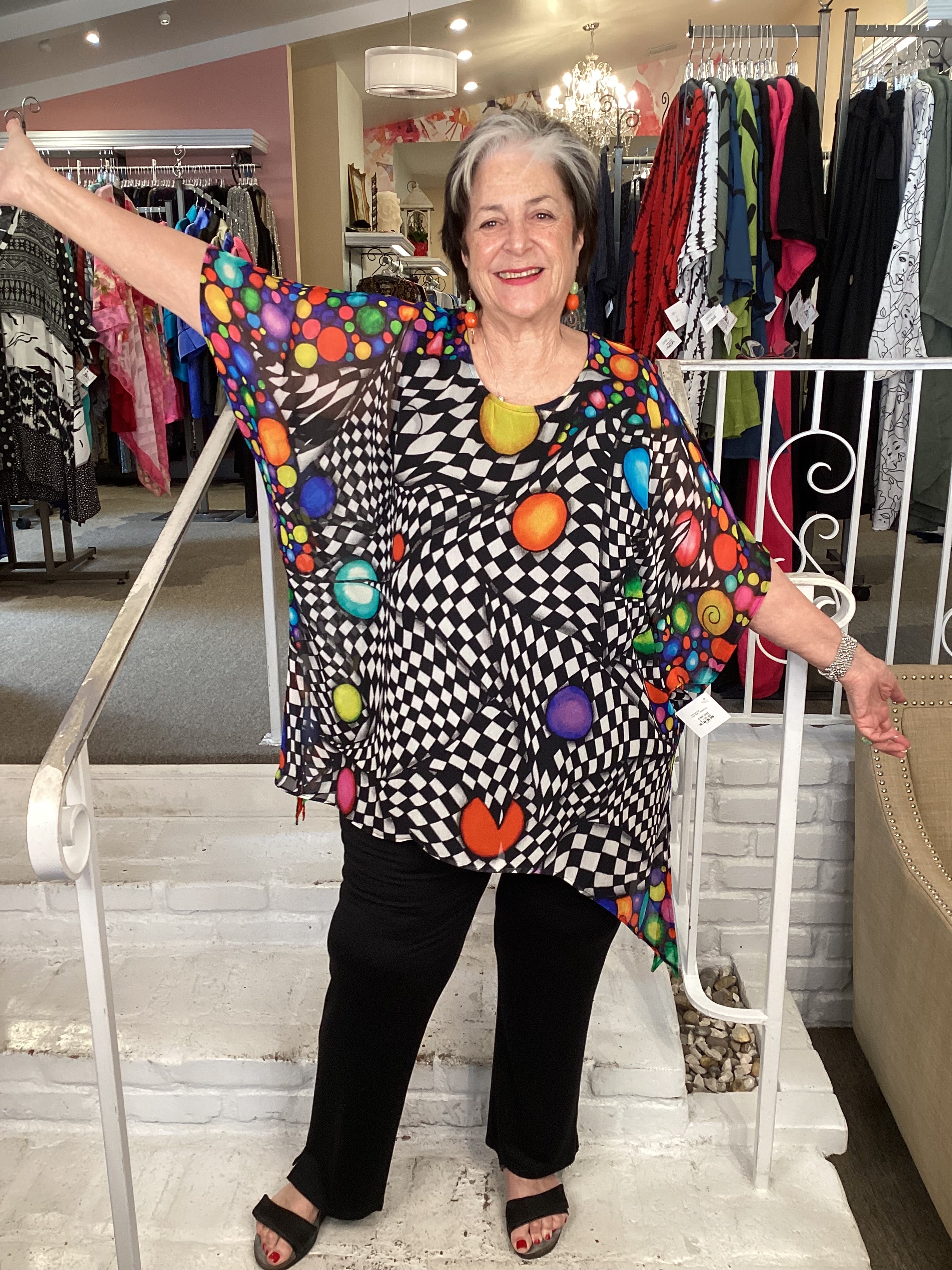 Stunning and colorful graphic print on chiffon top. Round neckline, generous sleeve opening that drops just below the elbow. This square shaped piece has side seam points that drape down or can be knotted for a little more style. Our 1X model wears this one size top with plenty of room.