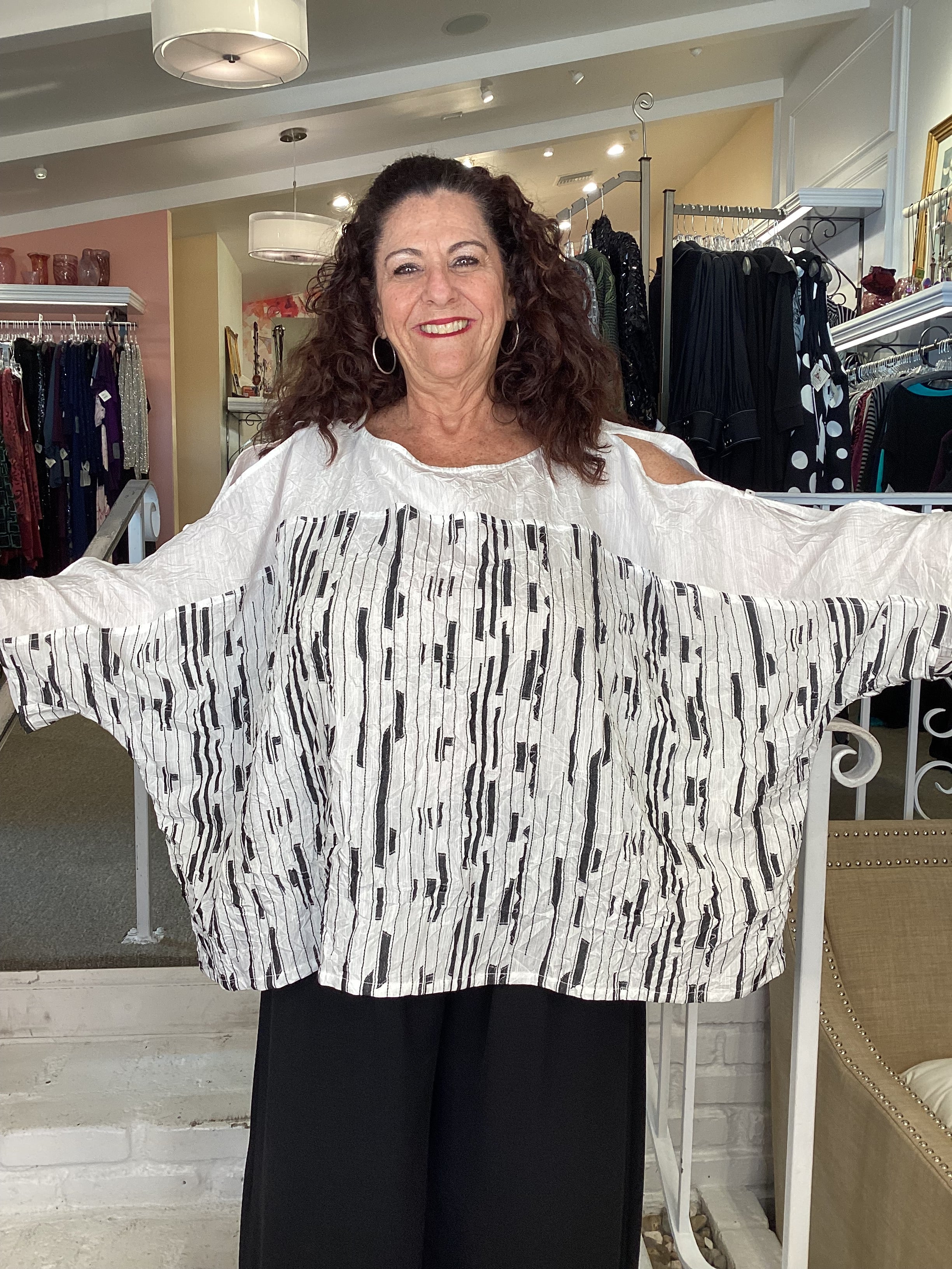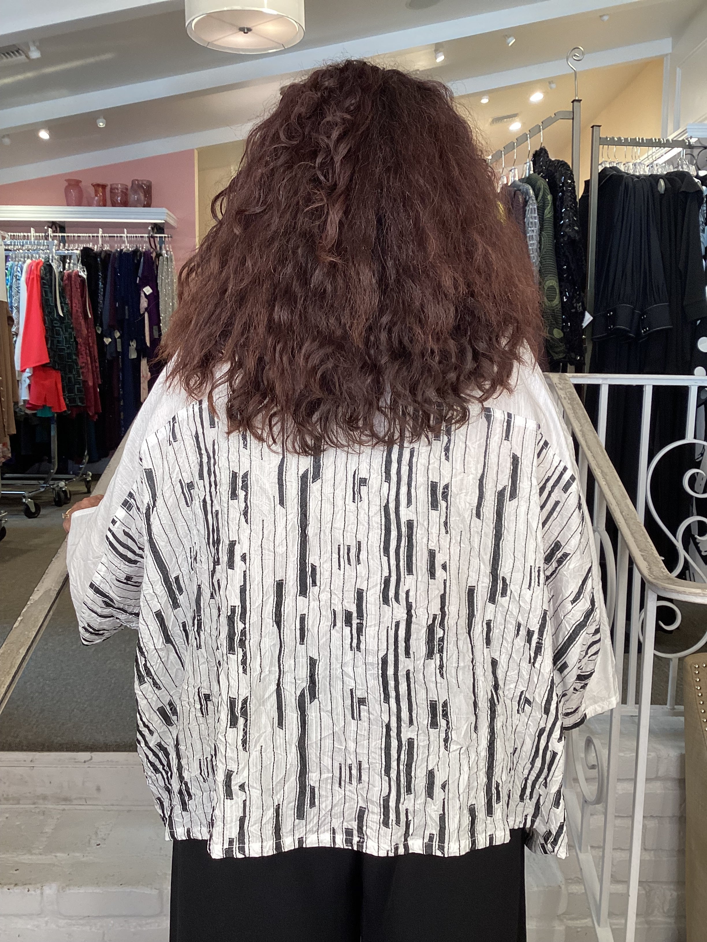 This soft square shaped crepe piece with an open slit sleeves in a crinkled white fabric printed with unique black stripes pattern. Missy size bust 60"/ length 24", Plus size bust 72"/ length 25"
