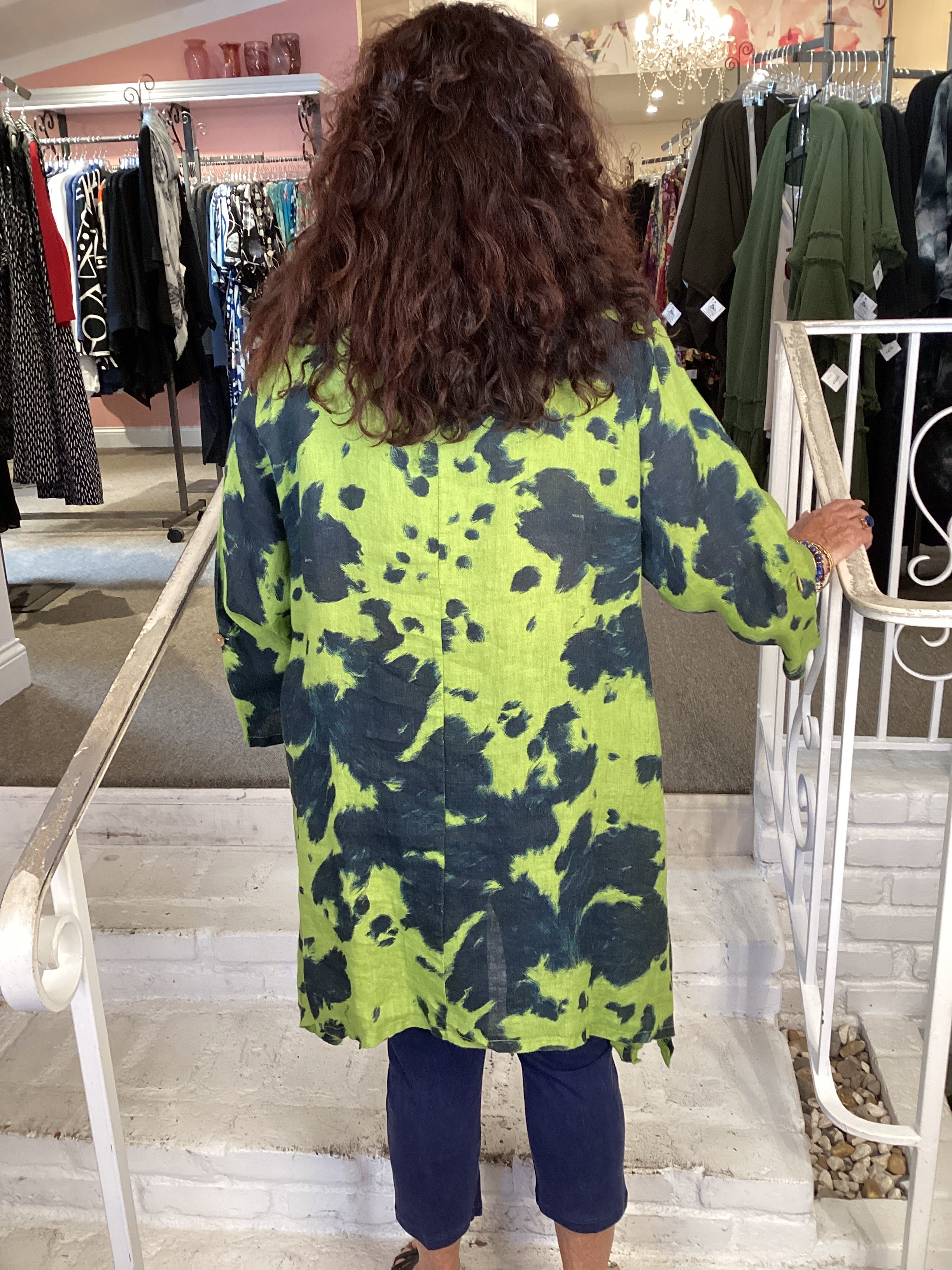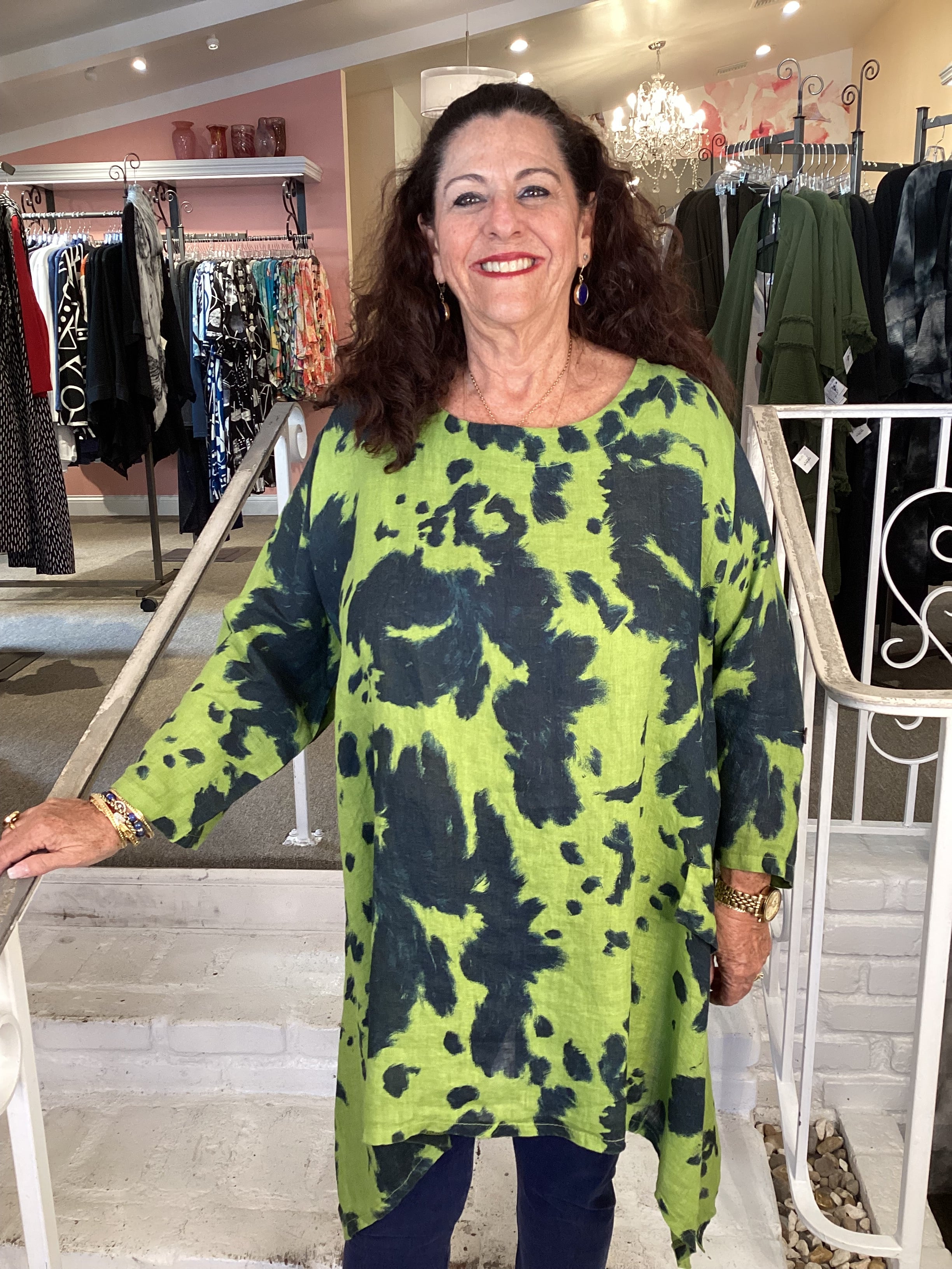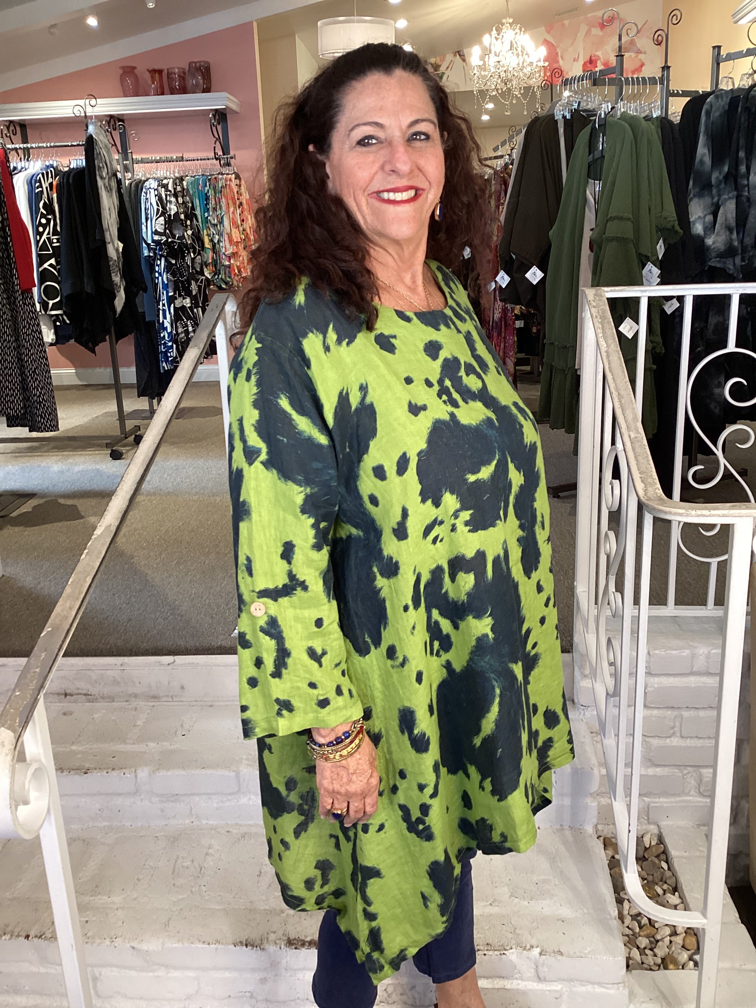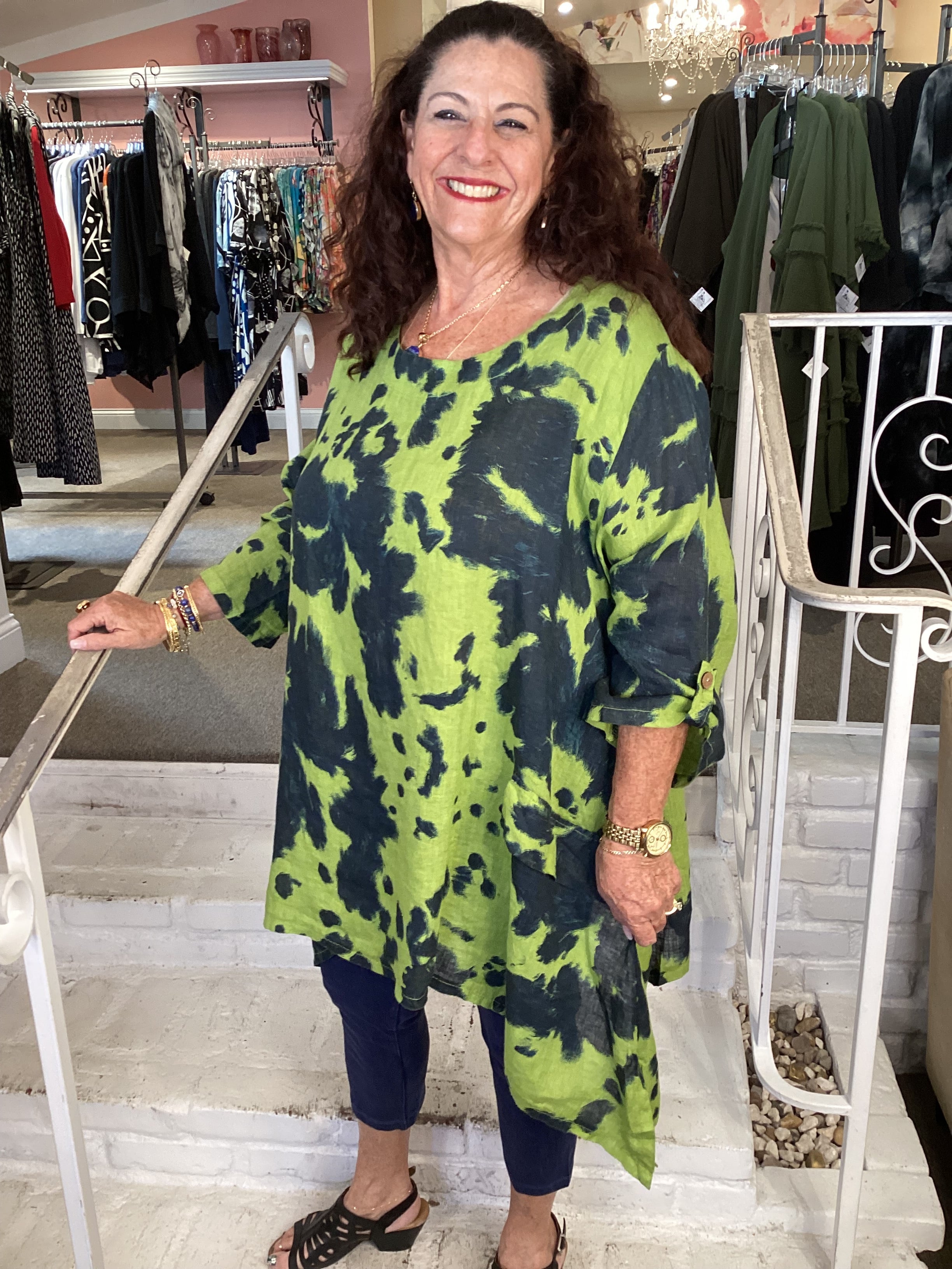 This could be your perfect summer tunic from Transparente!! Light weight linen, a-line silhouette, round neckline and 3/4 sleeves with epaulets. A bold navy/black print on kiwi and faux pocket flap makes a unique piece for your summer wardrobe. The bust measures about 48" and the center length is 31", draping down on the sides.