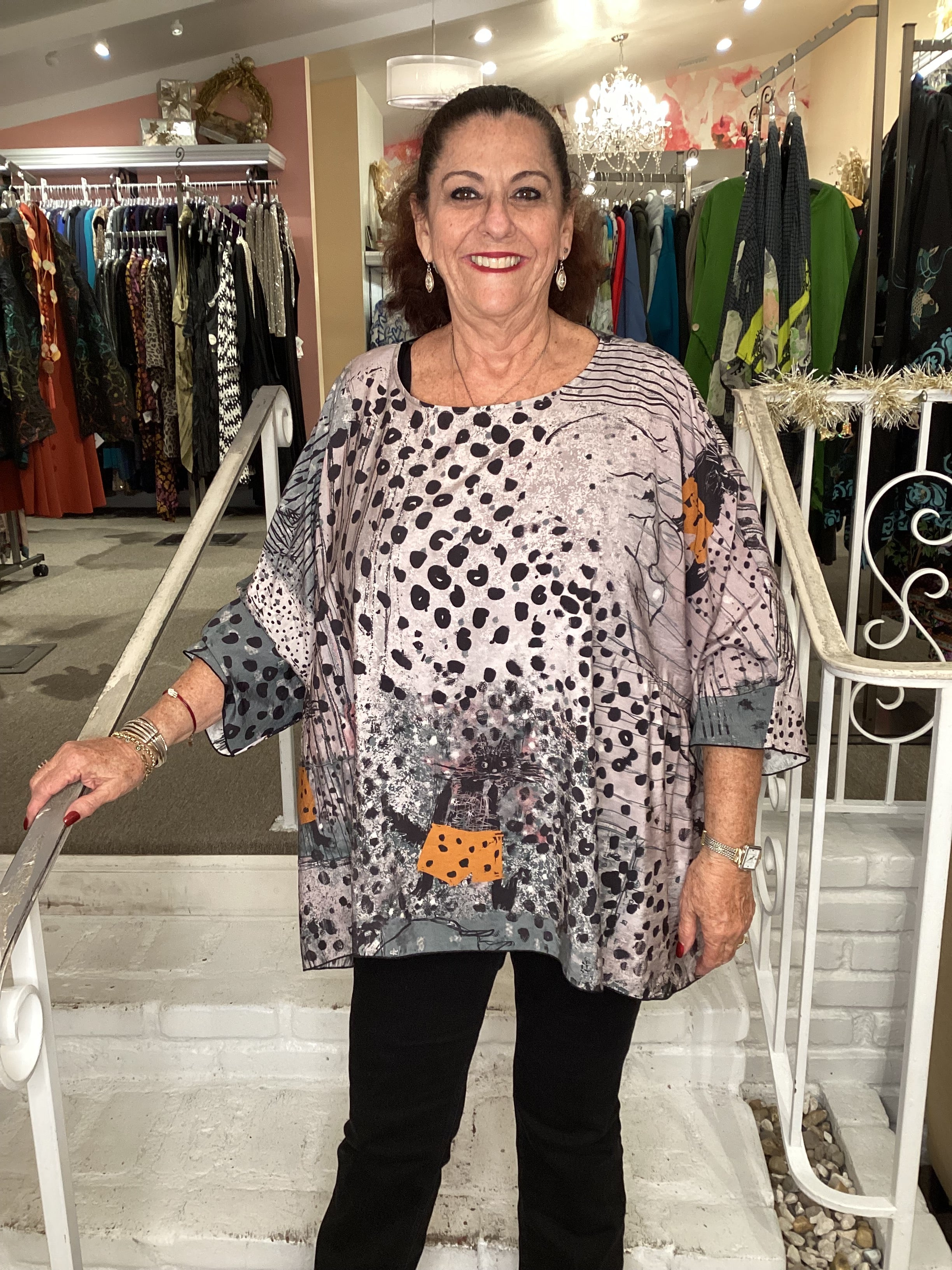 Colorful artistic patterns and easy to wear styles are the trademarks of 3 Potato clothing. The Artisan Butterfly Top is whisper thin with a relaxed fit, a wide round neckline and three quarter length sleeves. A gathered feature just under each arm adds subtle shaping to the body. The flowy hemline dips a bit longer in the back. Please note, each piece is one of a kind and pattern placement may vary.
