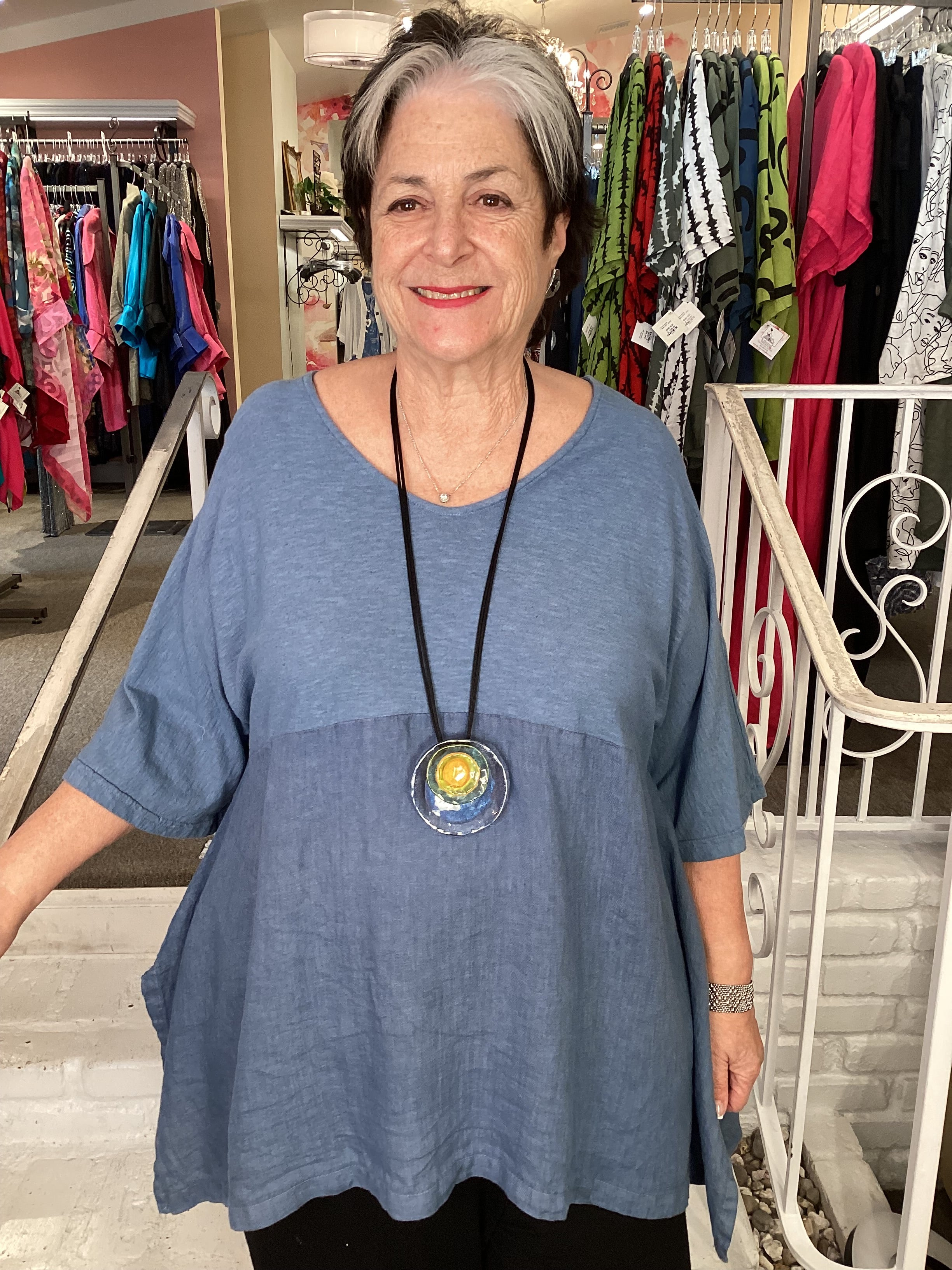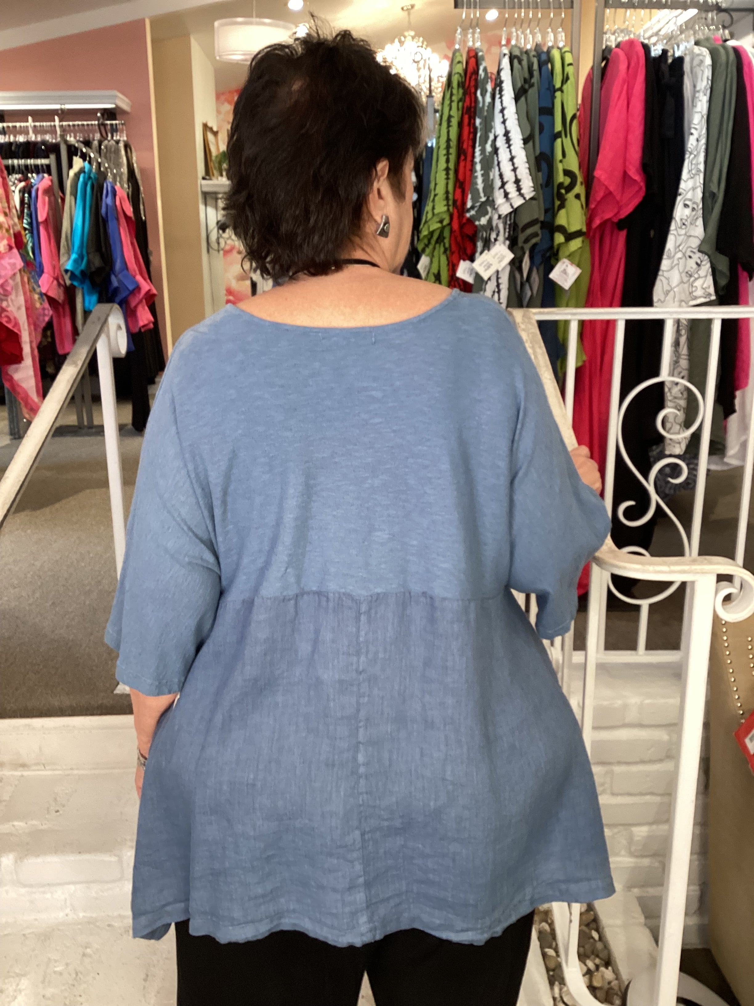 This Cut Loose top will become your go-to and pairs perfectly with everything. Cut Loose brought back the Artist Top after a hiatis, we are so happy to see it again. This top offers excellent coverage in a hanky weight linen-cotton combination. This top is a generous cut and falls in a figure flattering way. Elbow length sleeves keep you covered but cool, other details include a V-neckline, curved hemline with side slits and an empire waist.