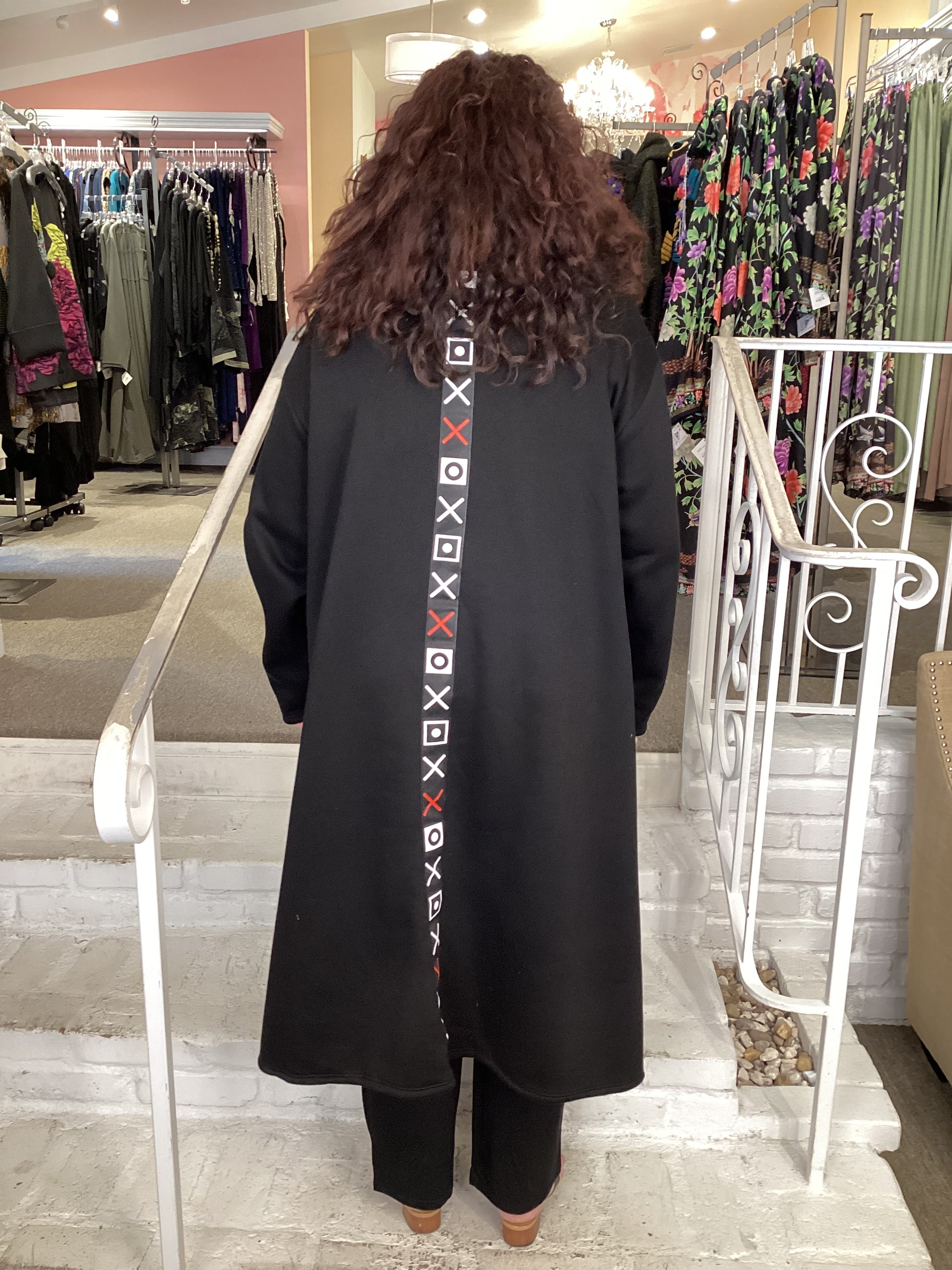 This black sweatshirt tunic offers both comfort and style with a cowl neck that includes an adjustable drawstring for a tailored fit. Its long sleeves ensure warmth, while the hi-low hemline creates a modern, flattering shape. Practical two front pockets enhance functionality, and a distinctive strip down the back featuring XO adds a subtle yet stylish detail.