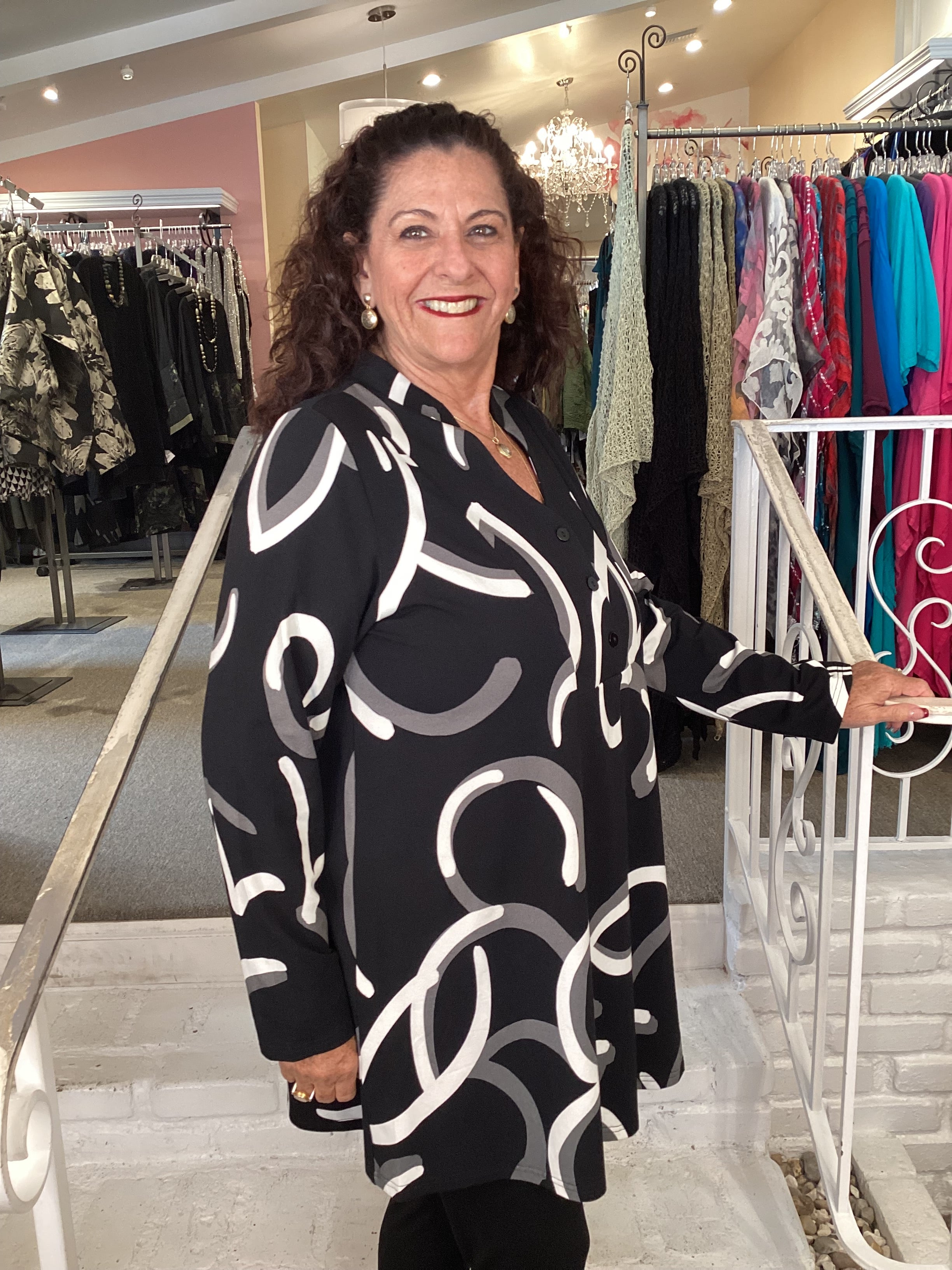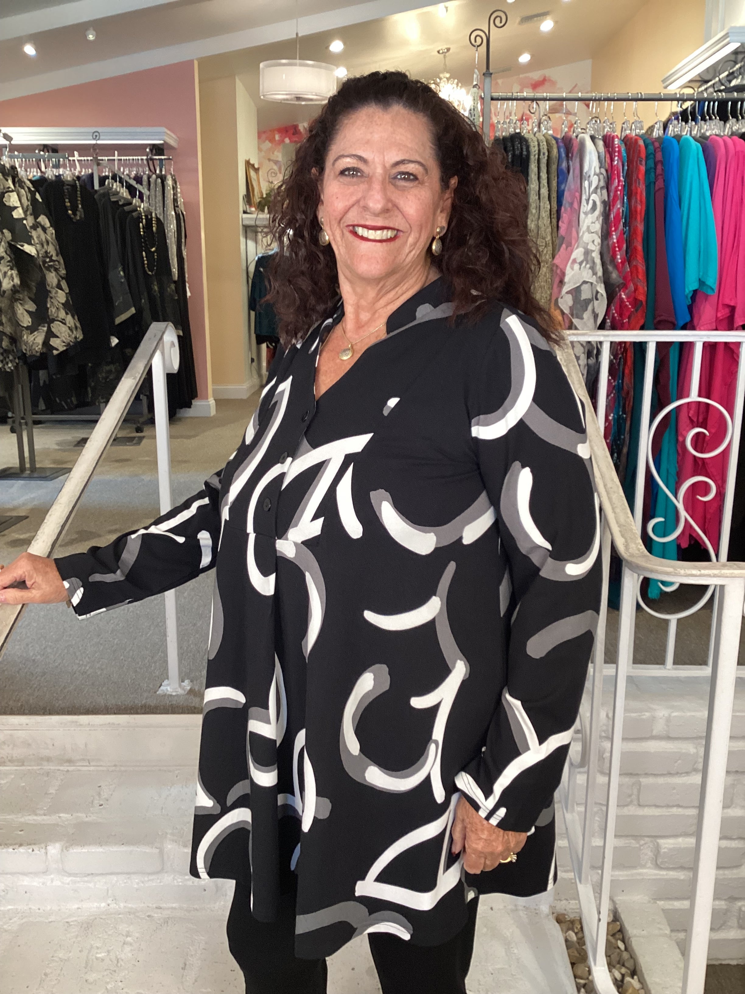 This light weight a-line tunic is very generous at the hips and more form fitting on top with inset sleeves. The v-neck is accented with a Mandarin style collar, buttons closure below the bust and a pleat. This black/white/grey print is perfect for year round wear on bamboo/cotton blend knit.