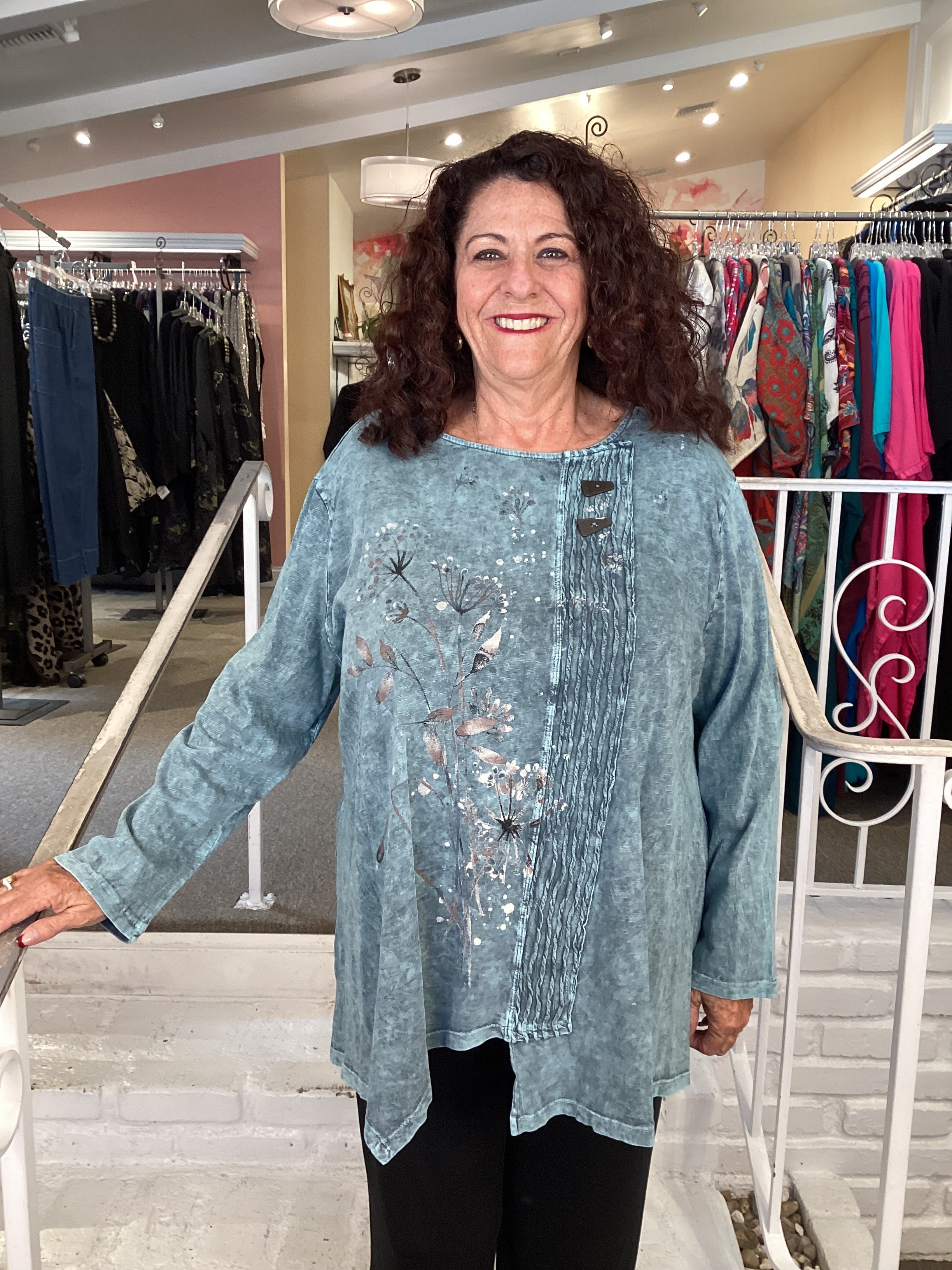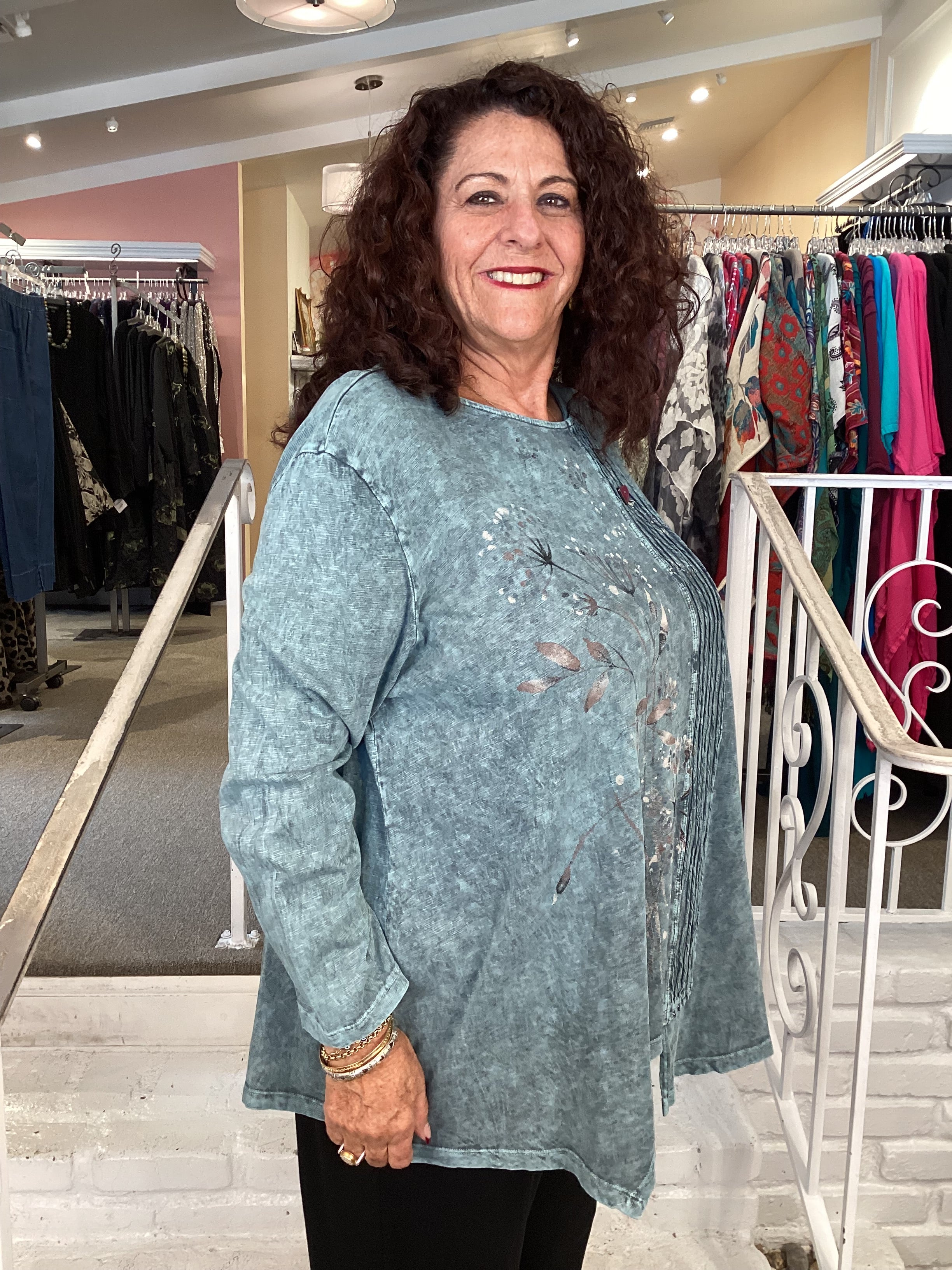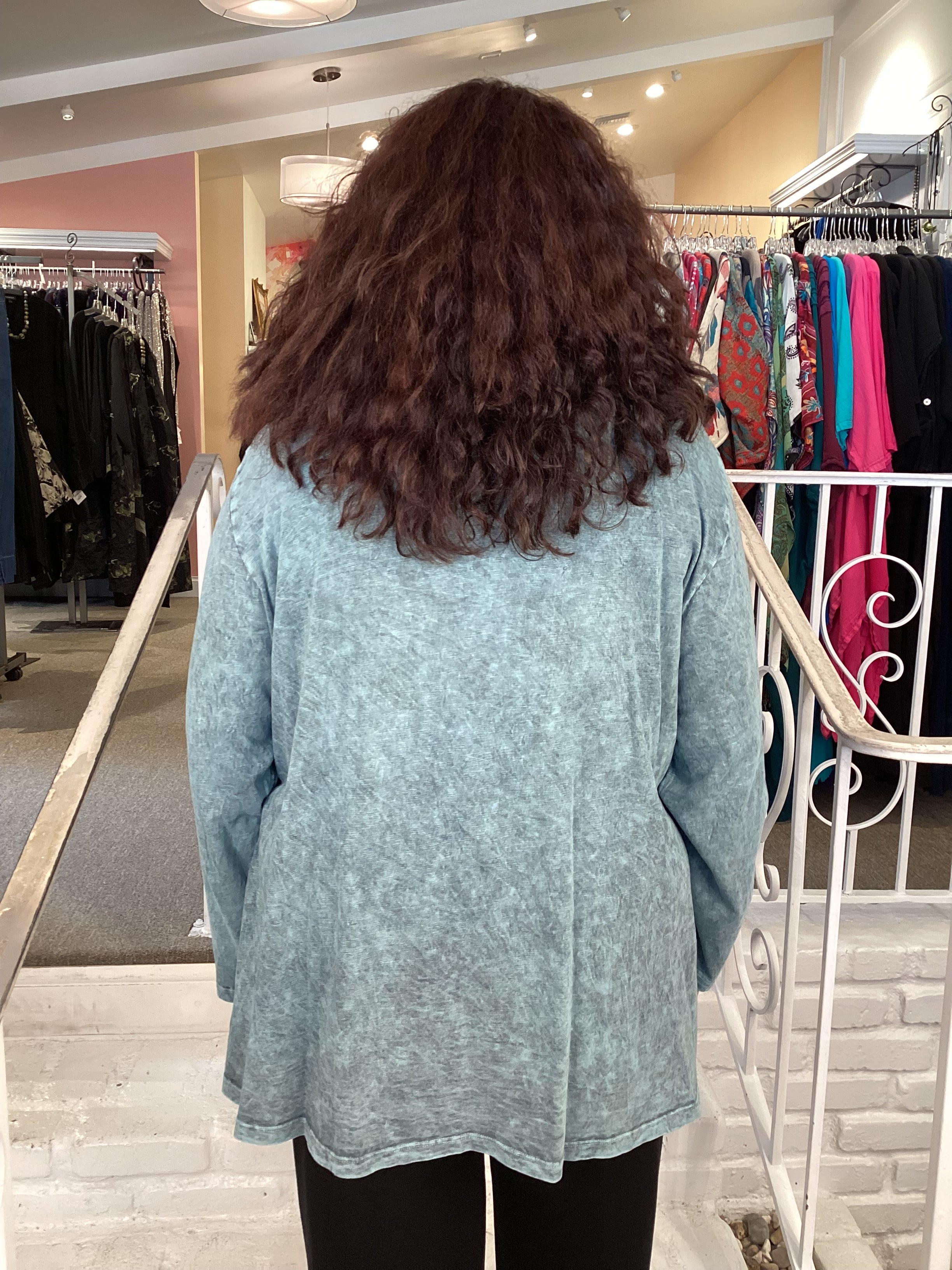 Elevate your wardrobe with our premium FAUX WRAP TUNIC. This mineral washed top features a sophisticated faux wrap design with wavy contrast and two-button detail. The round neckline and full length sleeves add a touch of elegance to this exclusive piece. Made from 100% cotton for luxurious comfort.