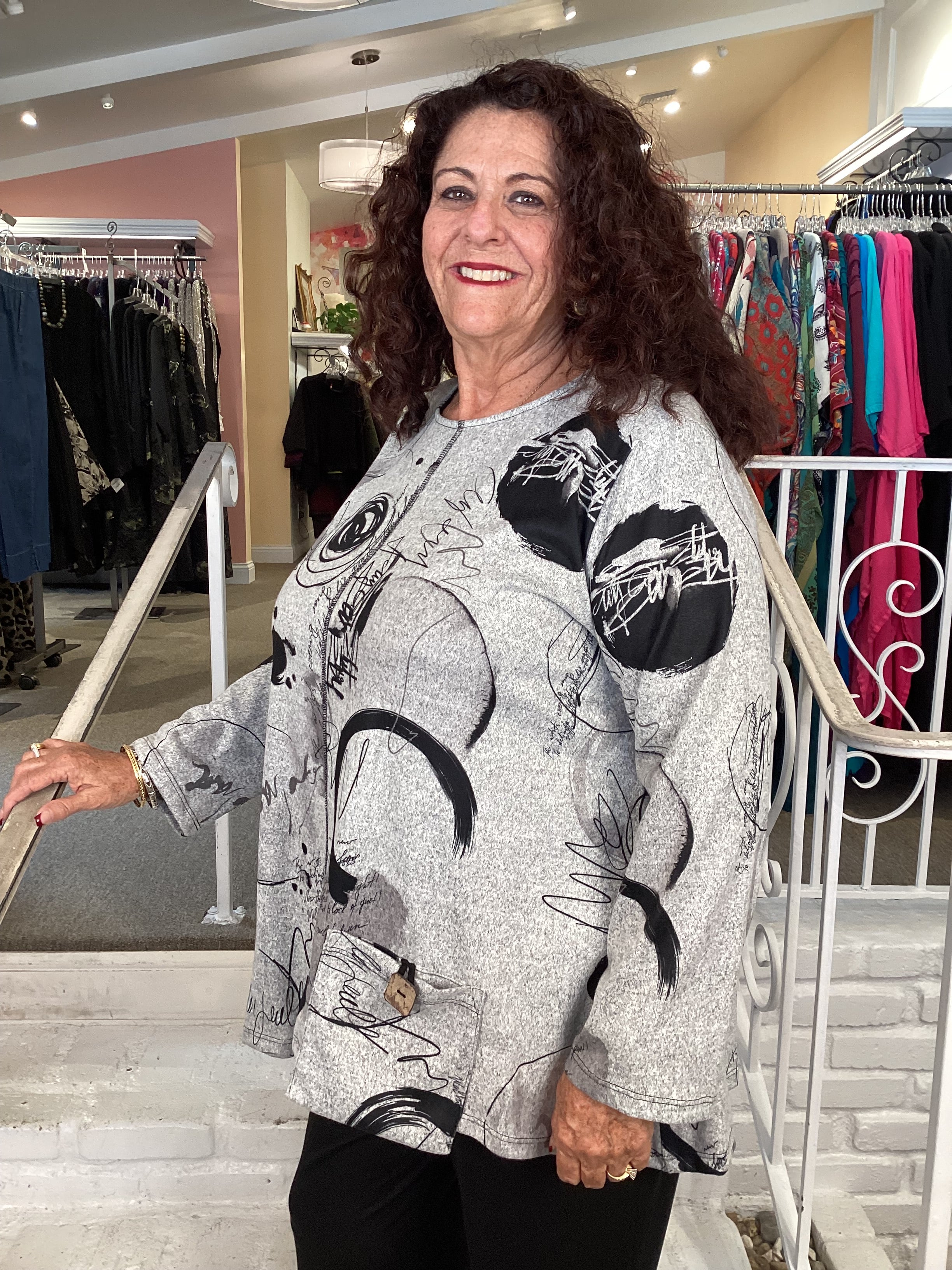 Experience cozy charm with the BRUSH TUNIC. Made from super soft French brushed knit, this fun top shows off a lively abstract design. It has a high round neckline, long sleeves, a front center seam, and a button-detailed patch pocket that extends beyond the hem for a whimsical touch.