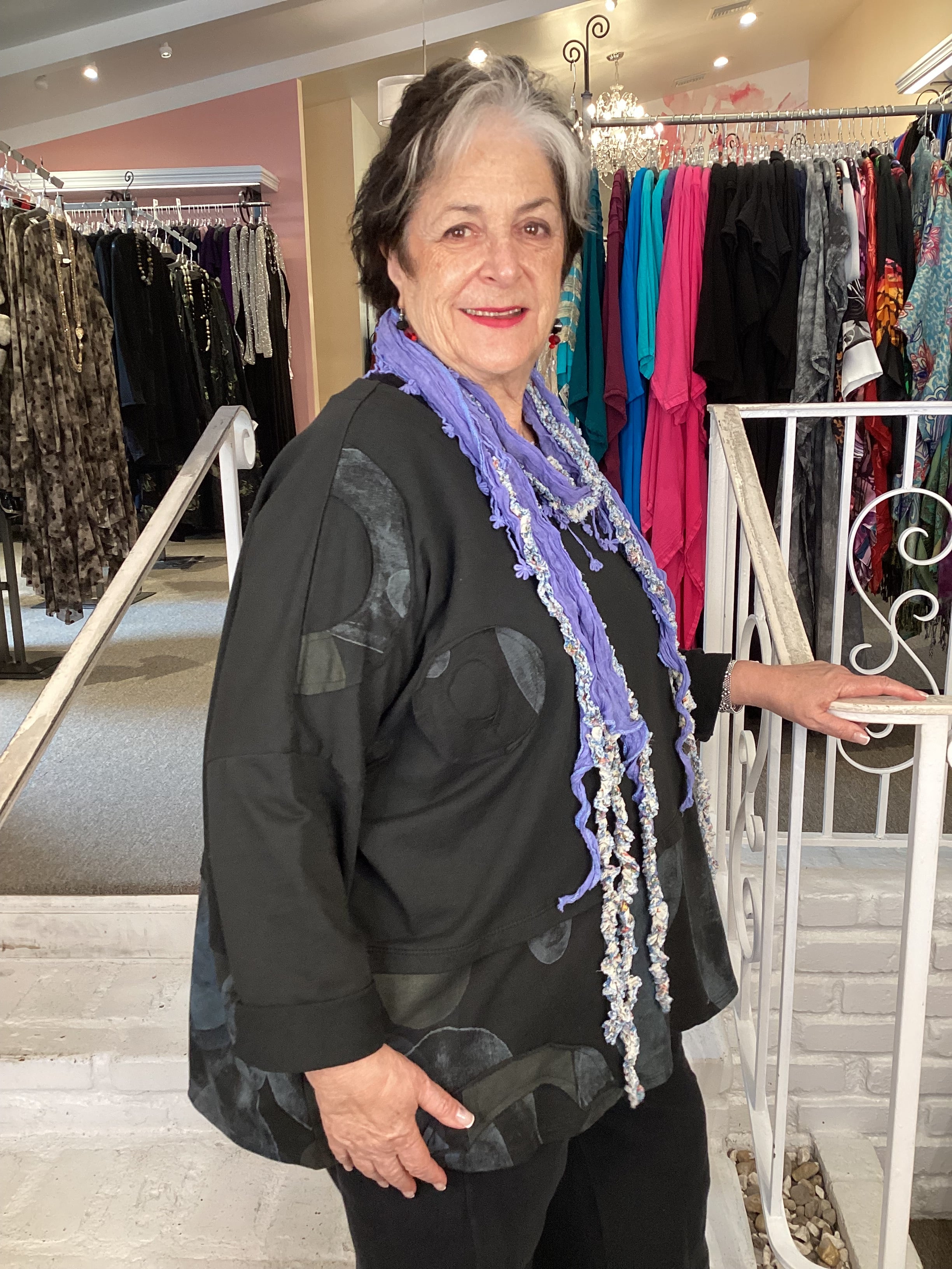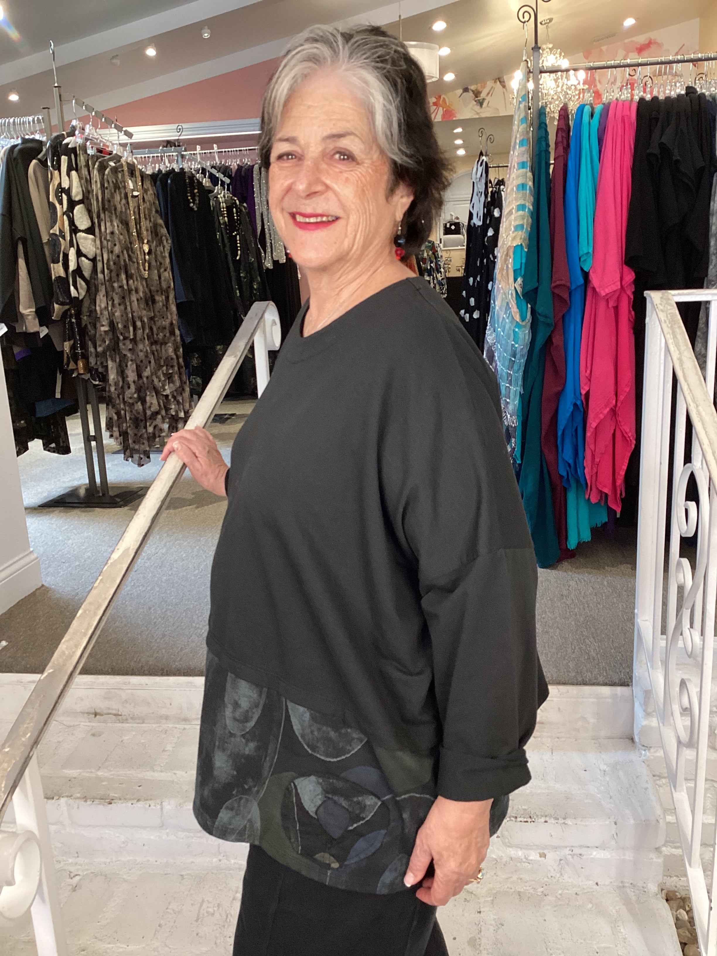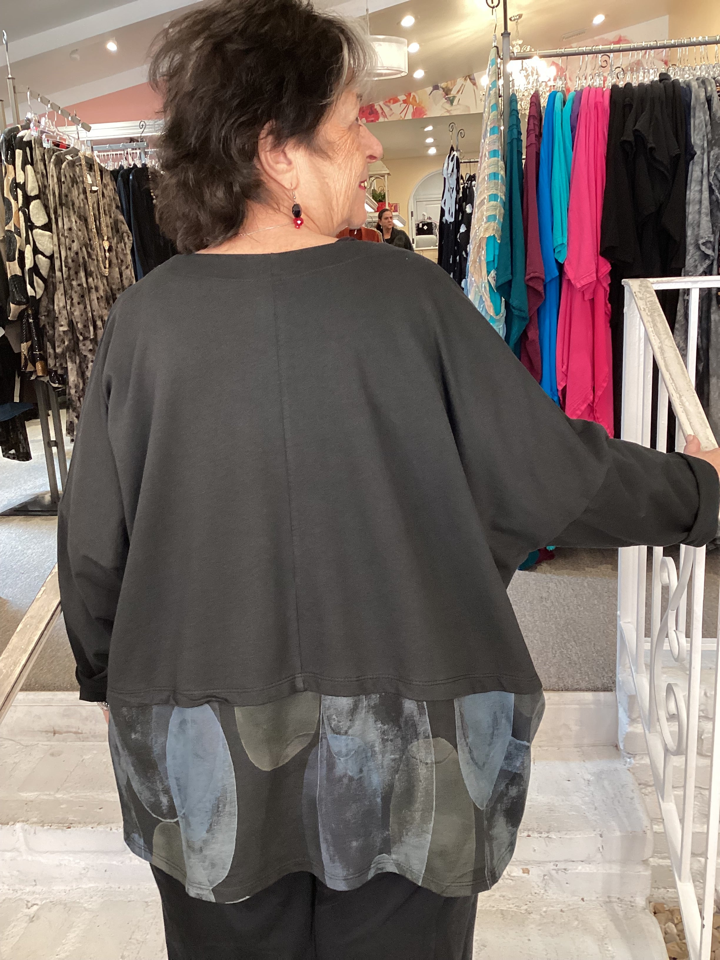 Enjoy this fall French terry sweatshirt in a generous square shape with long sleeves and round neckline. The front hemline is a colorful contrasting fabric and round appliques adorn the front right side. Our 1X/2X model is comfortable in this one size garment.