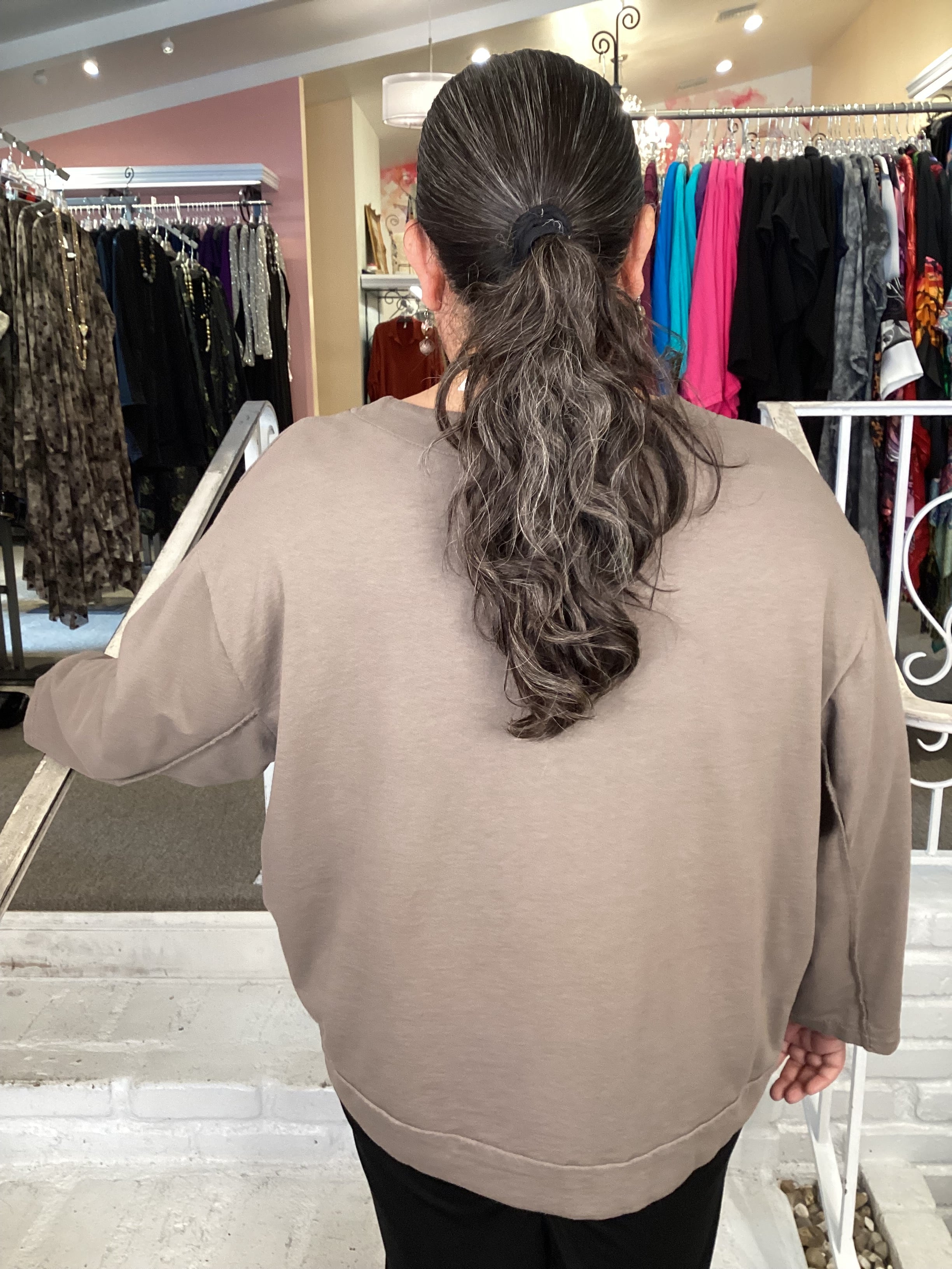 Enjoy this fall French terry sweatshirt in a generous square shape with long sleeves and round neckline. The front panel and sleeves are detailed with overlock seams. Our 1X/2X model is comfortable in this one size garment.
