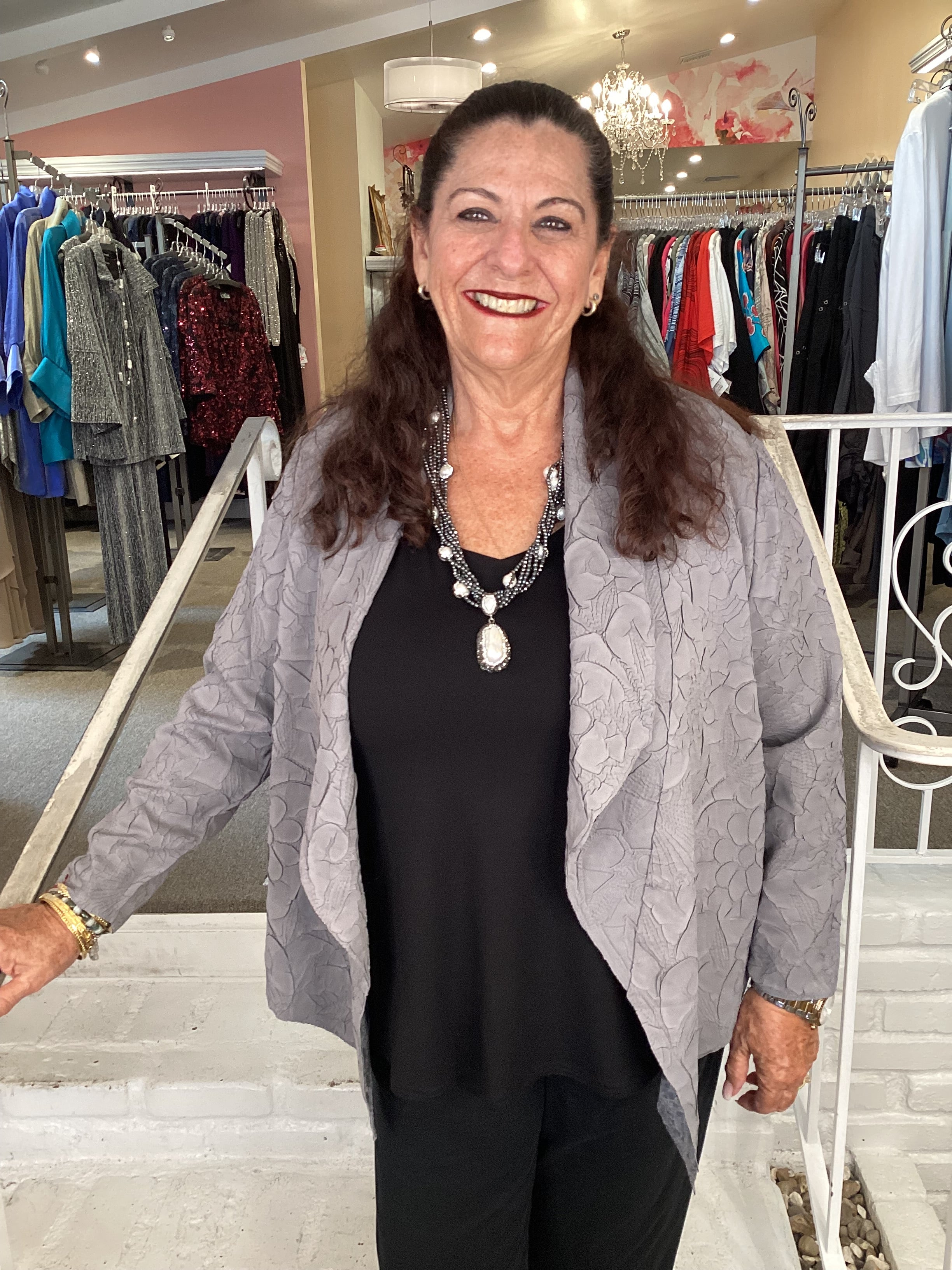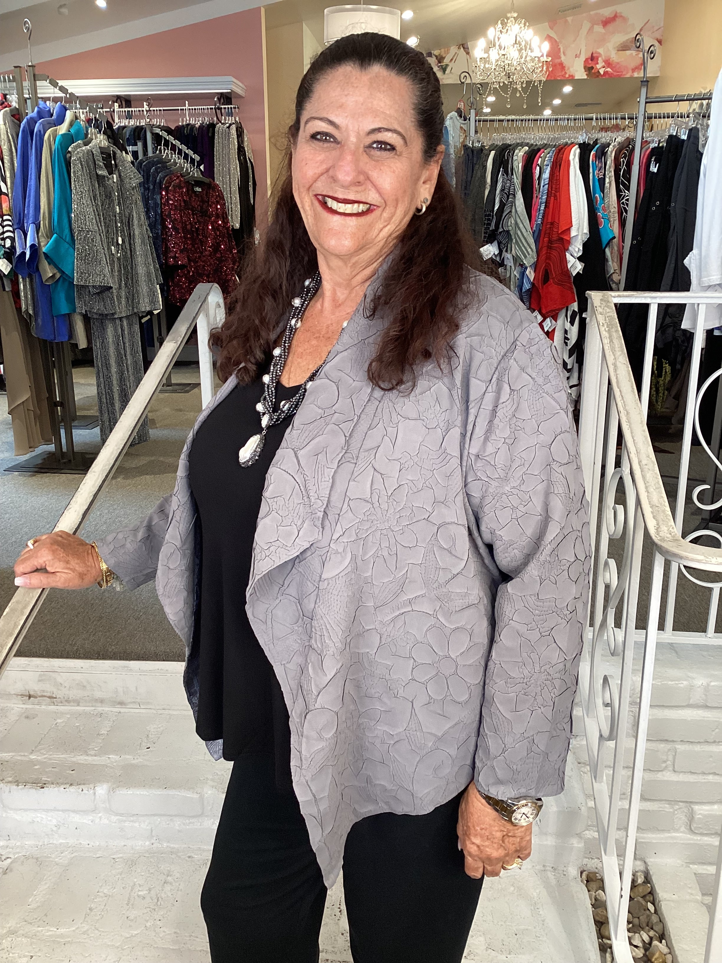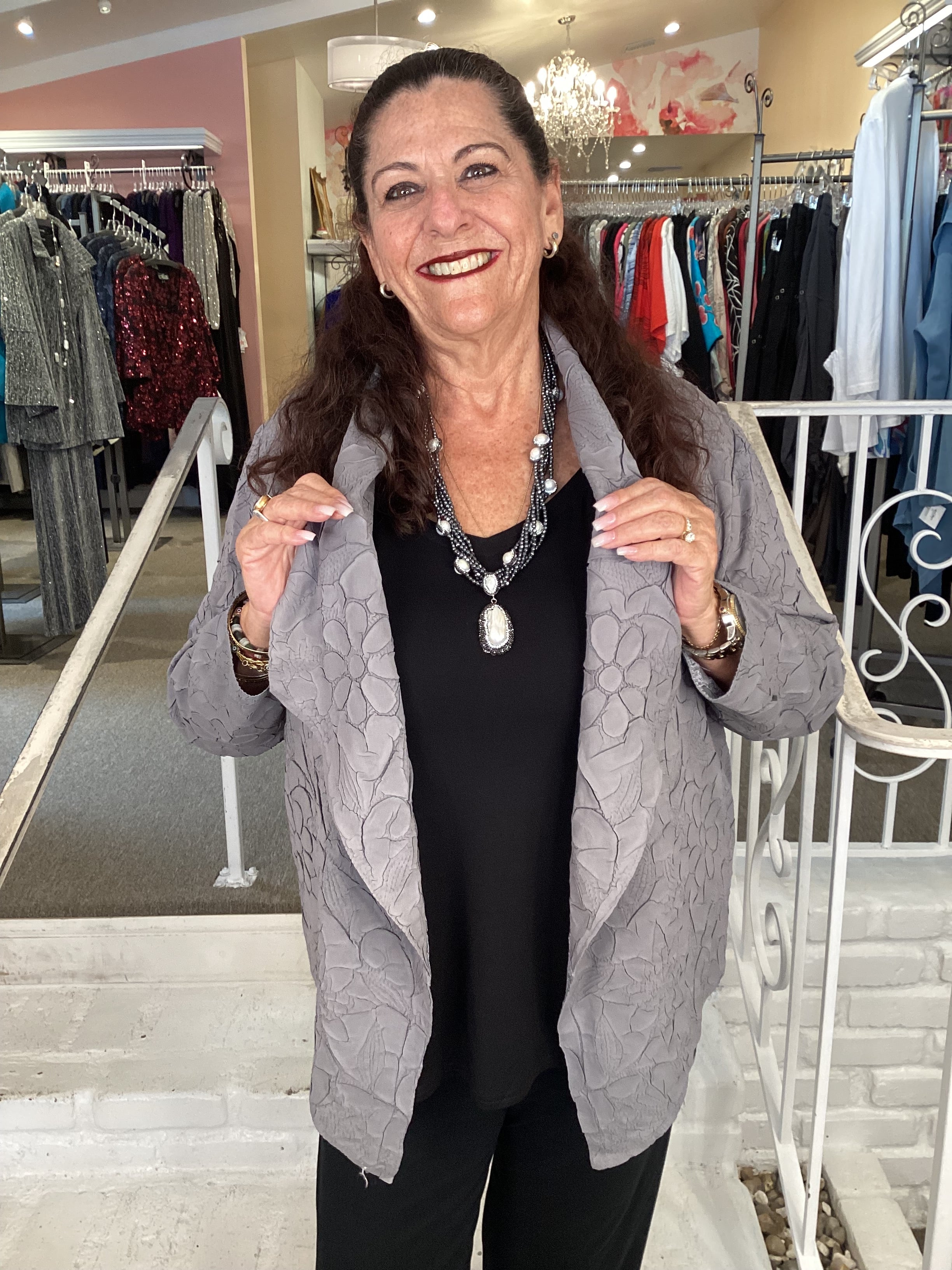 Experience a one-of-a-kind fabric adorned with a floral texture, shimmering in satiny gray for both dressy and laid-back vibes. This open-front jacket features a fold-back lapel, long sleeves, and sharp, pointed front panels for a fun twist on classic style.