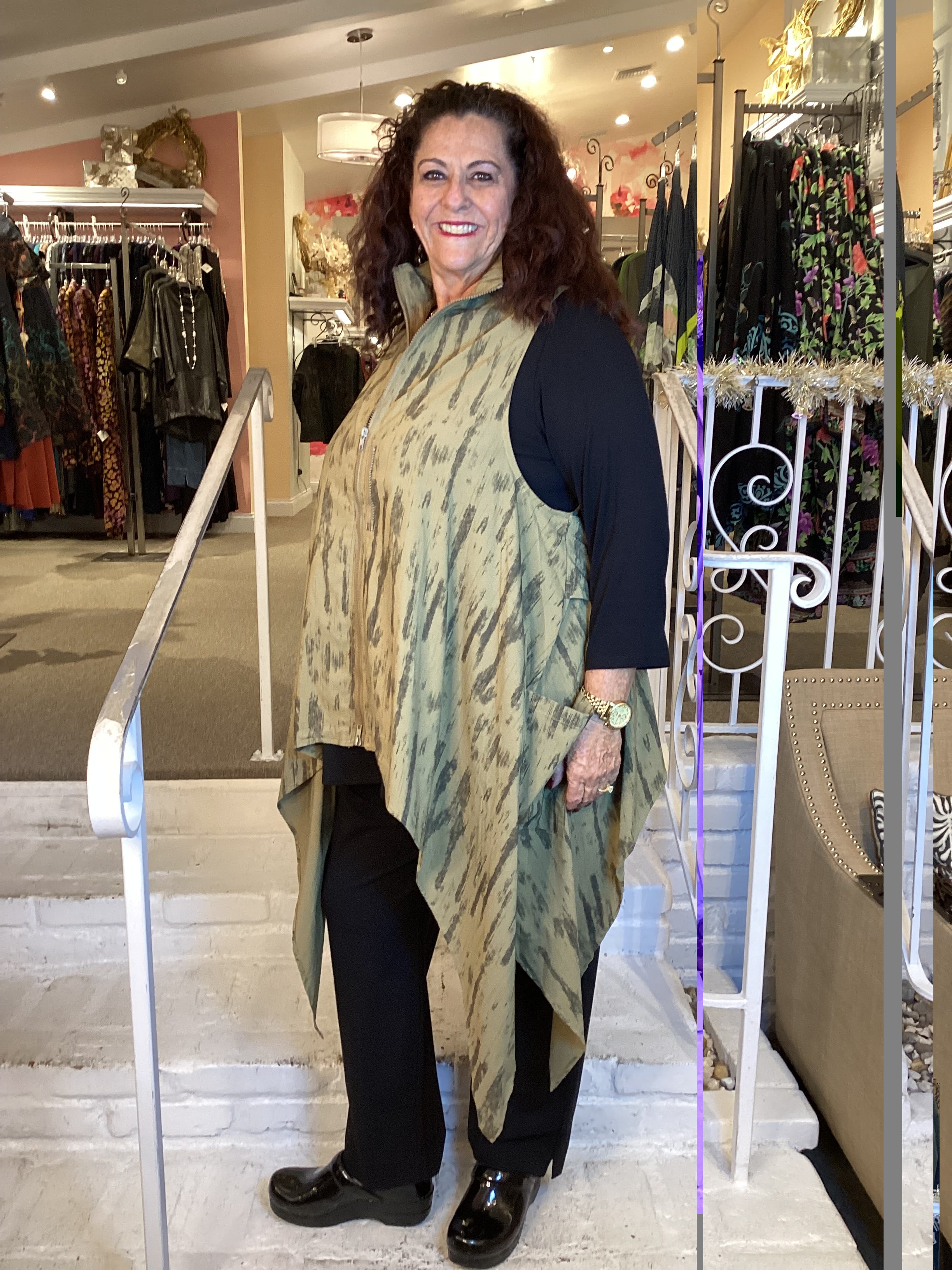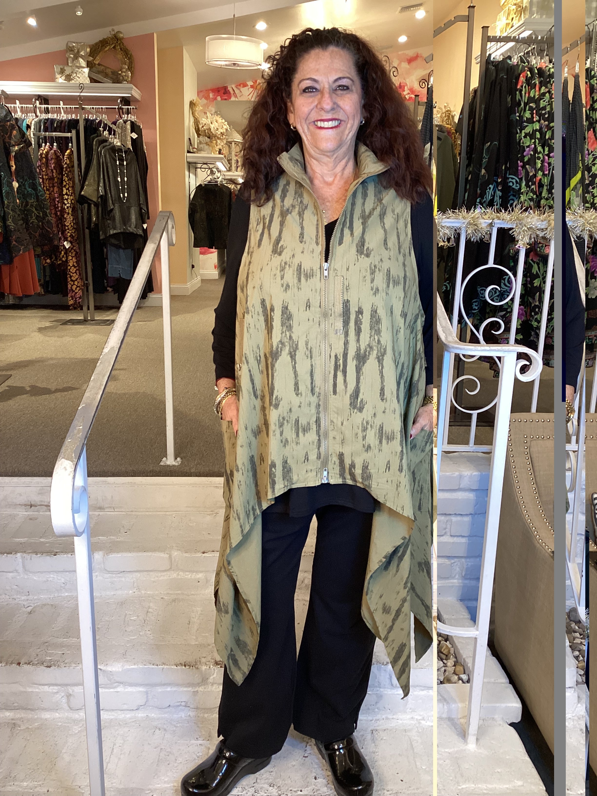 Slick stretch fabric makes this vest fun and comfortable with a zipper front, a-line shape, and exaggerated shark bite hem. The bust measures about 52", the center length is 28" with the sides dropping about 16" more.