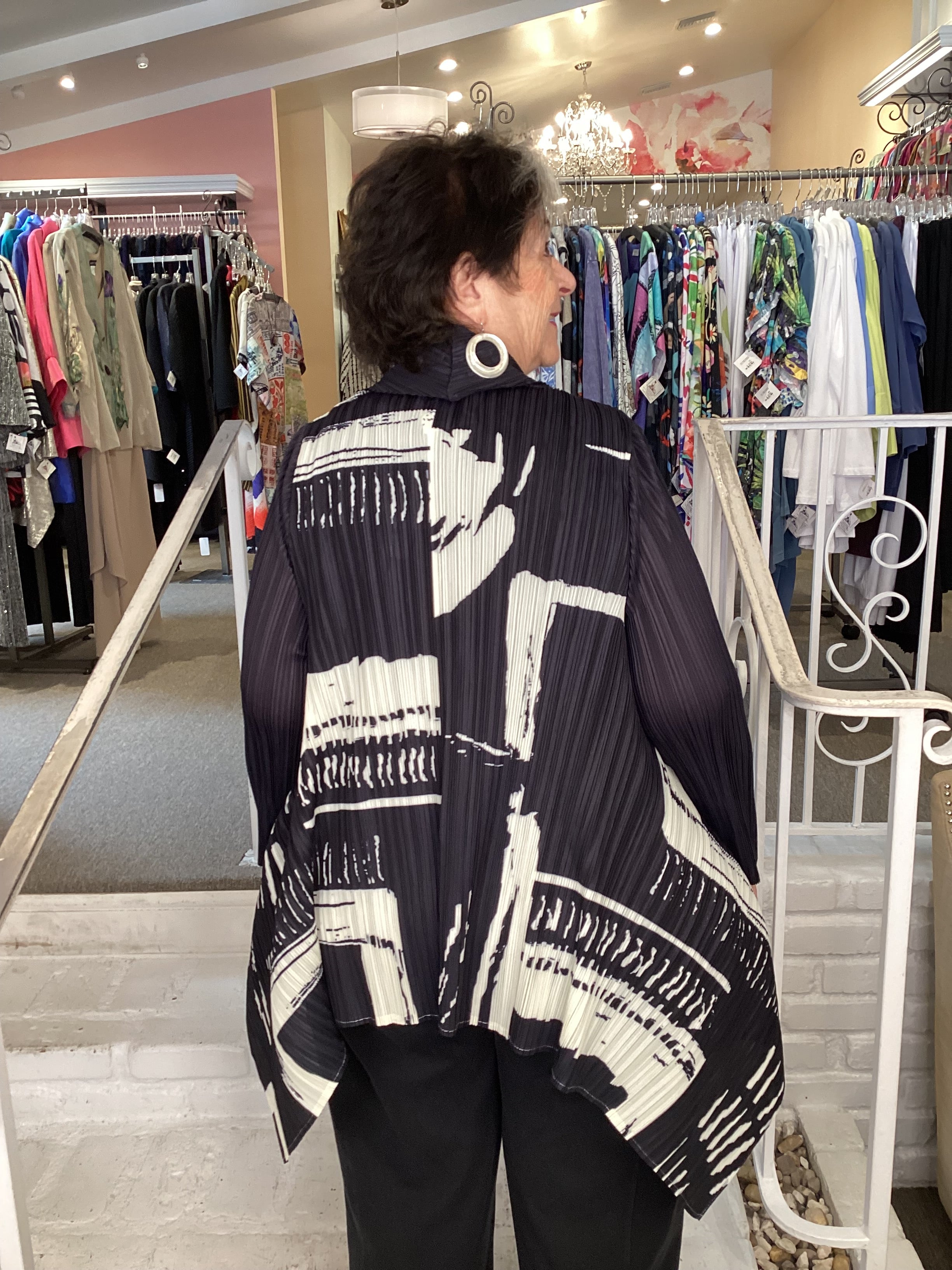 This open-front duster is crafted from beautifully pleated Fortuny-style fabric that adds texture and charm to your look. Designed with long sleeves and a cozy shawl collar, it offers both comfort and style. The roomy A-line silhouette gently flares out, extending longer in the front with eye-catching pointed panels that bring a playful, chic touch. Perfect for layering over your favorite outfits, this duster effortlessly elevates your style while keeping you cozy and confident throughout the day.
