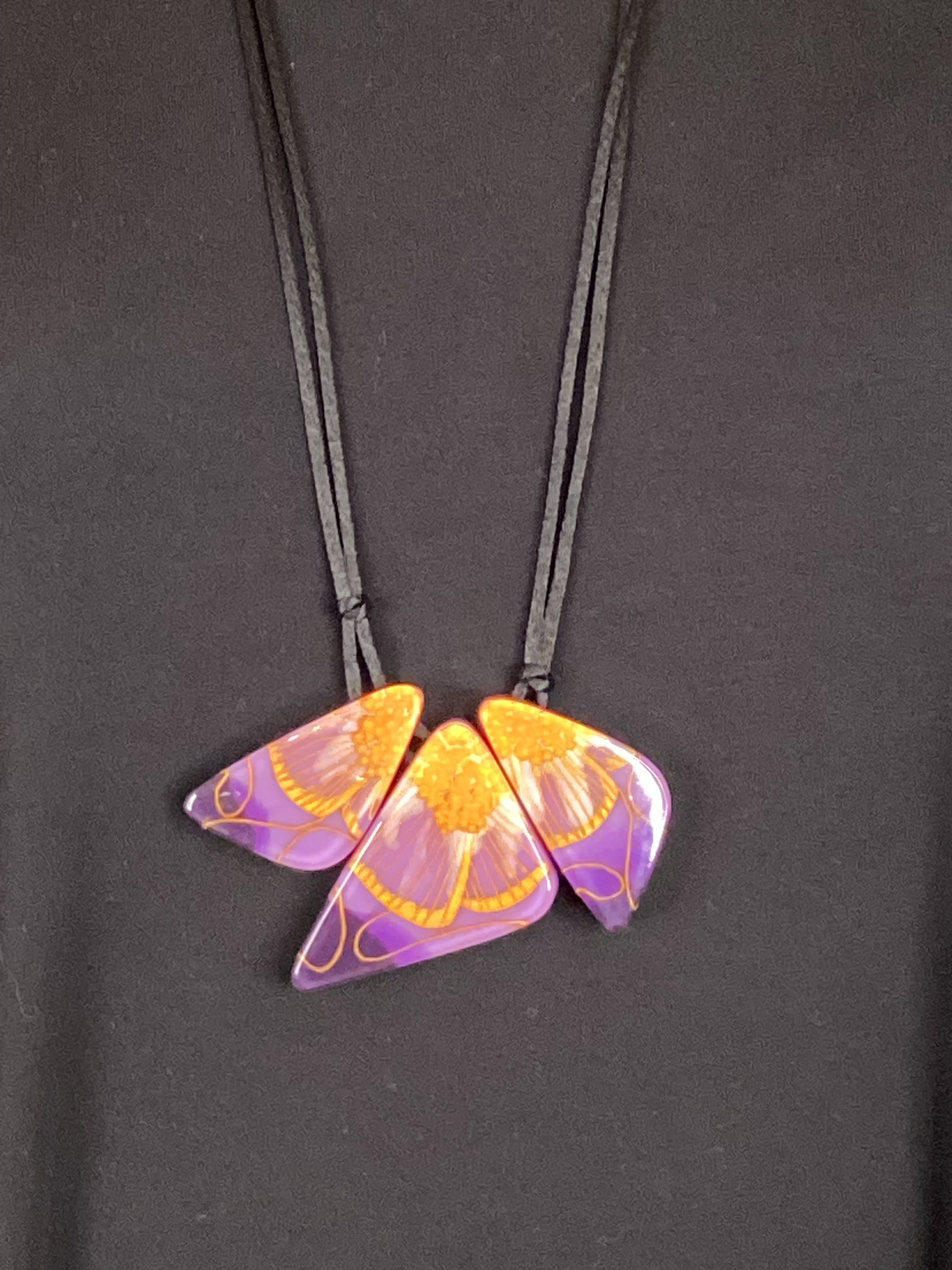Wear a wearable work of art with this enchanting floral pendant showcasing lavender, purple, and orange hues preserved in crystal-clear Lucite. It's the perfect way to keep botanical beauty right at your fingertips.